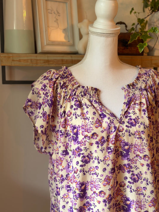 Blouse d'été à effet drapé et motifs fleuris T.38