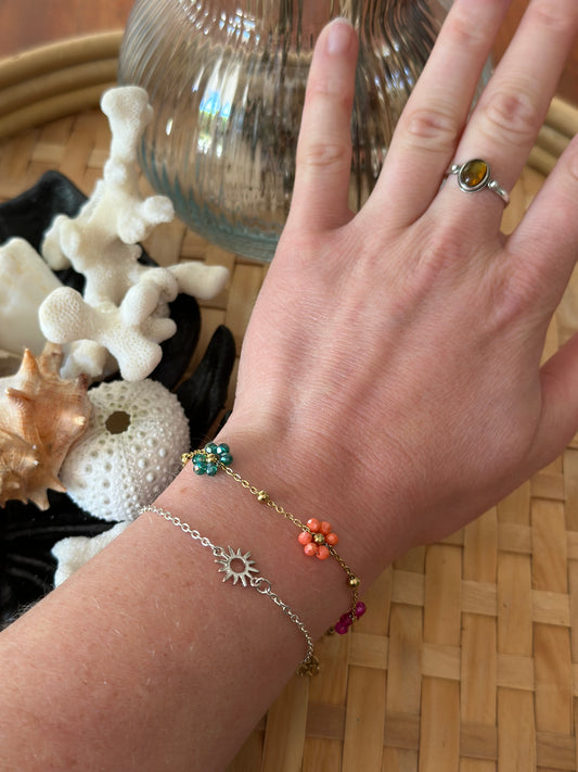 Bracelet en acier inoxydable doré, marguerites en pierres colorées