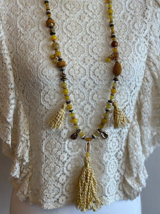 Collier sautoir bohème perles jaunes et coquillages dorés