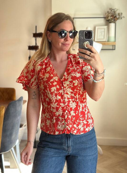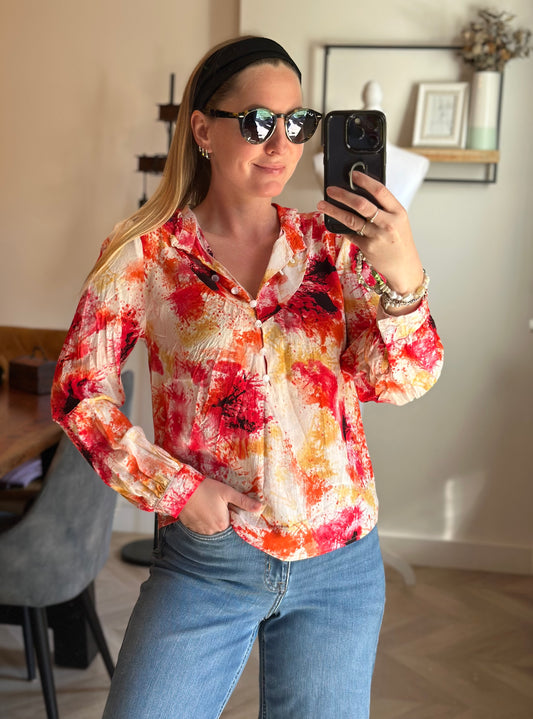 Blouse imprimé abstrait rouge orange fluide viscose manches longues T.38