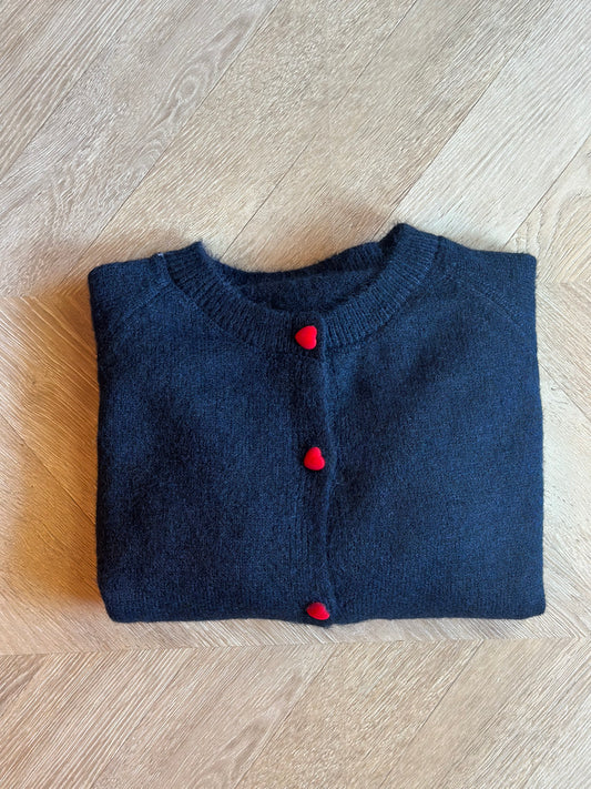 Cardigan marine en maille laine, boutons cœur rouge, T.U
