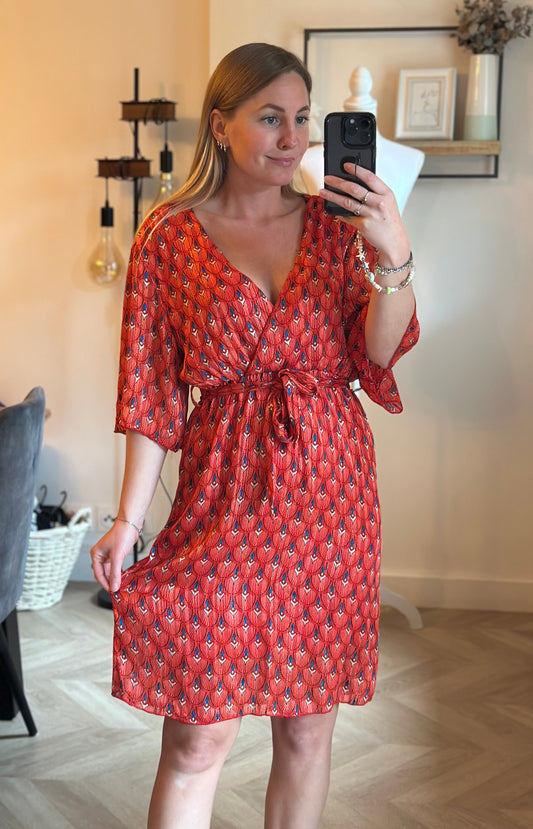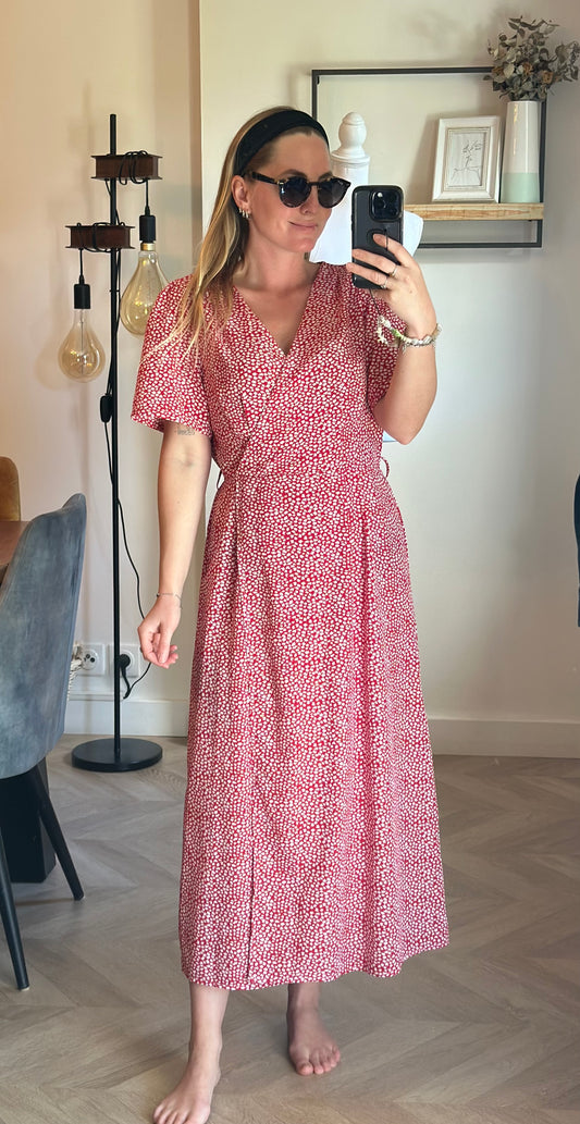 Robe longue fluide imprimé rouge et blanc col cache-cœur T.38/40