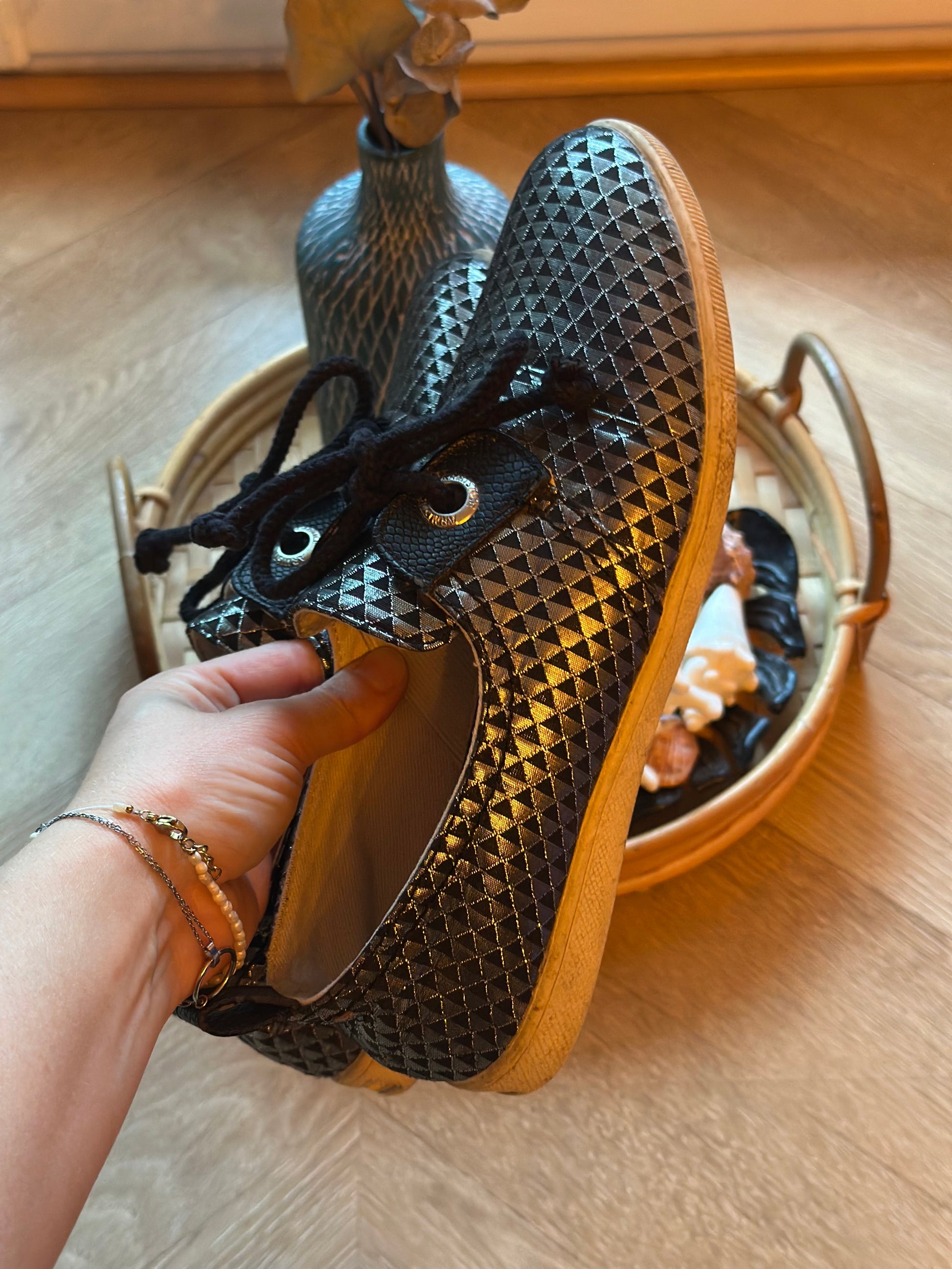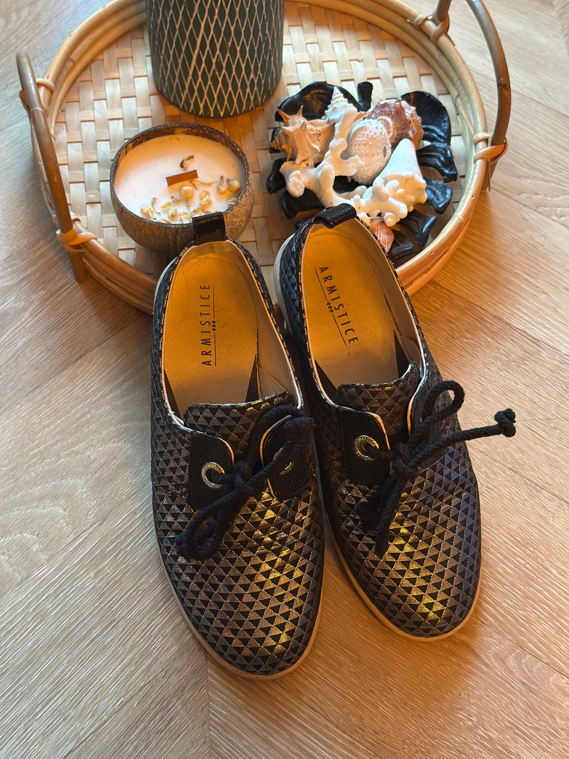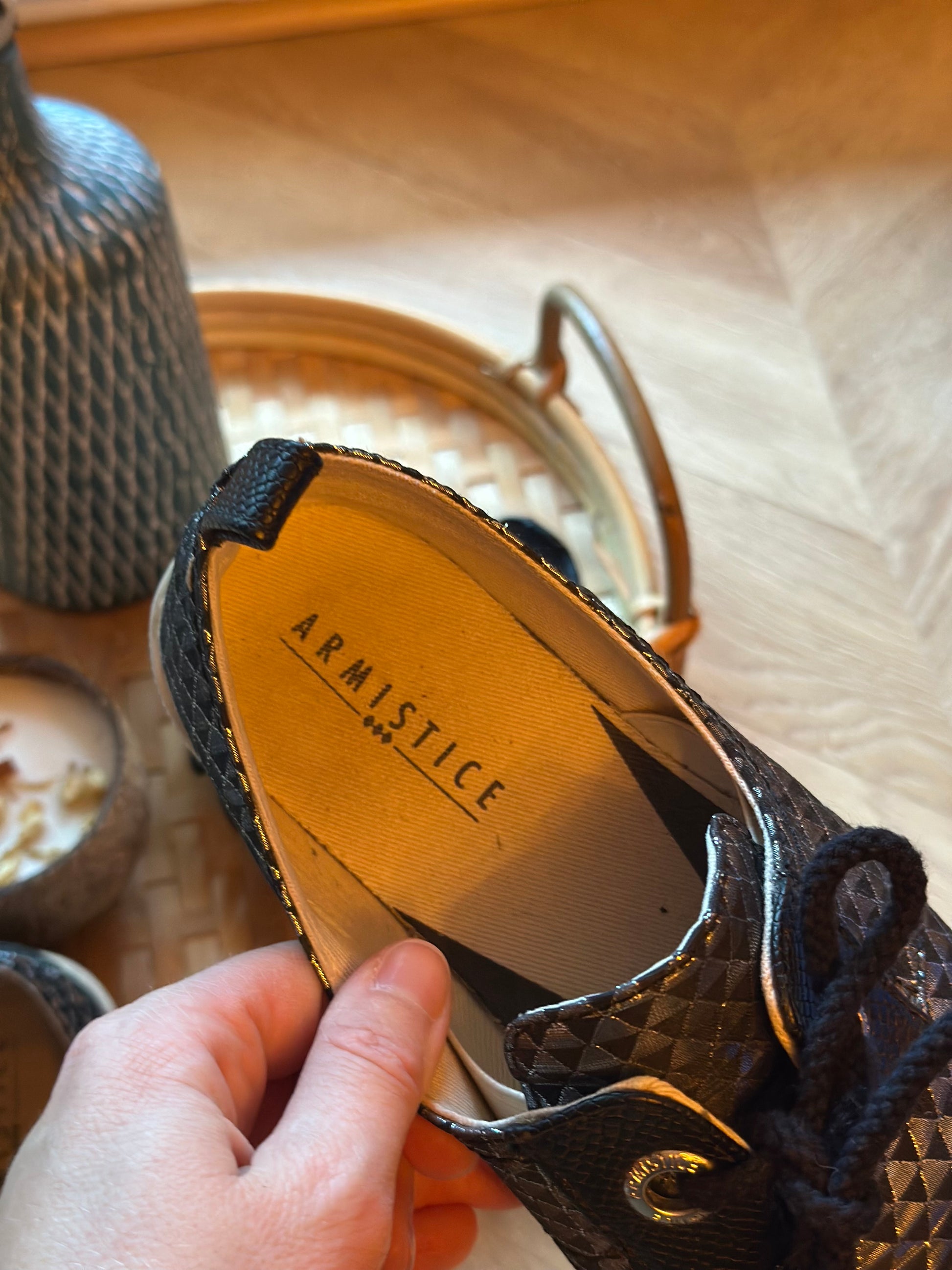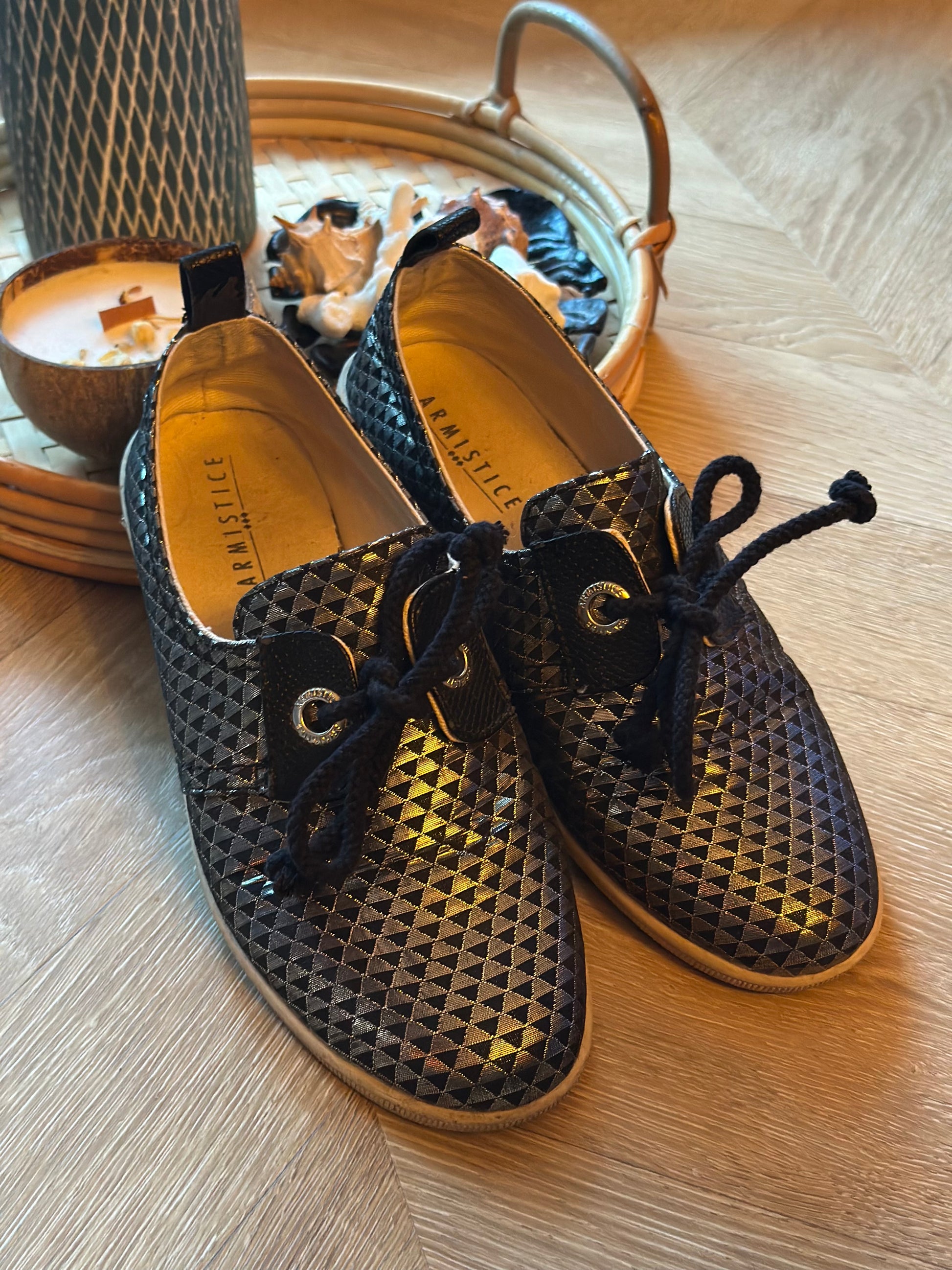 Derbies Armistice à imprimé géométrique noir et argent, lacets épais signature de la marque et œillets métalliques. Modèle confortable, léger et souple, idéal pour apporter une touche chic et originale à une tenue casual ou pour les fêtes. Intérieur textile agréable, semelle confortable, forme arrondie, taille bien. Déjà portées mais en très bon état général, pas de défaut structurel, seulement micro-traces d’usage normales. Valeur neuve estimée env. 85–95€.
