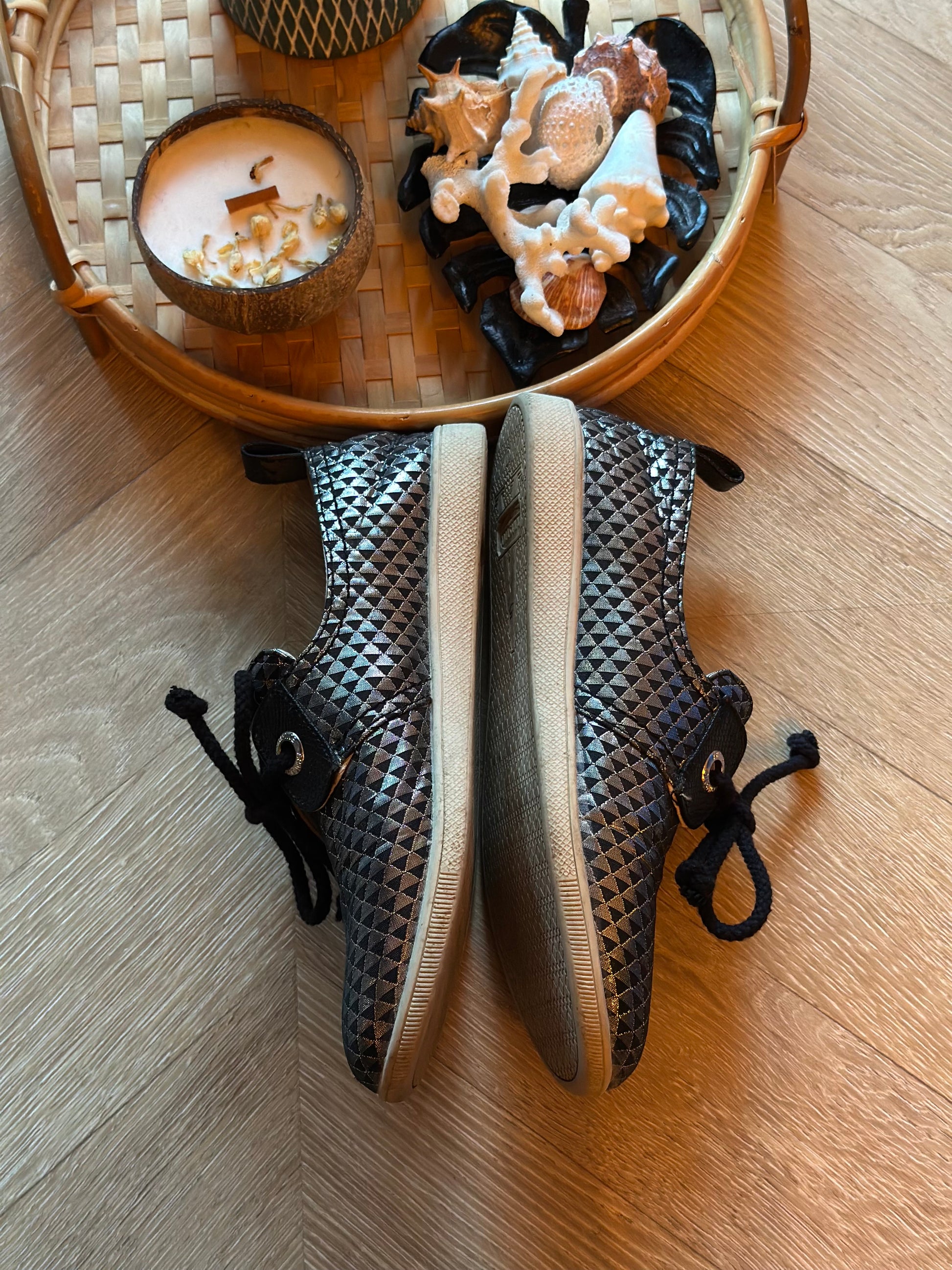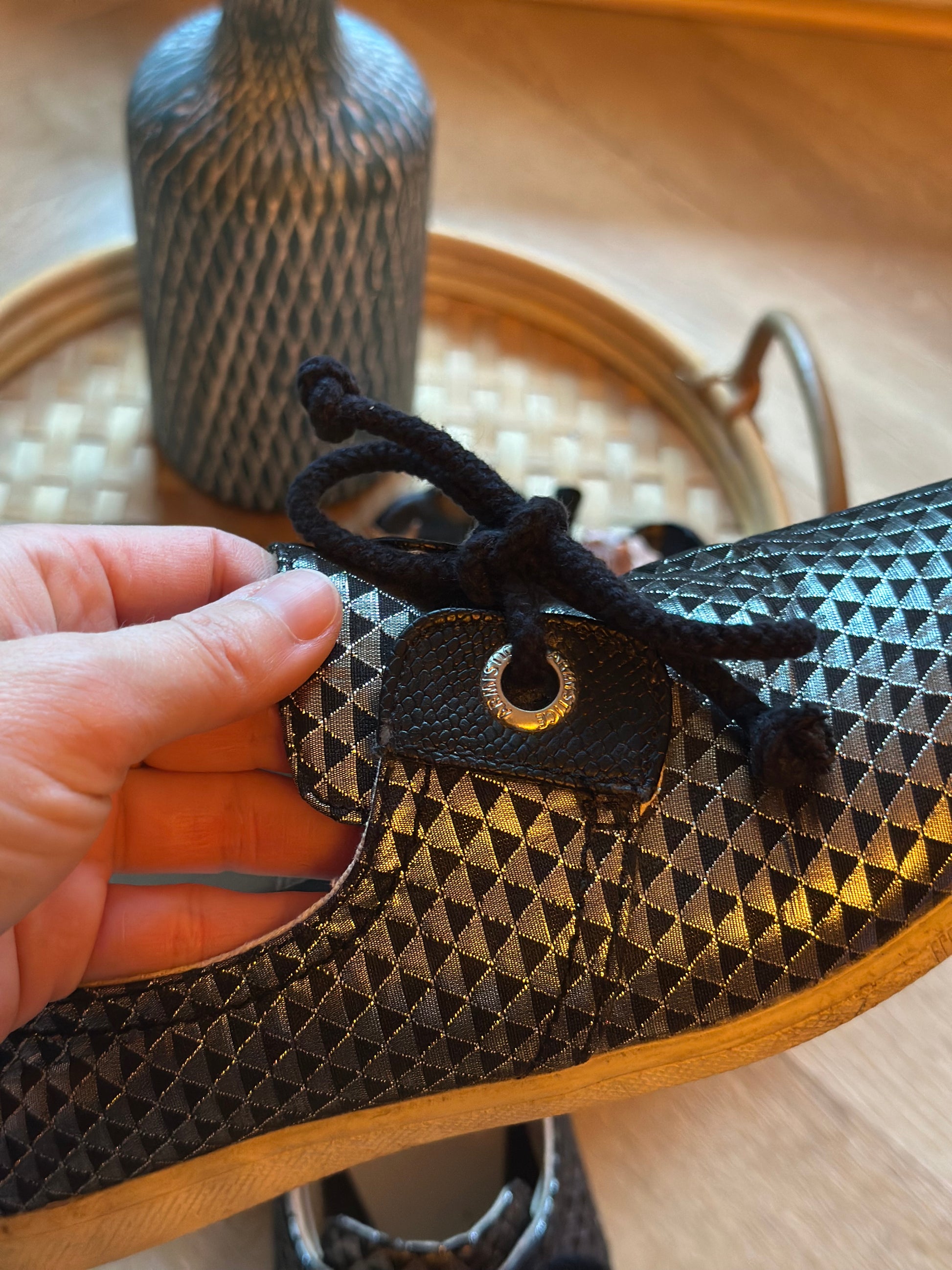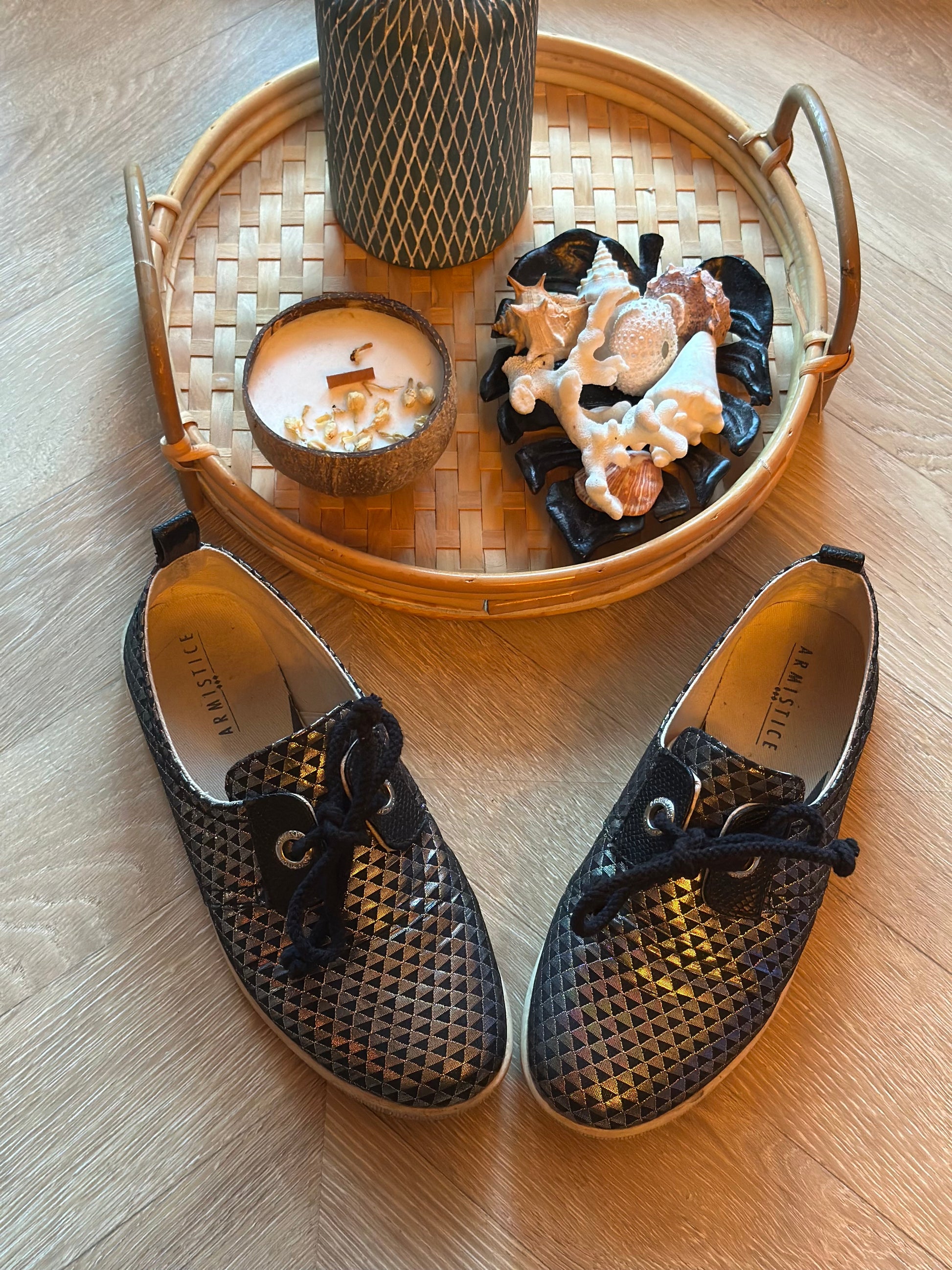 Derbies Armistice à imprimé géométrique noir et argent, lacets épais signature de la marque et œillets métalliques. Modèle confortable, léger et souple, idéal pour apporter une touche chic et originale à une tenue casual ou pour les fêtes. Intérieur textile agréable, semelle confortable, forme arrondie, taille bien. Déjà portées mais en très bon état général, pas de défaut structurel, seulement micro-traces d’usage normales. Valeur neuve estimée env. 85–95€.