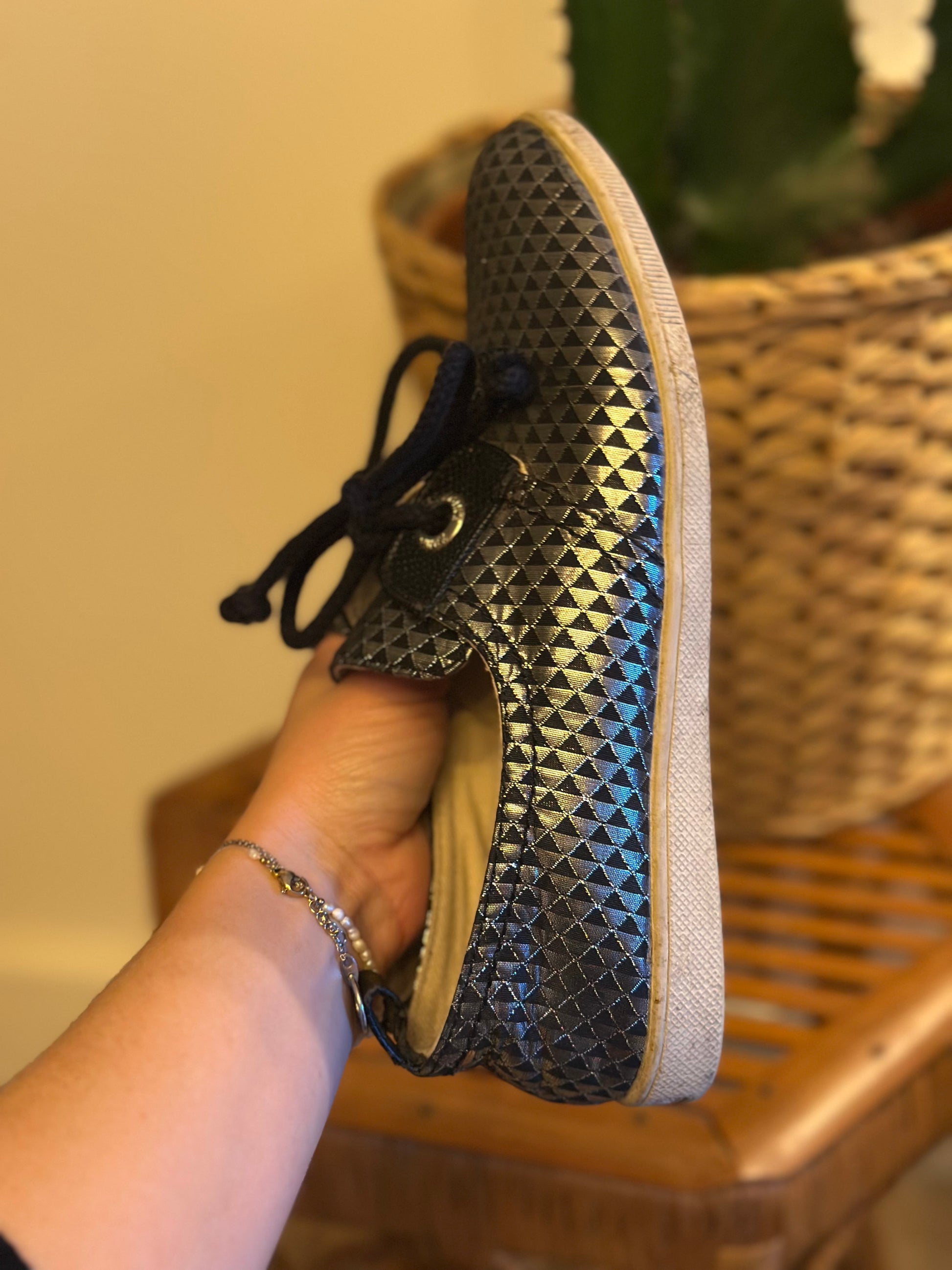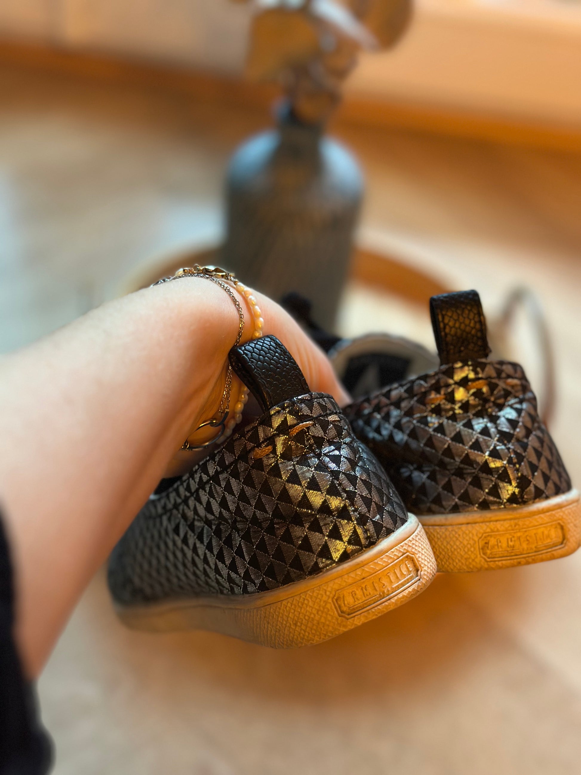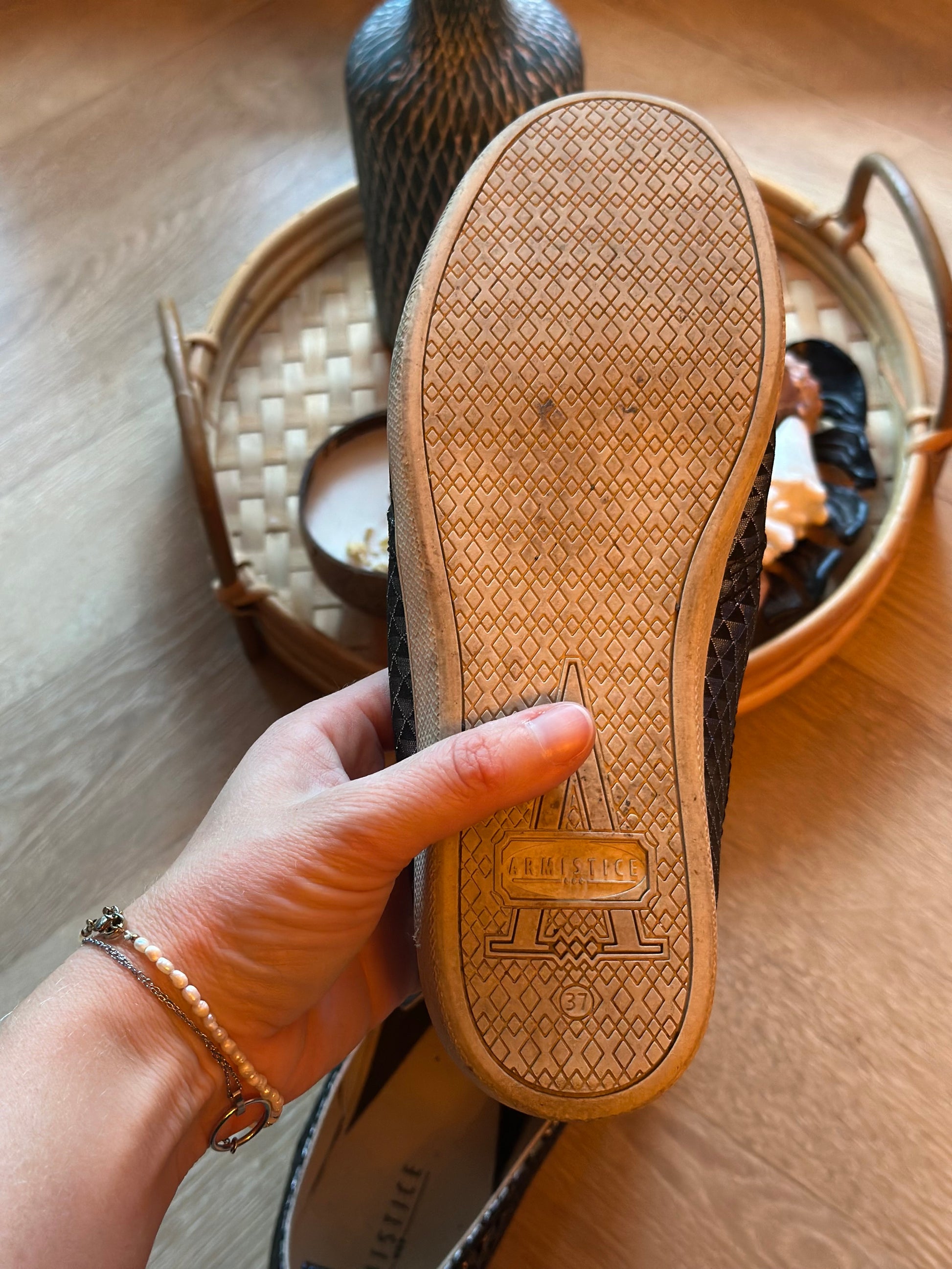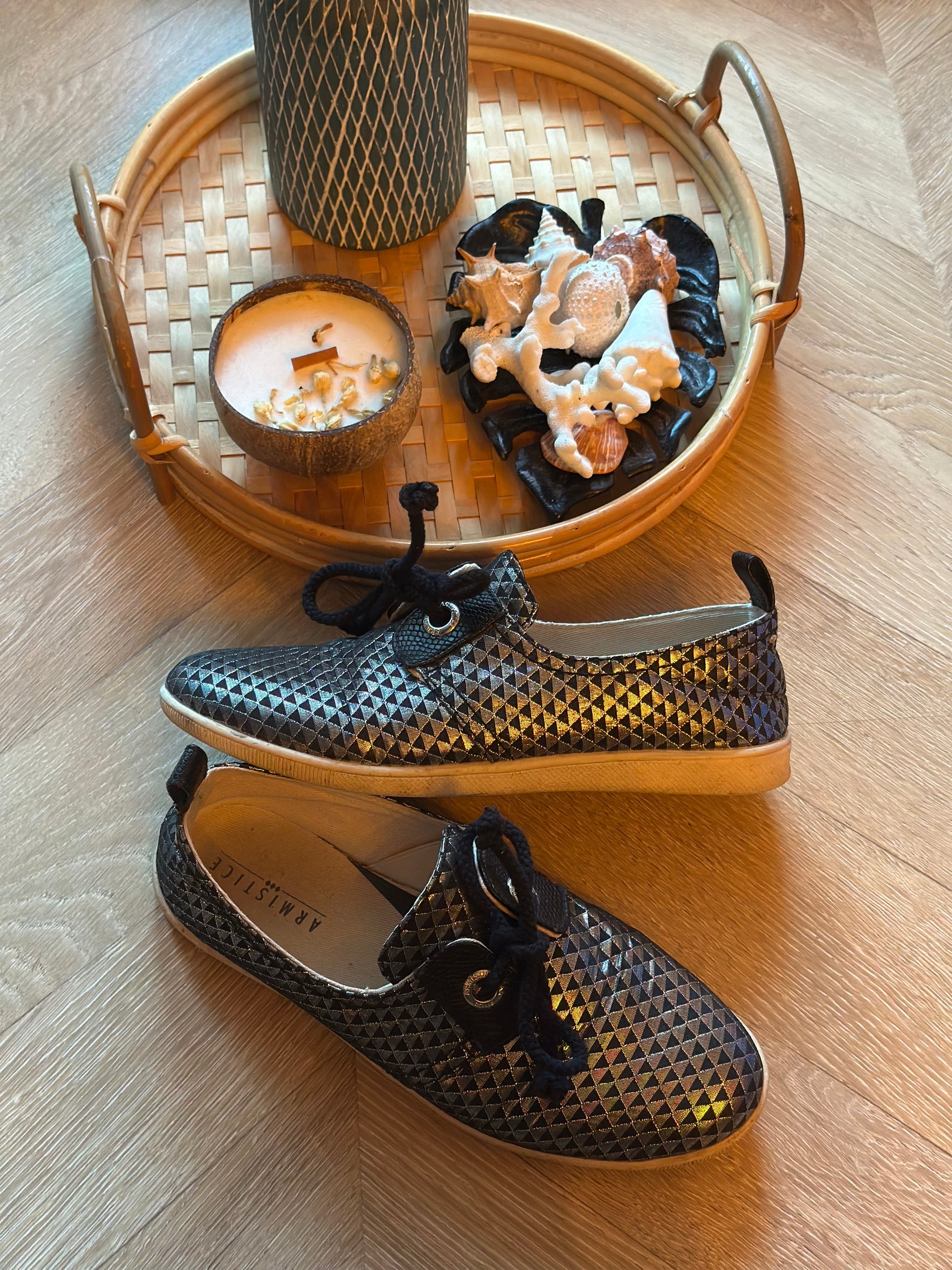 Derbies Armistice à imprimé géométrique noir et argent, lacets épais signature de la marque et œillets métalliques. Modèle confortable, léger et souple, idéal pour apporter une touche chic et originale à une tenue casual ou pour les fêtes. Intérieur textile agréable, semelle confortable, forme arrondie, taille bien. Déjà portées mais en très bon état général, pas de défaut structurel, seulement micro-traces d’usage normales. Valeur neuve estimée env. 85–95€.