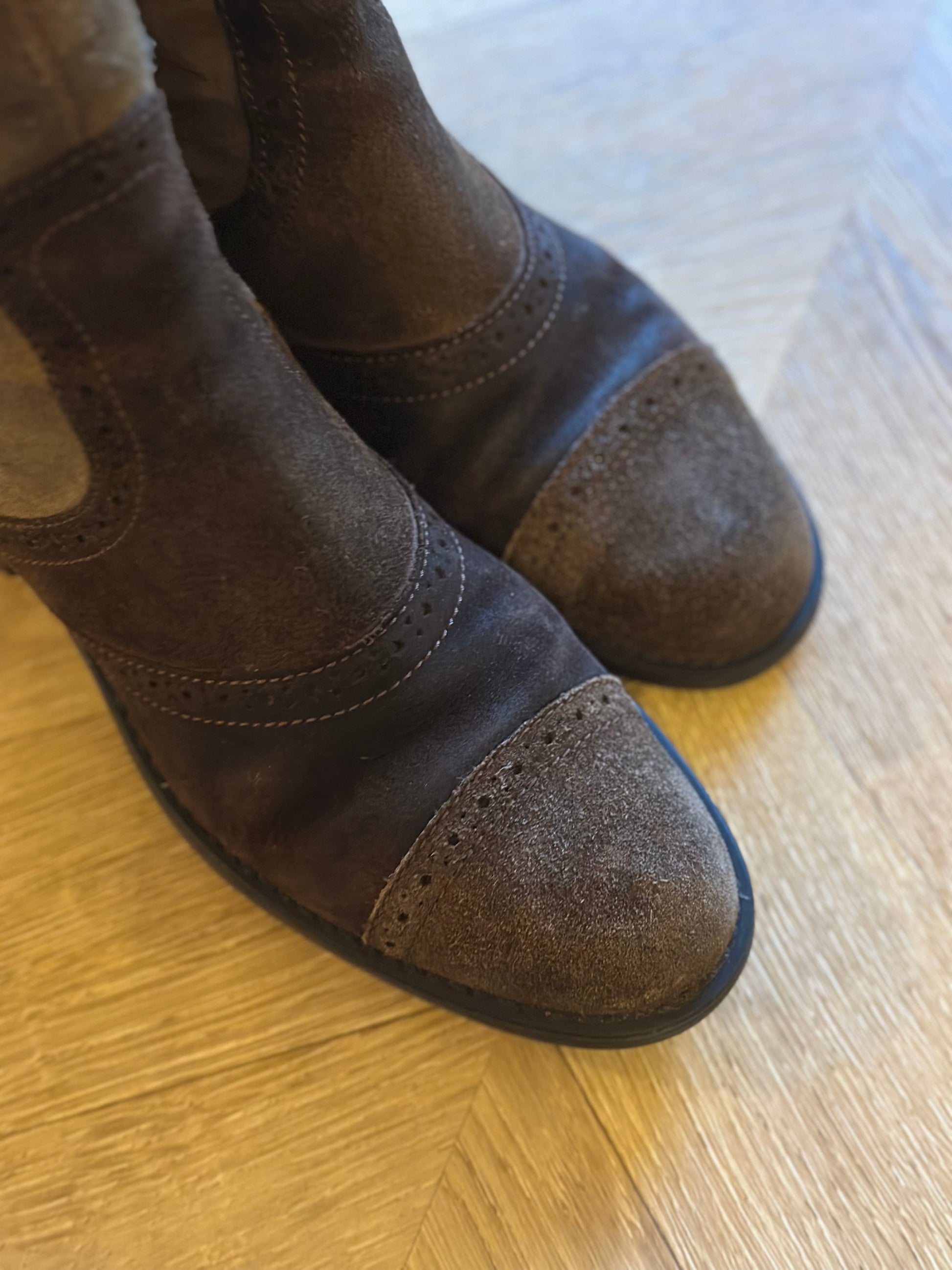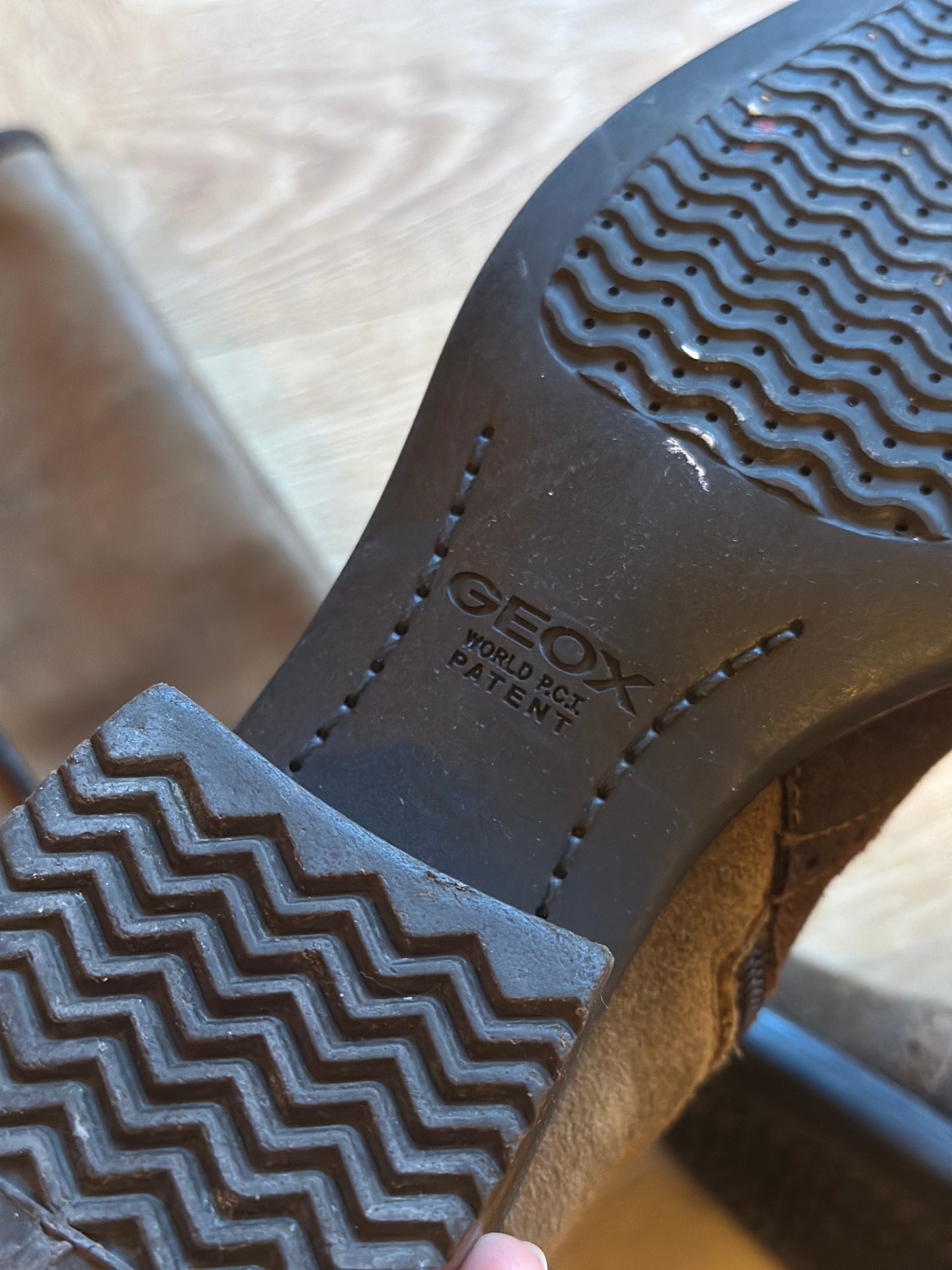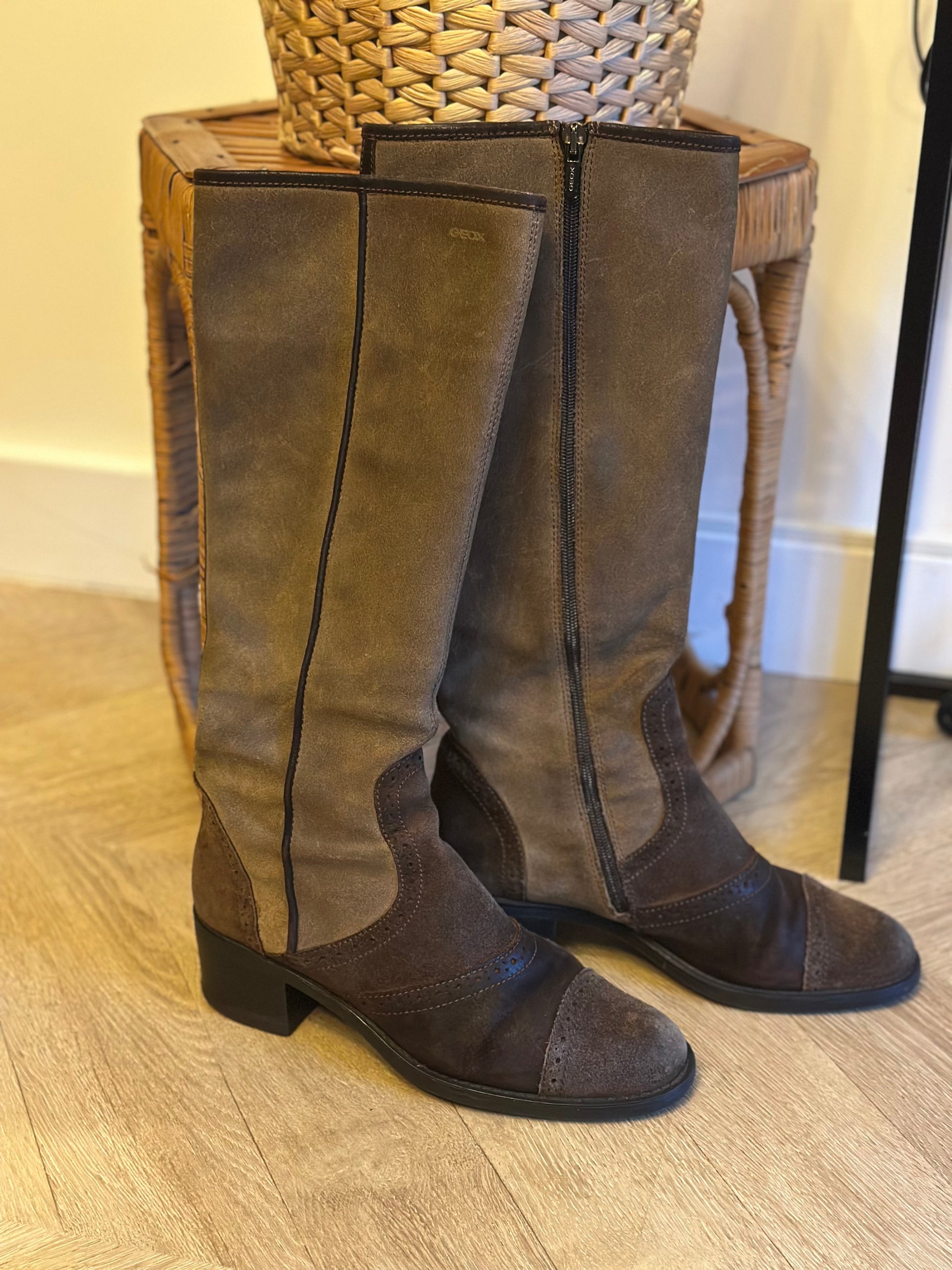 Superbes bottes Geox en cuir daim suédé marron et camel, modèle chic et confortable avec fermeture éclair latérale. Talon large de 5 cm et tige haute de 40 cm pour un maintien élégant et une allure féminine. Coupe droite, semelle antidérapante brevetée Geox. Style intemporel, parfait avec une jupe ou un jean. Très bon état général, peu portées. Prix d’achat : 195 €.