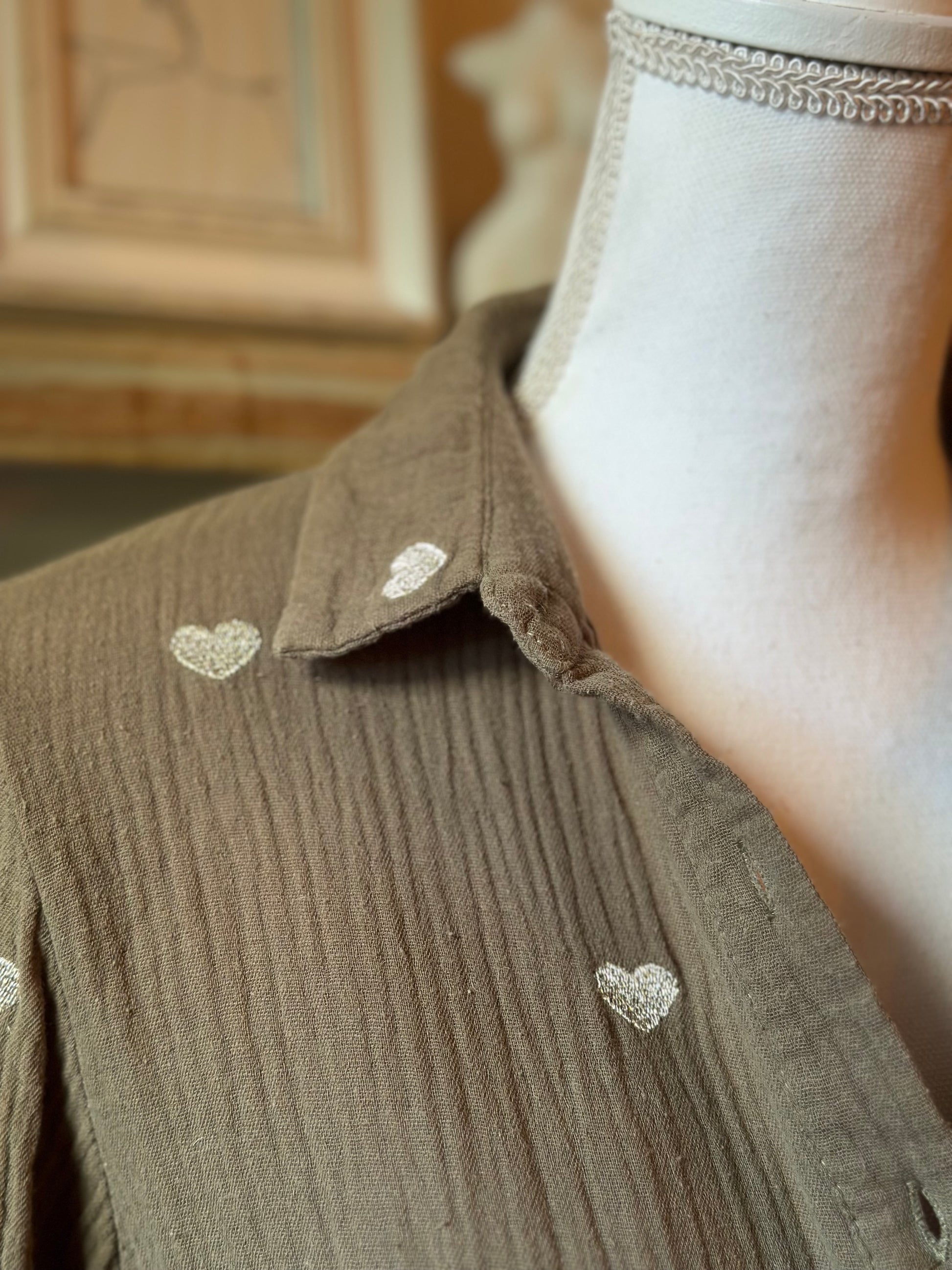 Chemise à motifs cœurs en gaze de coton kaki T.36