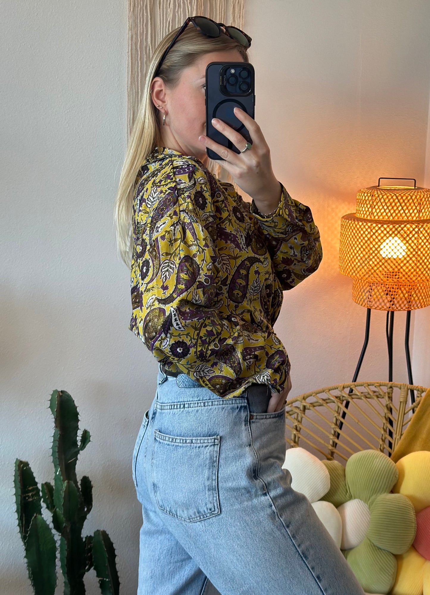 Superbe blouse chemise neuve avec étiquette. Elle arbore un joli imprimé brillant en jaune et violet avec des motifs cachemire/paisley. La taille XS est bien ajustée.