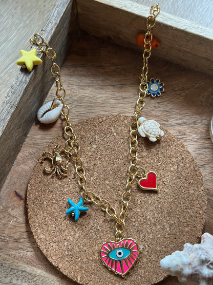 Détails du collier : ✔ Matériau : Acier inoxydable (très tendance et durable) ✔ Longueur : 46 cm + 5 cm d’extension ✔ Pendentifs variés et colorés (coquillage, étoile de mer, cœur, œil porte-bonheur…) ✔ Neuf