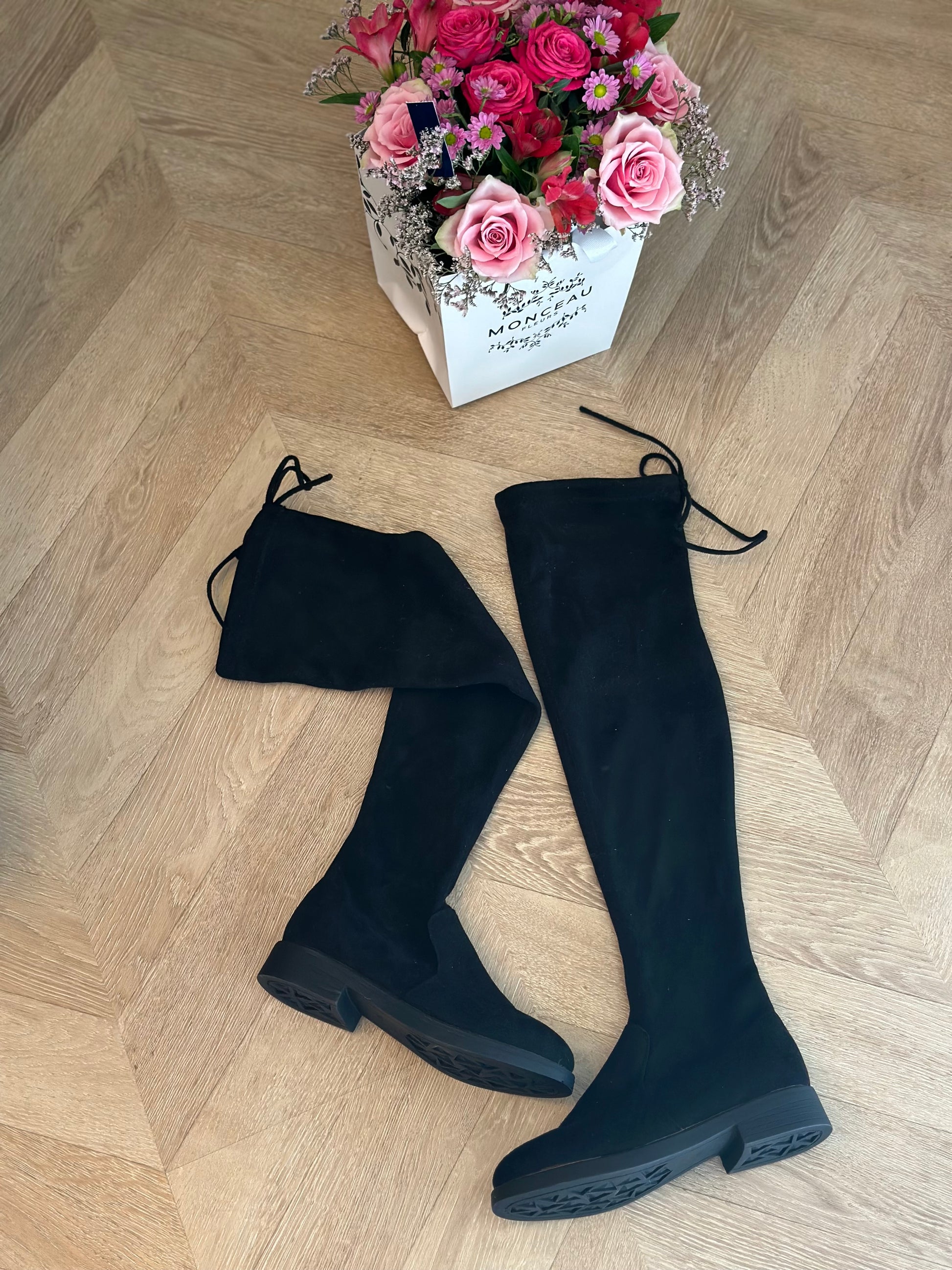 Cuissardes noires Besson neuves, matière douce effet velours. Modèle confortable avec talon épais de 3 cm et semelle stable. Hauteur totale de la botte : 58 cm. Lien ajustable à l’arrière pour un bon maintien sur la cuisse. Coupe près de la jambe, taille bien et très agréable à porter. Prix d’achat 59 €.