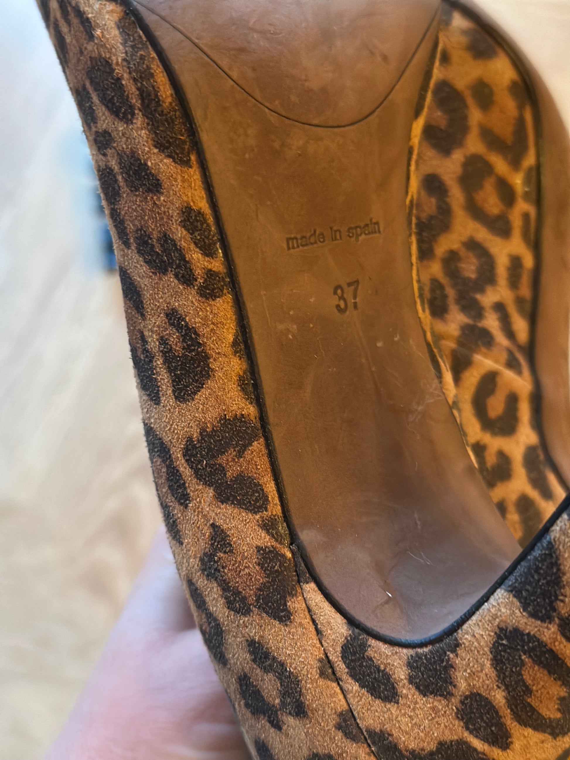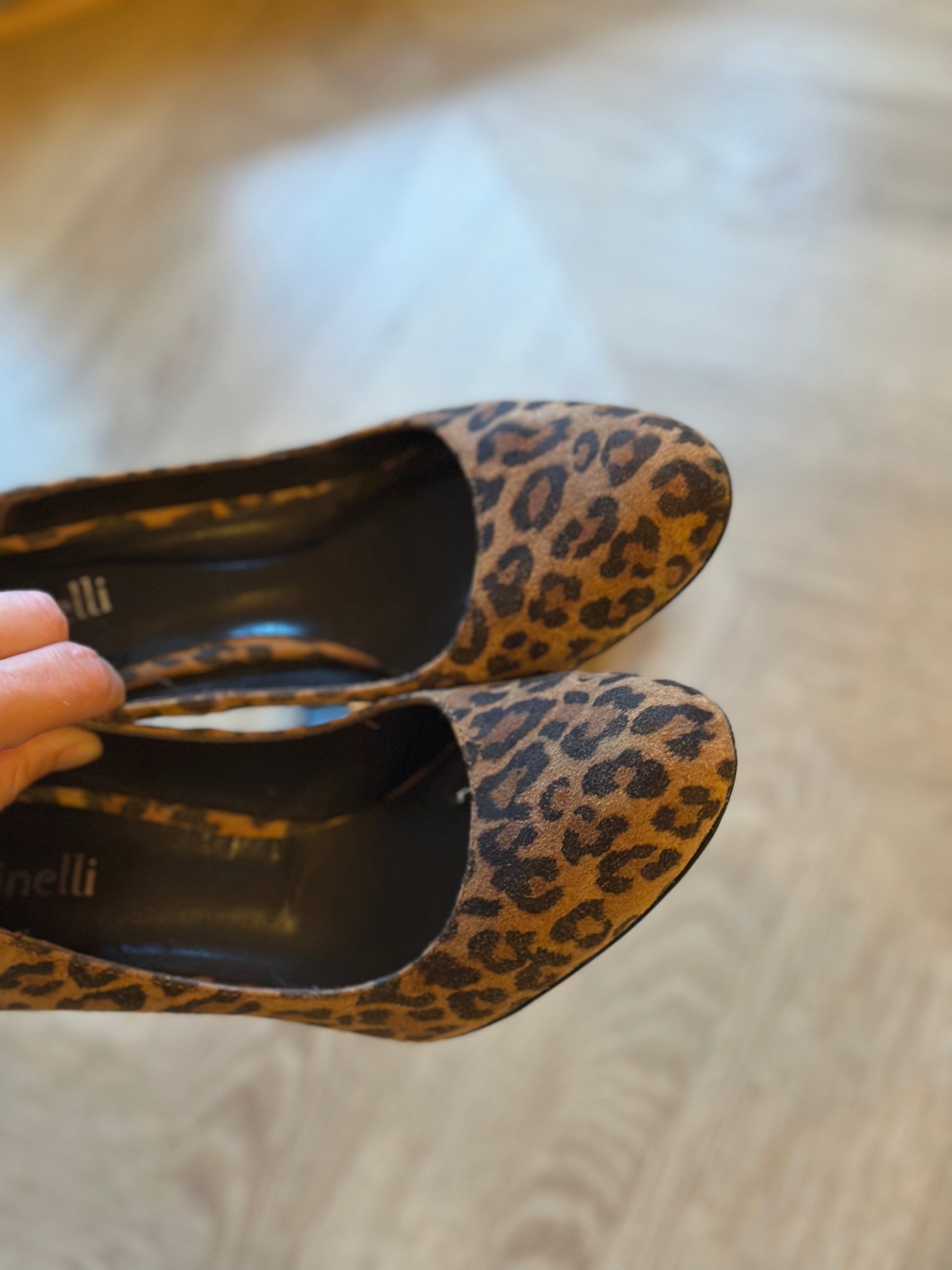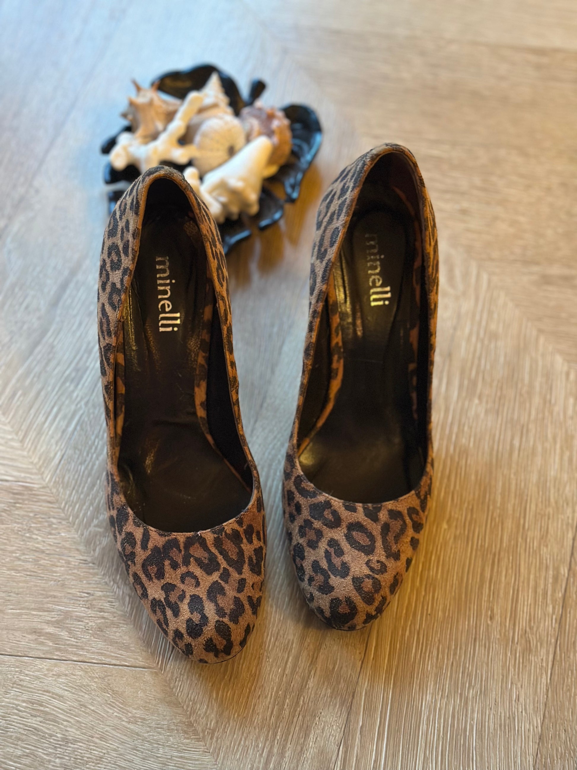 Élégants escarpins Minelli en cuir véritable imprimé léopard, fabriqués en Espagne. Coupe classique à bout arrondi et talon fin d’environ 8 cm, alliant confort et allure féminine. Style chic intemporel, idéal pour une tenue habillée ou un jean ajusté. Très bon état, peu portés.