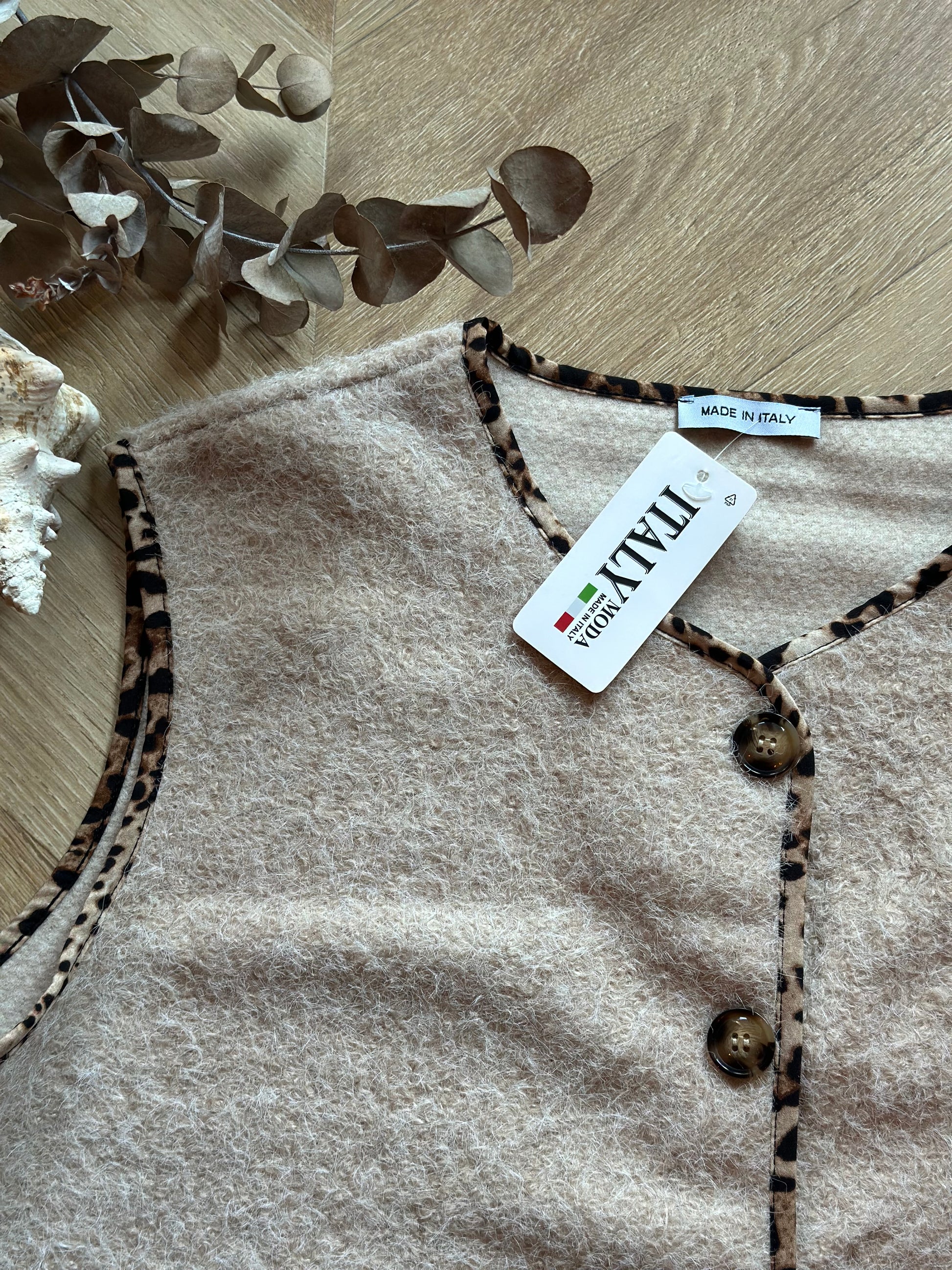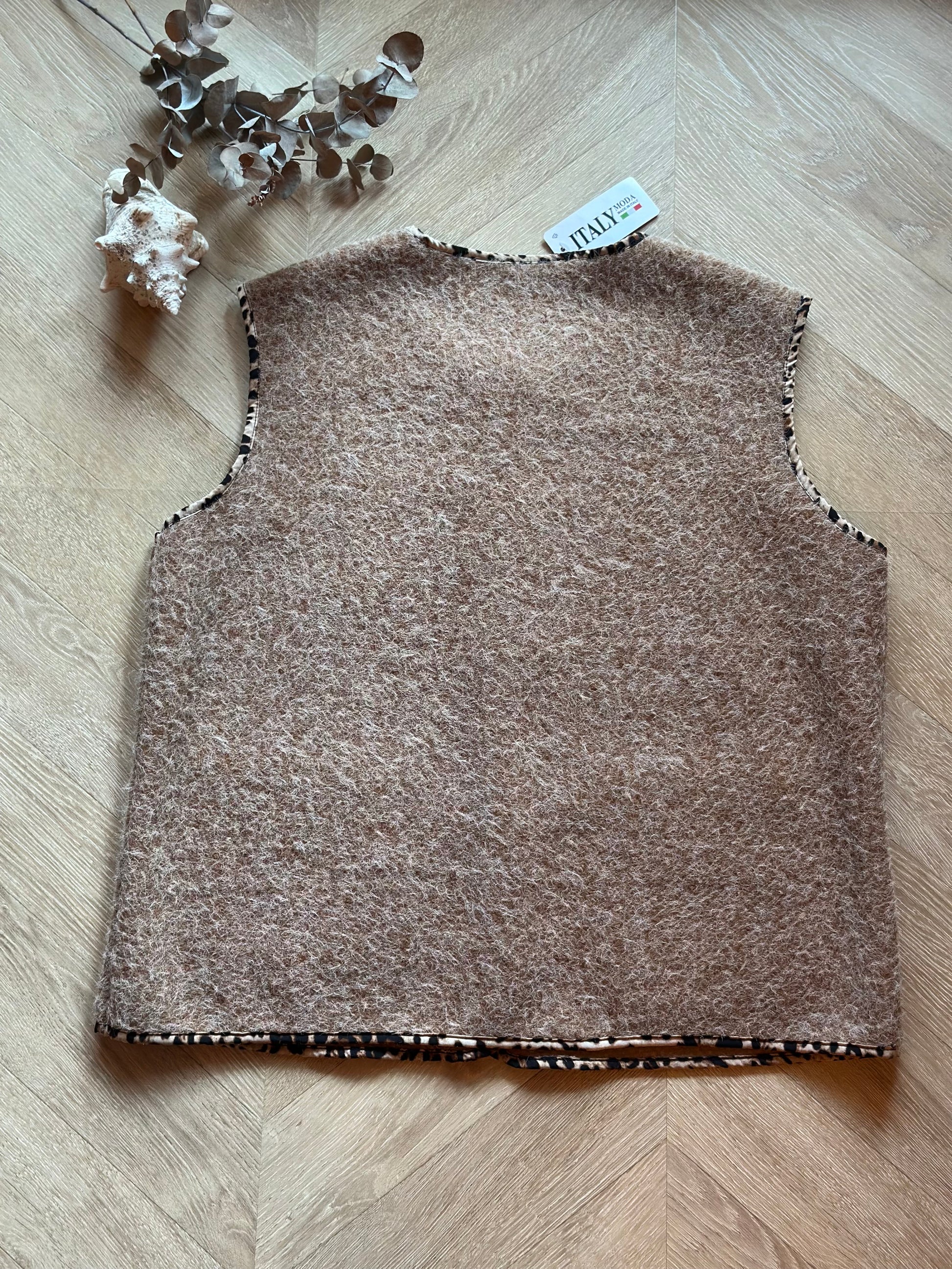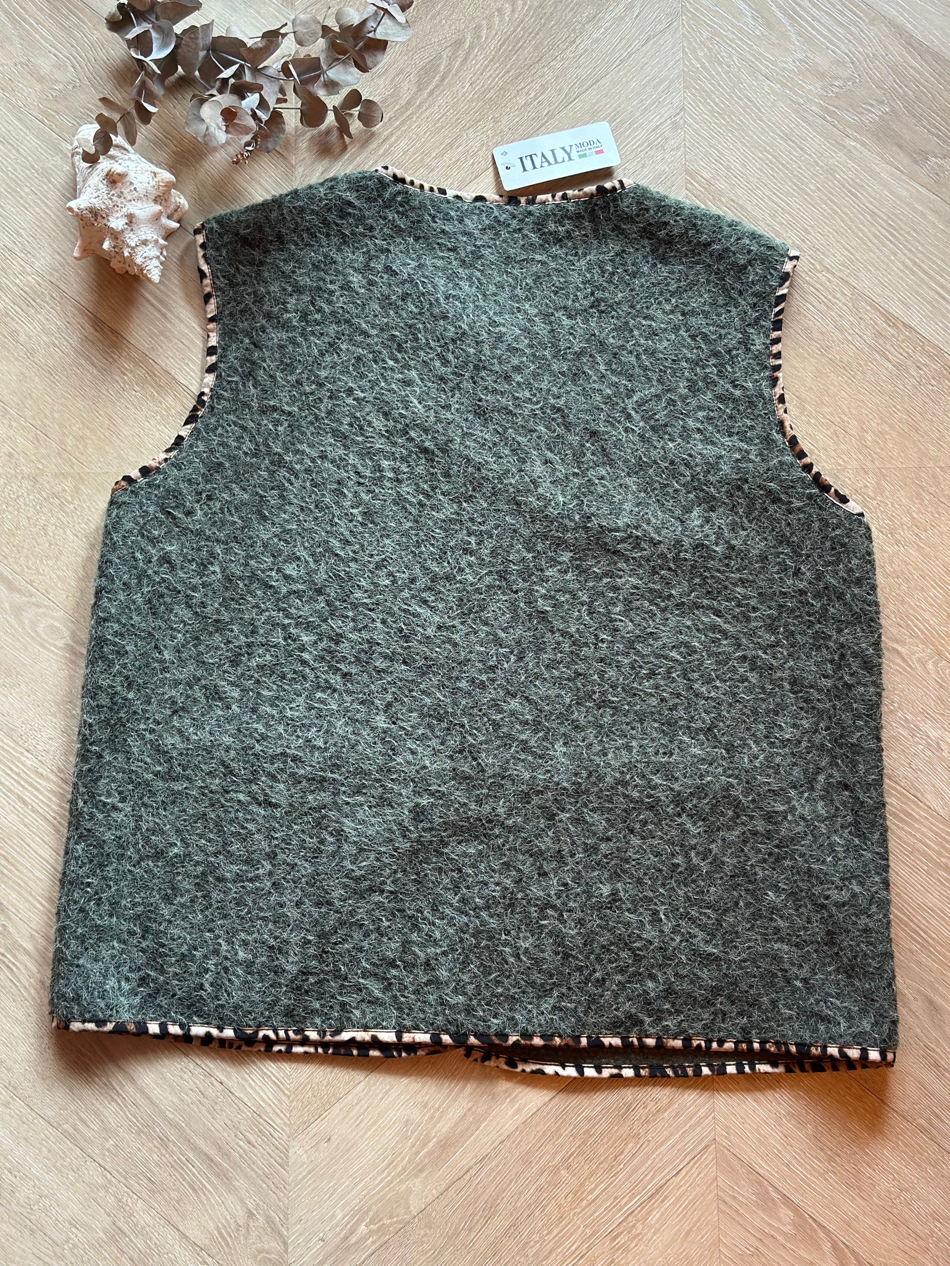 Gilet sans manches à col arrondi, fermeture boutonnée sur le devant et deux poches plaquées, finitions contrastées à imprimé léopard sur le col, les bordures et les poches ; coupe droite et légèrement ample, longueur classique, agréable à porter ouvert ou fermé, facile à superposer sur un pull, une maille fine ou une chemise, rendu casual chic avec une touche tendance ; matière douce et confortable (50% polyester, 45% viscose, 5% élasthanne), fabrication italienne ; neuf avec étiquette, taille U qui taille bien et convient d’un 36 à un 44/46, longueur 62 cm, largeur aisselle à plat 57 cm.