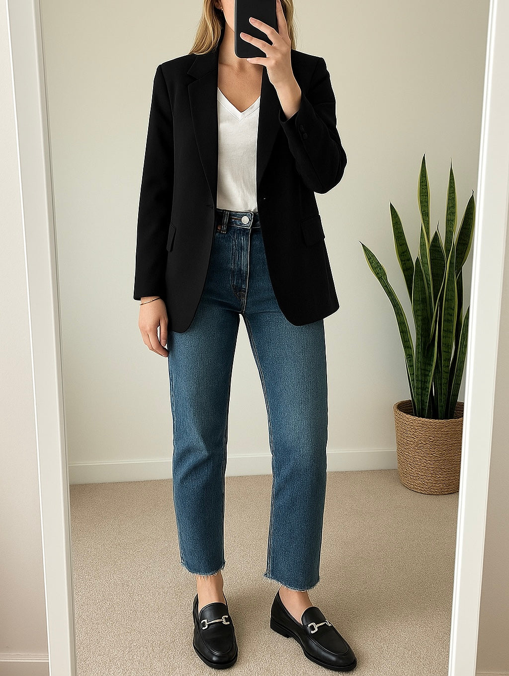 Jean droit coupe taille haute, longueur chevilles, bas effilochés. Denim 100% coton (belle tenue, pas stretch), bouton métal et passants pour ceinture, style casual et moderne, parfait avec baskets ou bottines. Coupe droite qui tombe bien, rendu authentique type jean rigide vintage. Parfait état, taille bien.