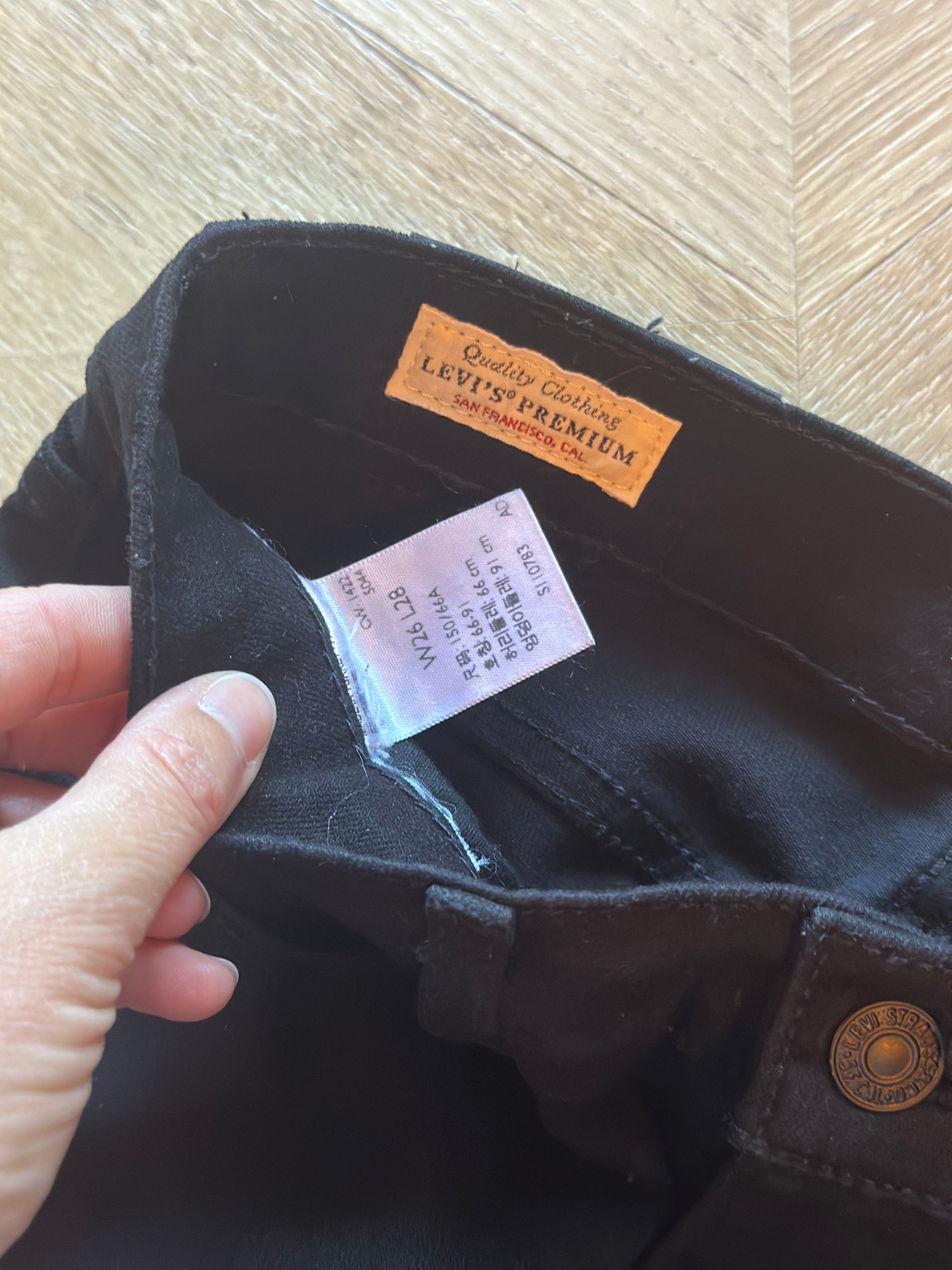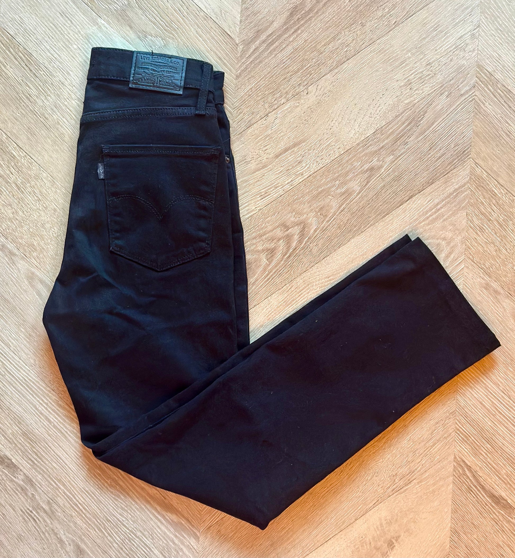 Jean Levi’s Premium modèle 724, coupe droite taille haute. Coloris noir, 5 poches, fermeture zippée et bouton métallique siglé. Longueur jambe env. 90 cm, largeur bas env. 17 cm. En coton mélangé avec une légère élasticité pour le confort. Taille 26, correspond à un 34 ok 34/36. Très bon état, sans défaut.