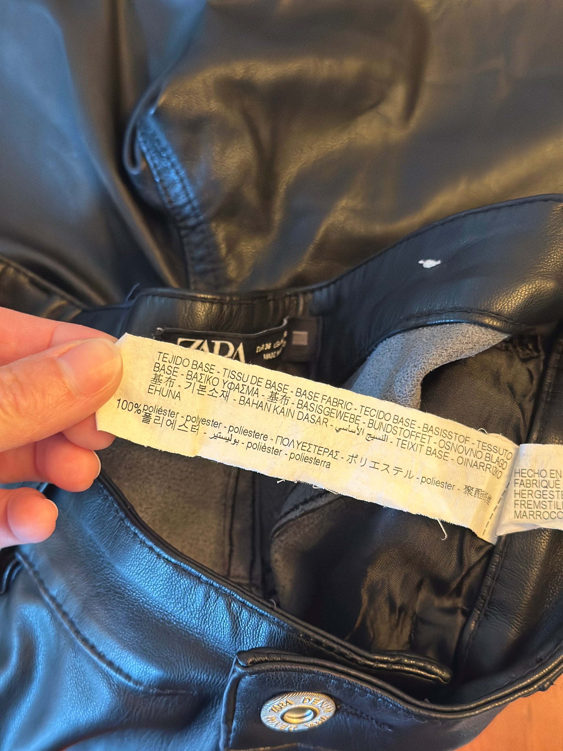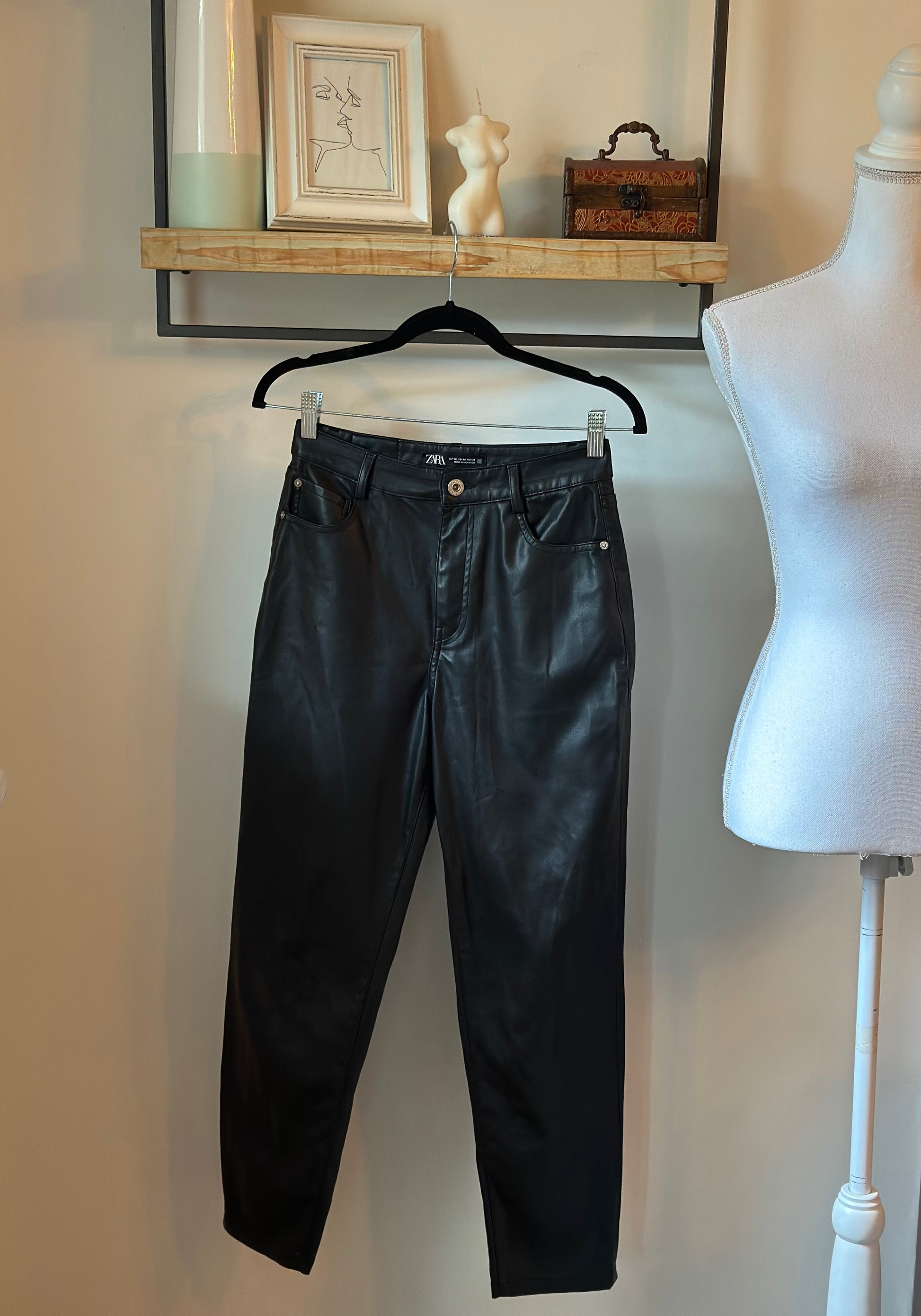 Pantalon ZARA en similicuir noir, coupe droite élégante et légèrement ajustée pour un tombé structuré et moderne. Matière douce effet cuir légèrement satiné sans brillance excessive, 100 % polyester. Taille standard, fermeture zippée et bouton doré gravé, poches avant et arrière. Se porte facilement avec une chemise blanche ou un pull pour un style chic et tendance. Longueur 95 cm, largeur cheville 16 cm. Très bon état, comme neuf, prix d’achat 39,99 €. Taille bien.