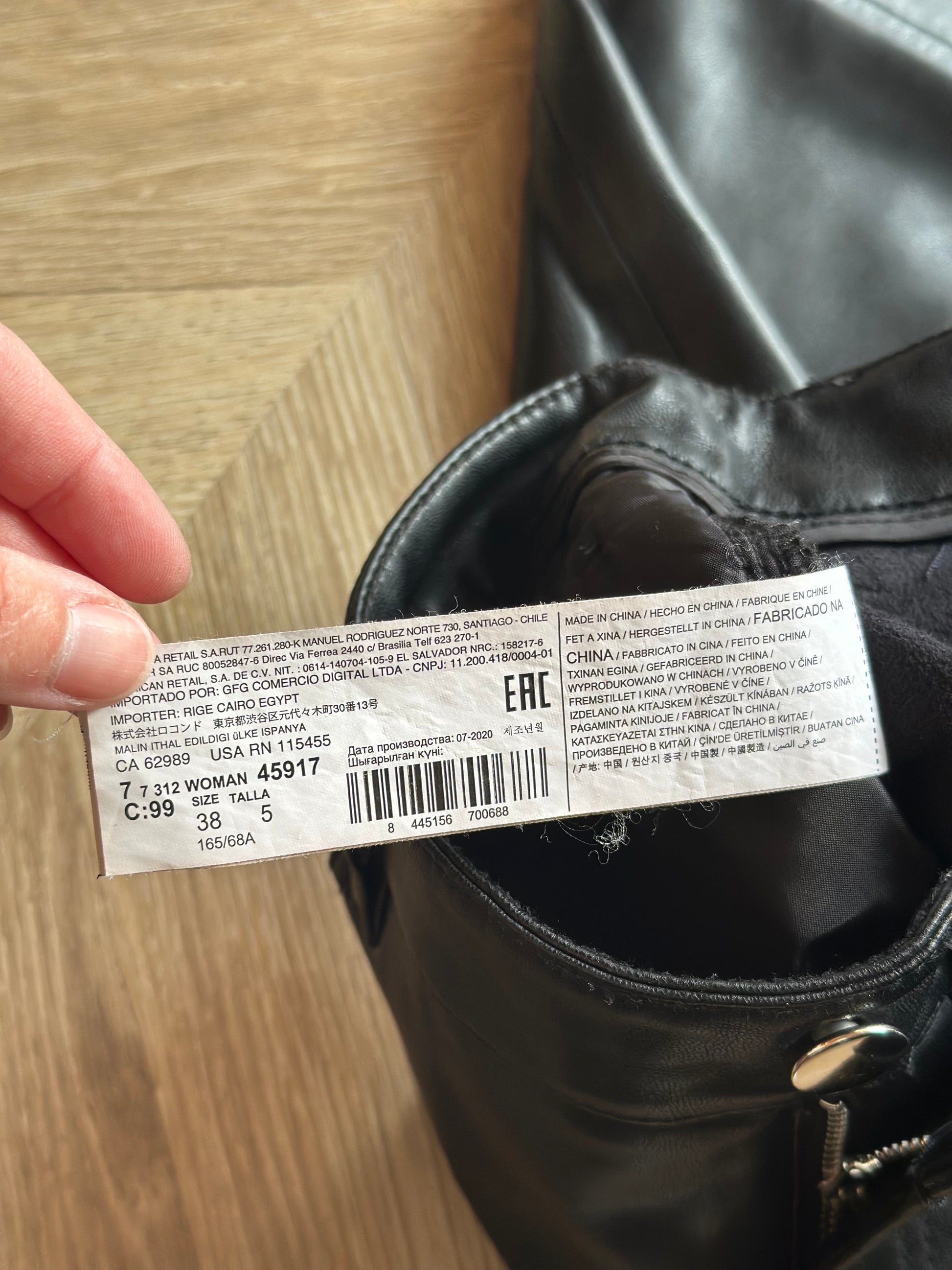 Pantalon droit en similicuir noir, coupe droite avec taille normale, fermeture zippée et bouton, passants pour ceinture et cinq poches. Modèle confortable à porter, agréable au quotidien grâce à sa matière souple et sa coupe bien structurée. Le rendu est moderne et facile à associer, aussi bien en tenue casual que plus habillée. Taille 36 qui correspond bien. Toujours en vente sur le site Mango au prix de 45,99 €. Très bon état, comme neuf, sans défaut.