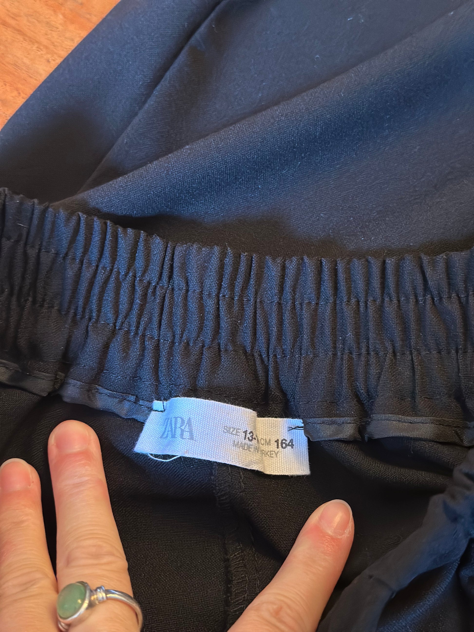 Pantalon coupe chino droit noir de la marque Zara. Taille 13/14 ans correspondant parfaitement à un 34 femme. Taille élastique avec cordon, poches avant discrètes, matière fluide et confortable (62 % polyester, 33 % viscose, 5 % élasthanne) offrant une belle tenue. Longueur environ 90 cm, largeur cheville 14 cm. Style élégant et moderne, idéal pour un look chic ou décontracté. Neuf sans étiquette, jamais porté.