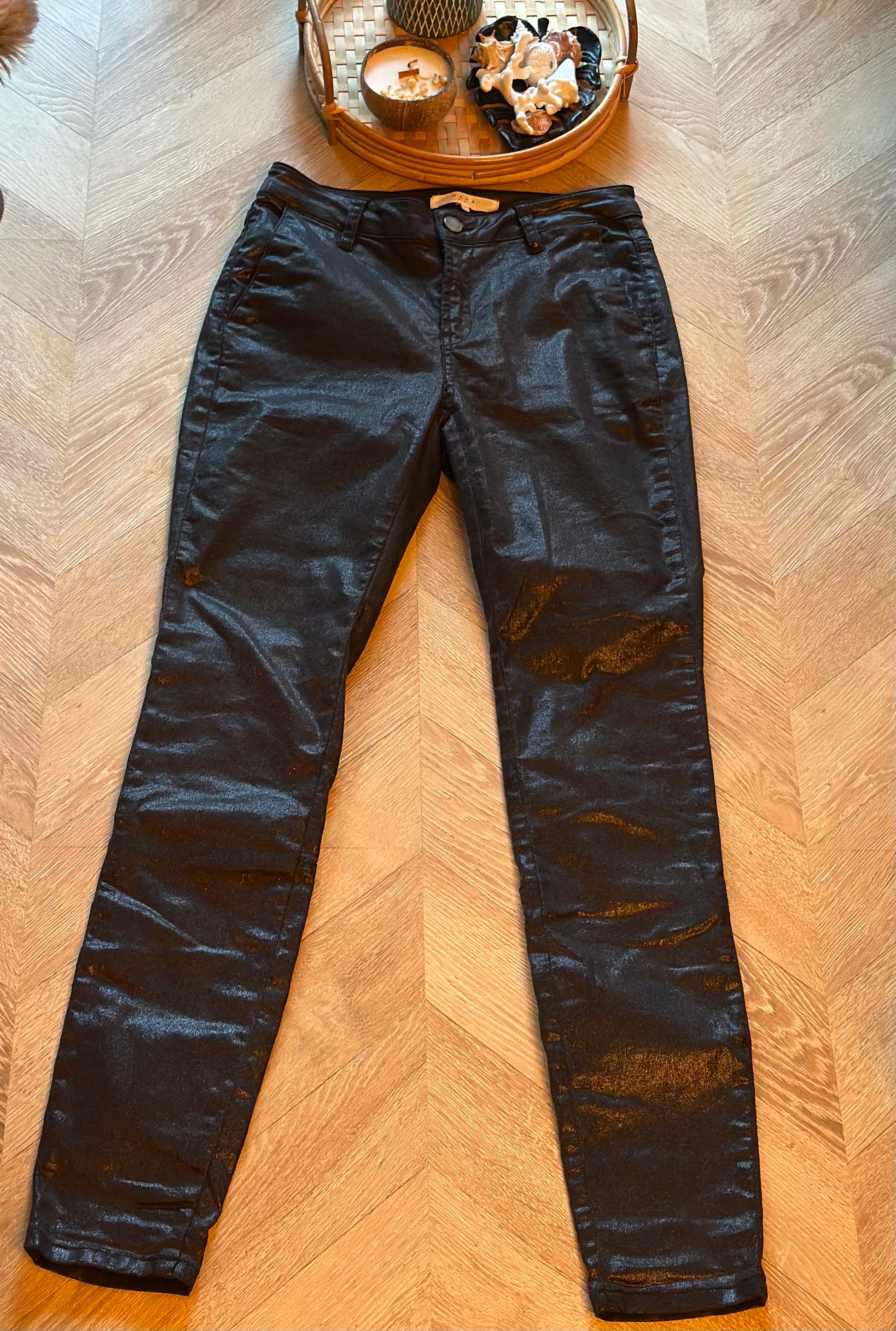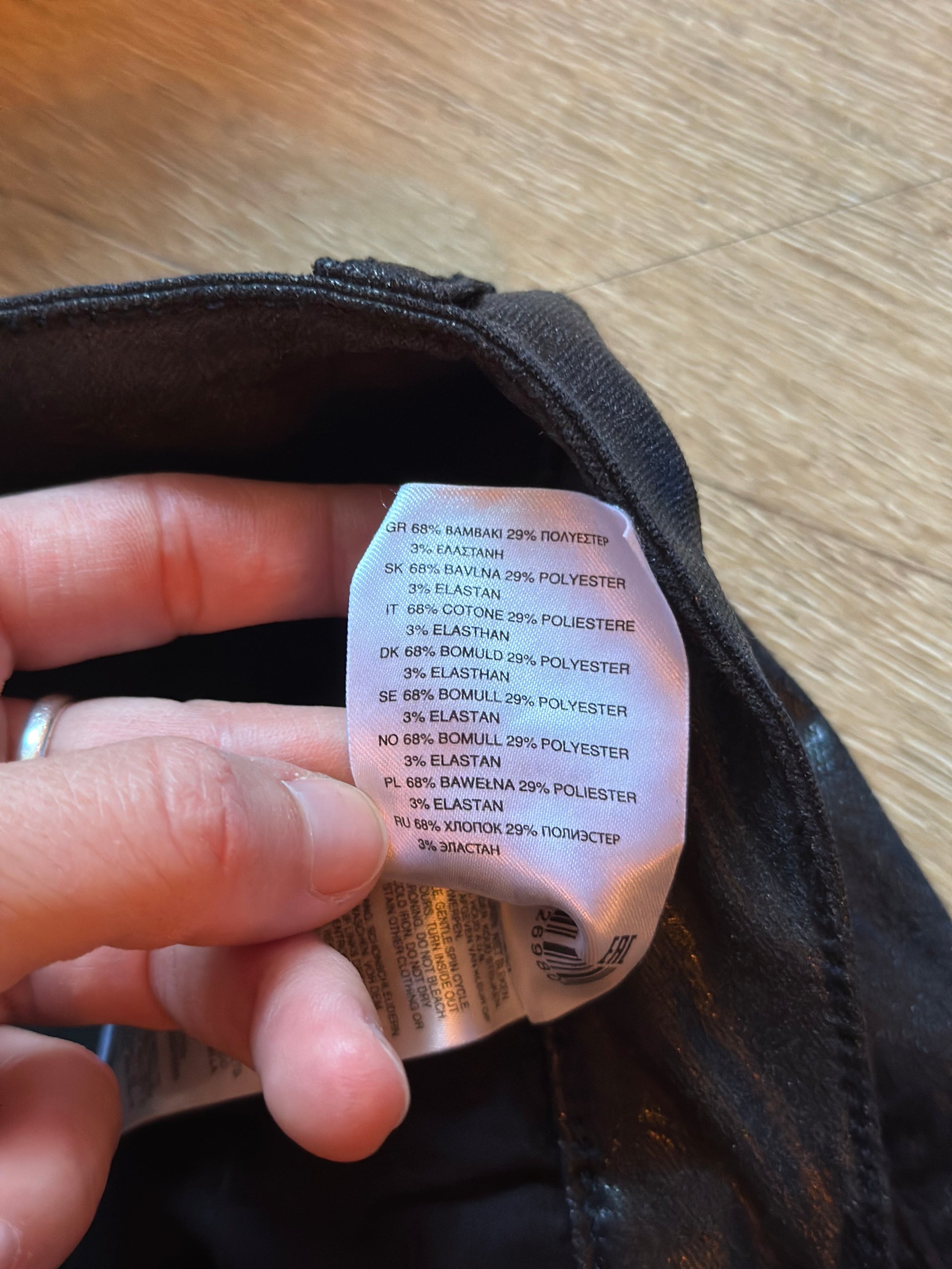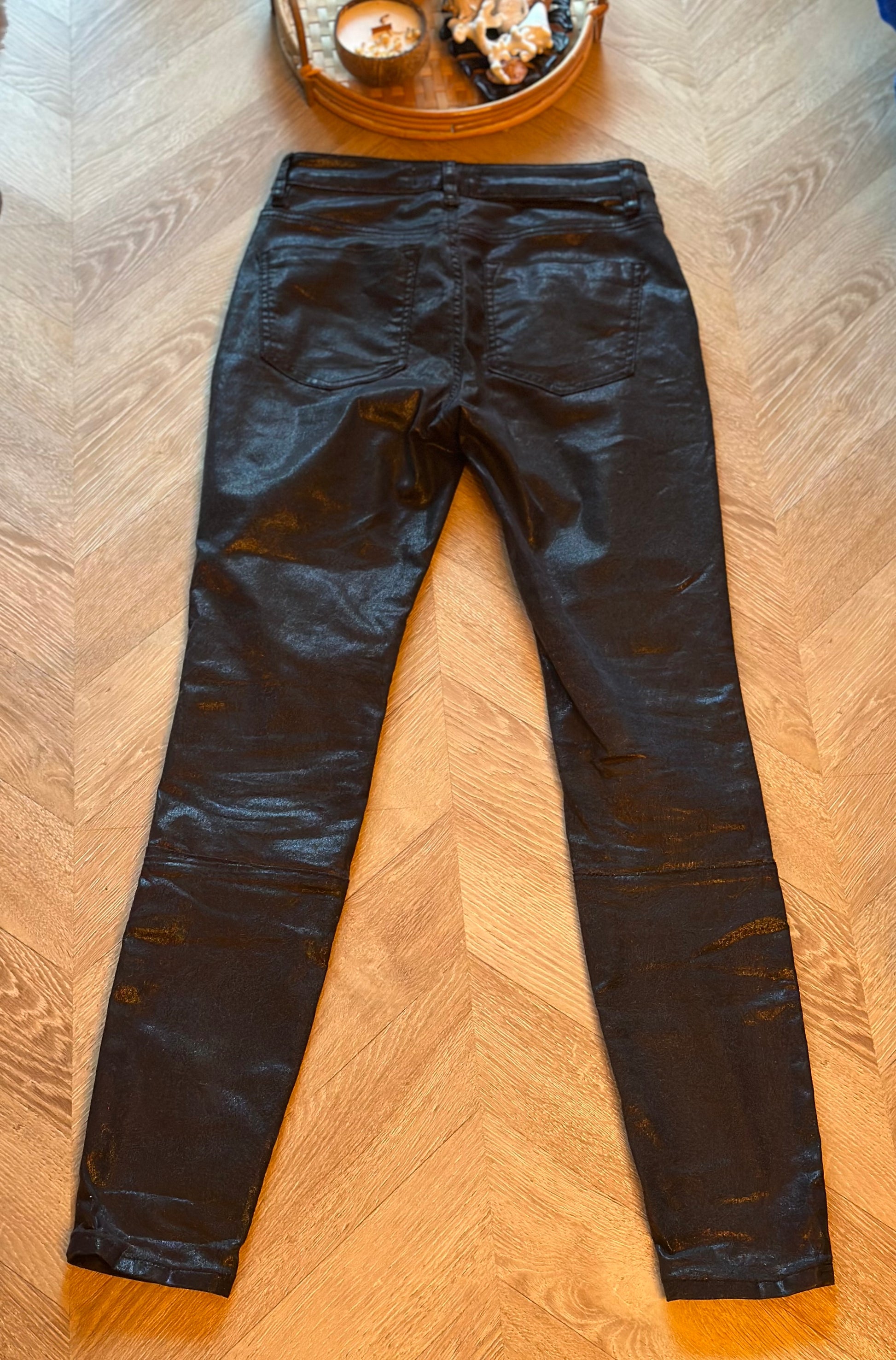 Pantalon slim enduit noir Yaya, coupe ajustée, taille classique, longueur cheville, fermeture bouton + zip, passants pour ceinture. Tissu effet cuir légèrement stretch (68% coton, 29% polyester, 3% élasthanne) confortable et élégant, parfait pour un look chic et moderne au quotidien avec bottines, mocassins ou baskets. Très bon état, pas de défaut. Prix d’achat 99€. Longueur 95 cm. Taille bien.
