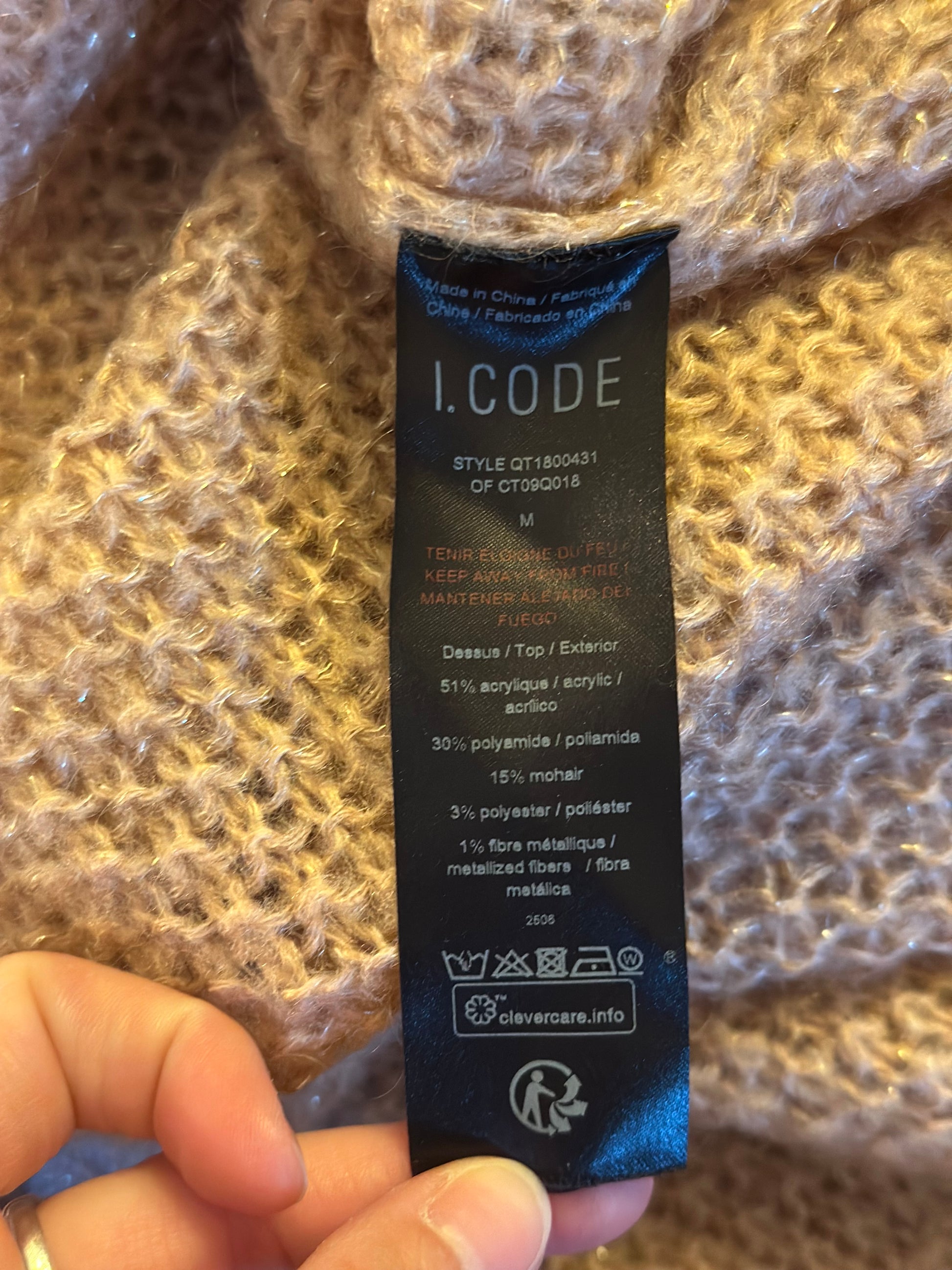 Pull I.Code en maille mélangée mohair, acrylique et fibres métallisées, offrant un rendu doux, léger et légèrement brillant. Coupe oversize avec col V, manches longues et détails ajourés sur le devant pour une touche féminine et élégante. Coloris rose clair lumineux, agréable sur la peau, ne gratte pas. Longueur : 58 cm – largeur aisselle à aisselle : 64 cm. Parfait état, aucune usure.