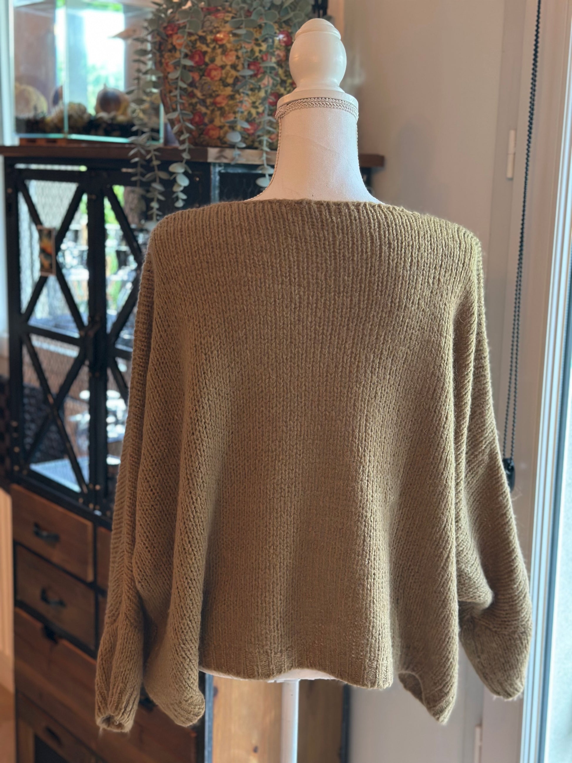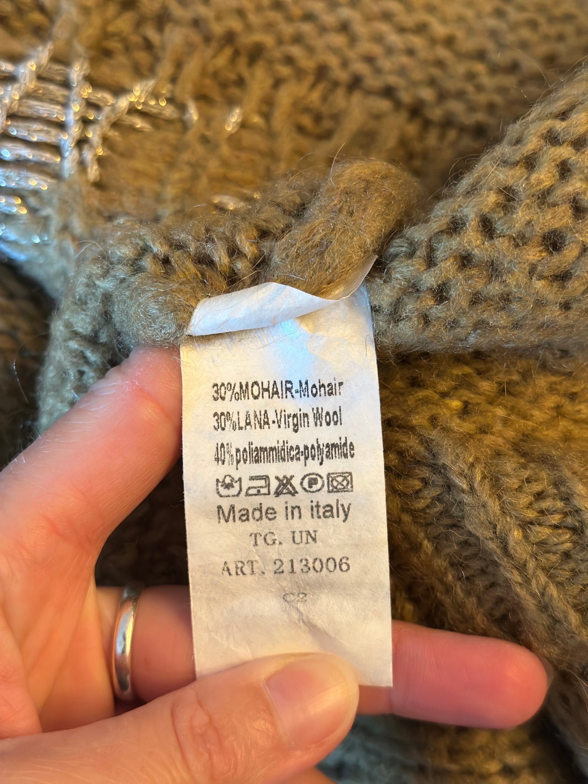 Pull ample en maille douce coloris camel, avec inscription “ROCK” argentée sur le devant. Col V dégagé, manches longues et coupe oversize confortable. Confection italienne de belle qualité (30 % mohair, 30 % laine vierge, 40 % polyamide). Taille unique, convient aux grandes tailles. Aisselle à aisselle : 85 cm, longueur : 55 cm. Parfait état, aucune usure.