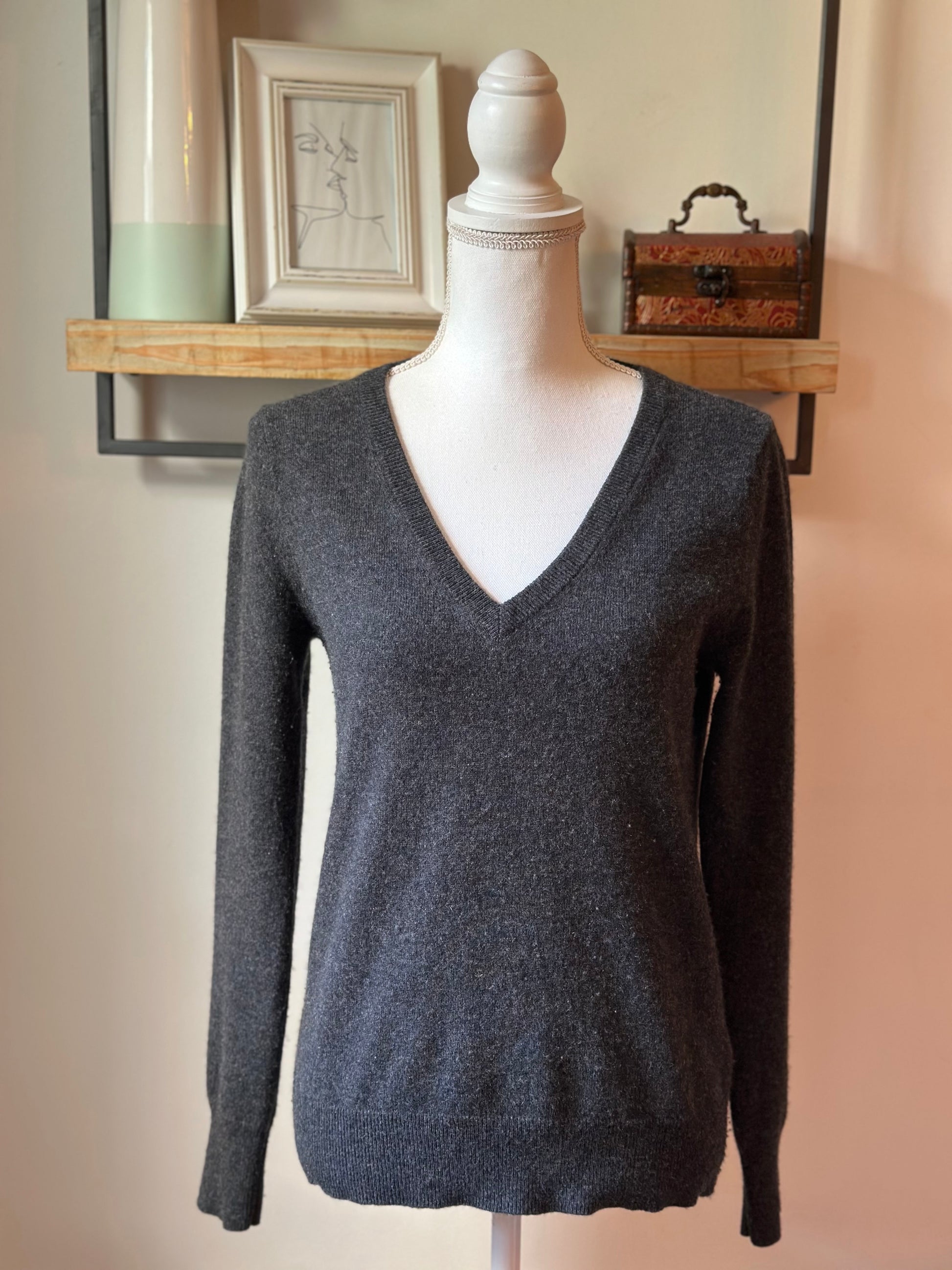 Très bon état général, conforme aux photos. Pull Uniqlo 100 % cachemire, d’une grande douceur et chaleur. Coloris gris anthracite, col en V élégant et coupe ajustée. Un basique intemporel, parfait à porter seul ou sous une veste. Taille S, convient idéalement à cette taille.