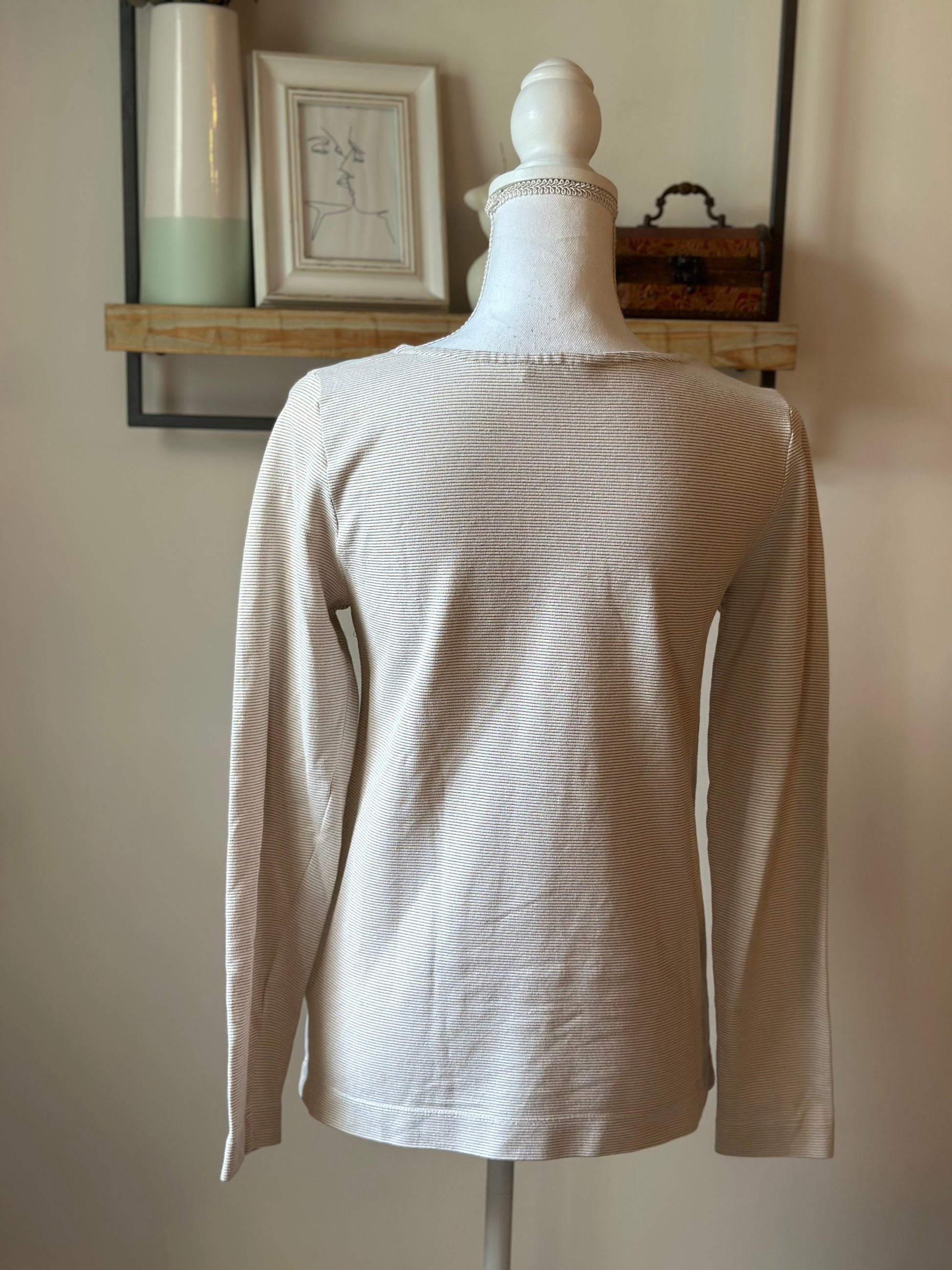 Pull léger en coton, col rond, avec de fines rayures dorées en lurex sur fond blanc crème. Coupe droite, agréable à porter, parfait pour un look chic et lumineux au quotidien. Taille 1, correspond bien. Parfait état, sans défaut.