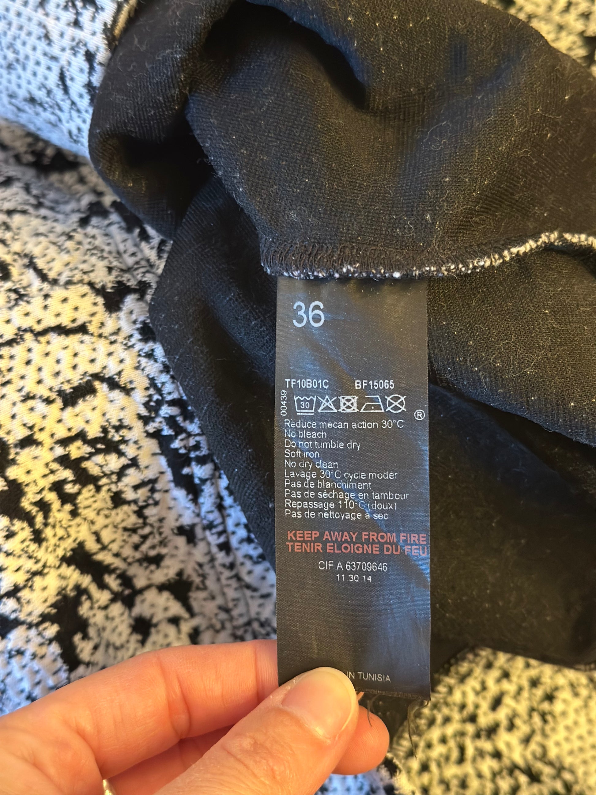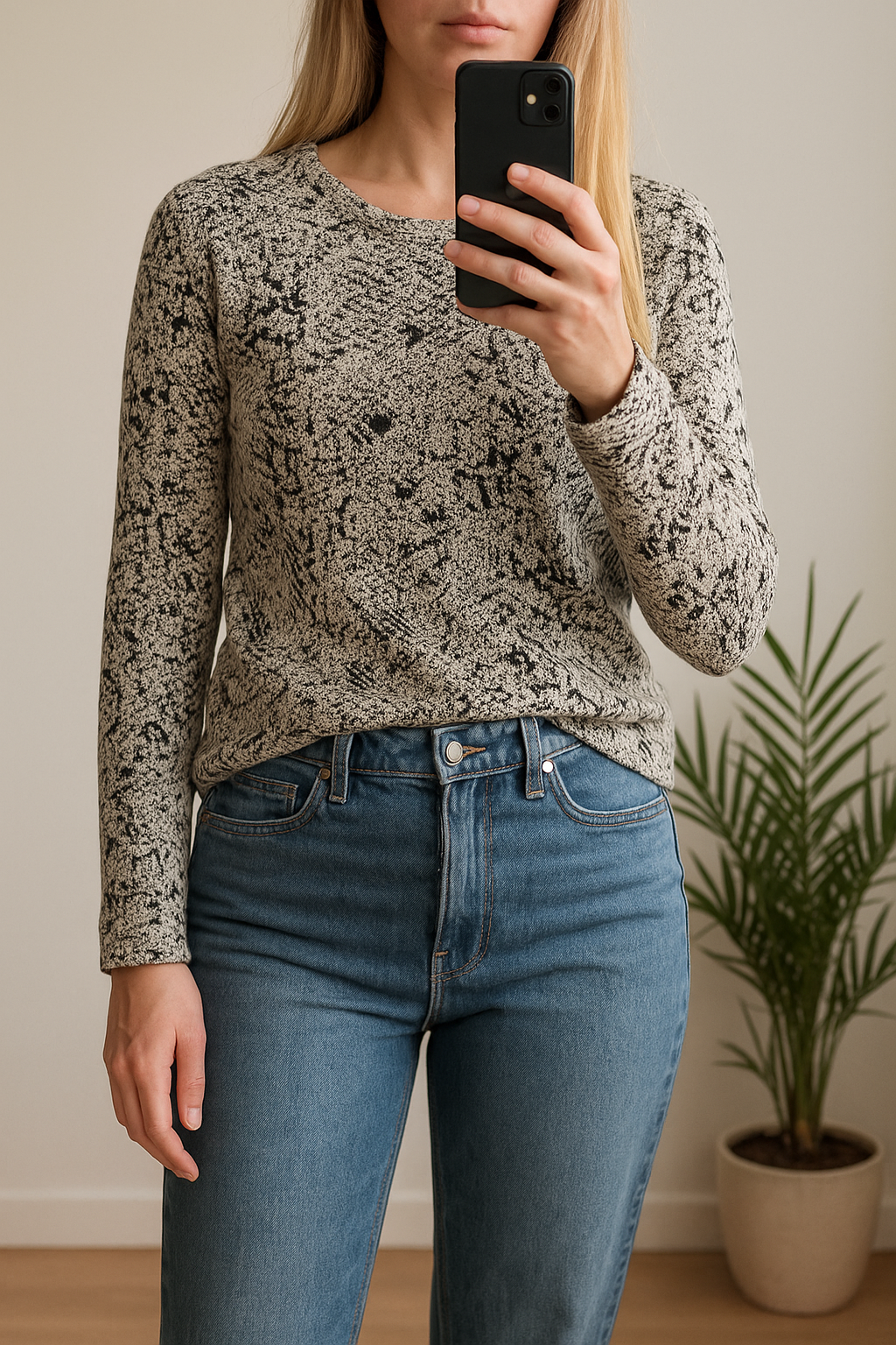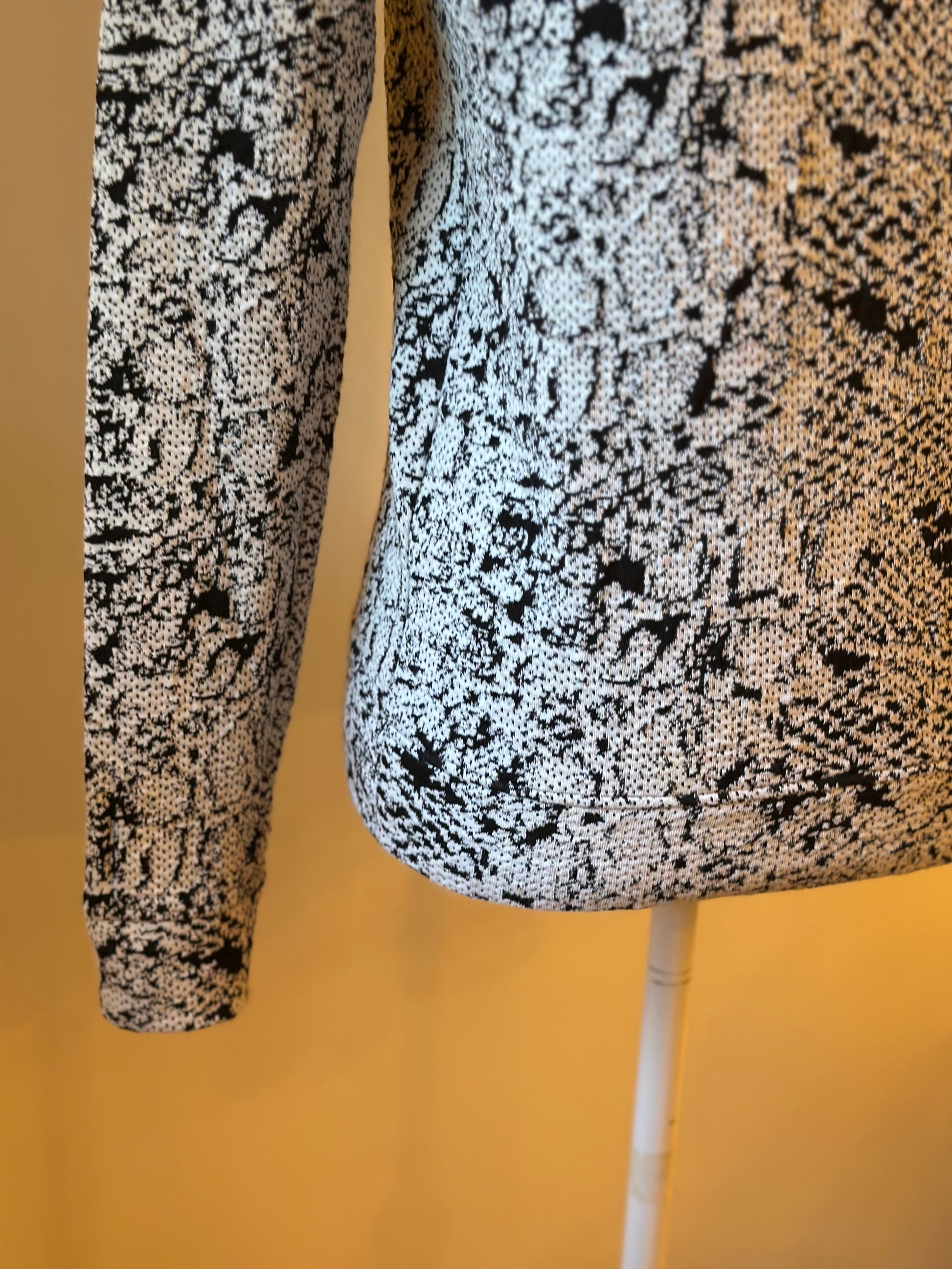 Pull IKKS à manches longues, coupe droite et col rond, dans une maille douce mêlant polyester, coton et une touche d’élasthanne pour le confort. Son imprimé abstrait noir et écru apporte une touche moderne et élégante, idéale pour un look casual chic. Taille 36, coupe bien ajustée et fidèle à la taille. Très bon état, aucun défaut à signaler.