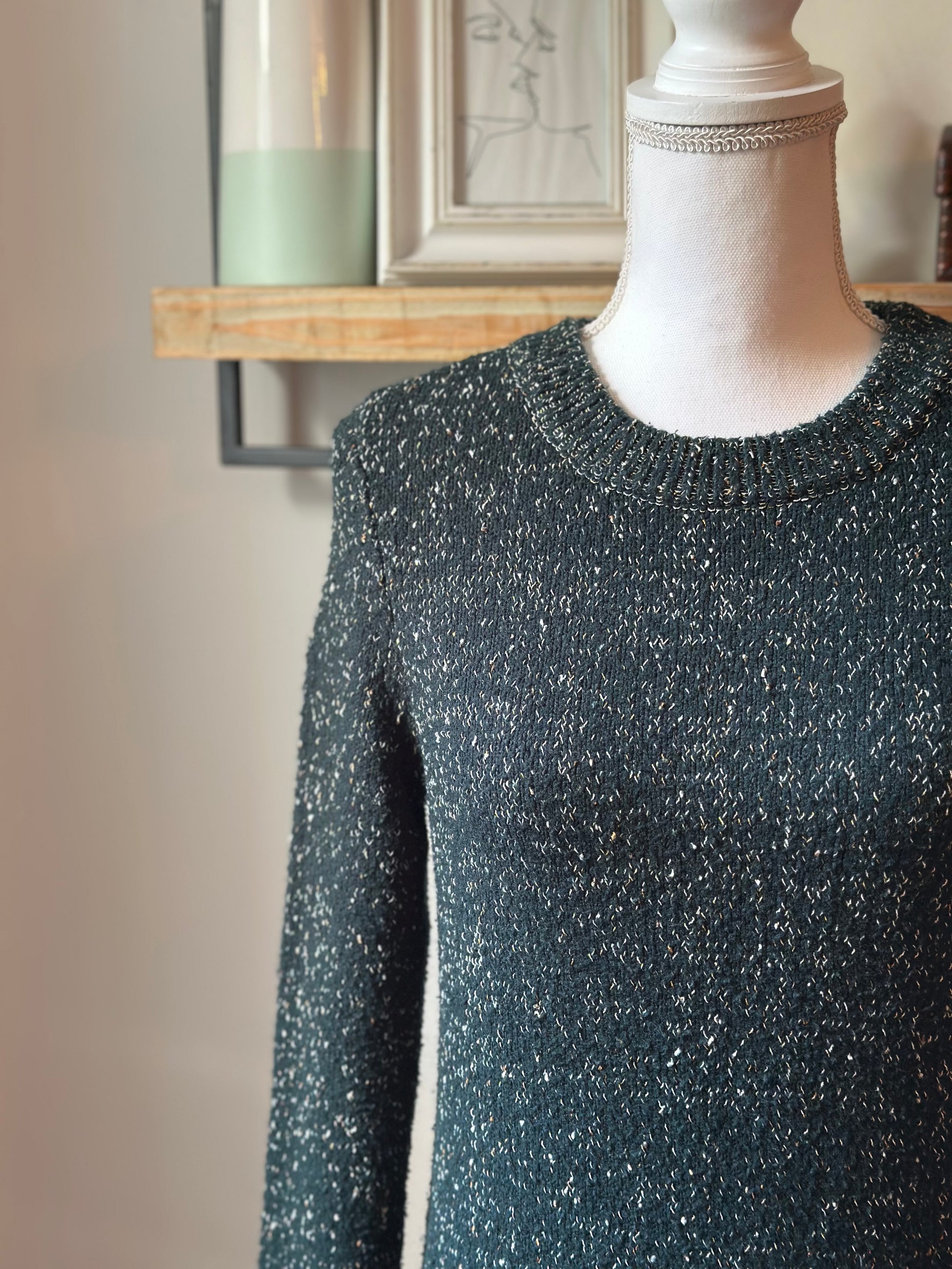 Très bon état général, comme le montrent les photos. Pull Vero Moda à maille vert sapin chinée de fils argentés, col rond et coupe droite légèrement ajustée. Matière douce et extensible pour un confort optimal : 52 % acrylique, 25 % nylon, 21 % polyester et 2 % élasthanne. Style casual chic, parfait pour un look du quotidien avec un jean ou une jupe. Taille XS, correspond bien à la taille annoncée.