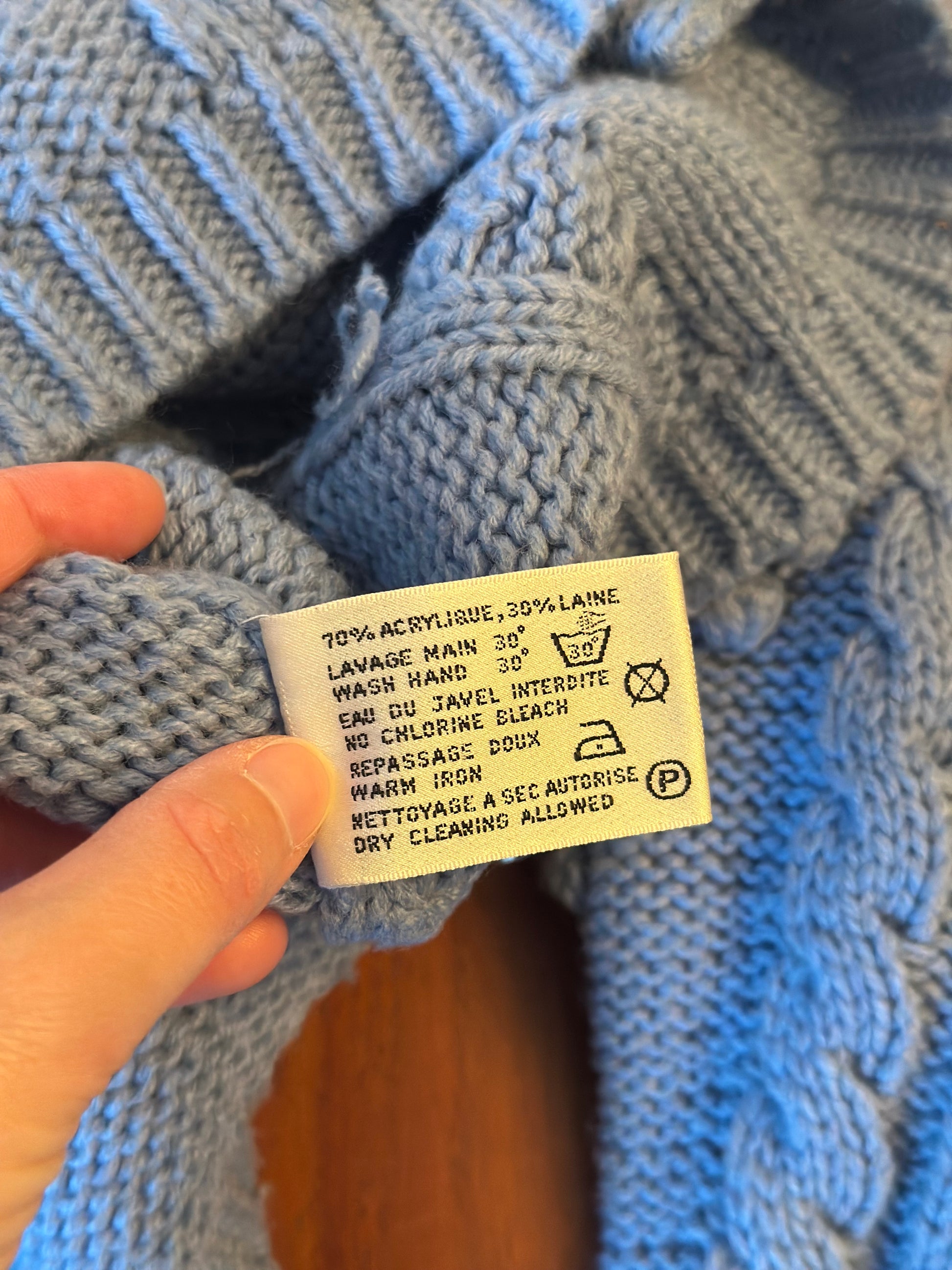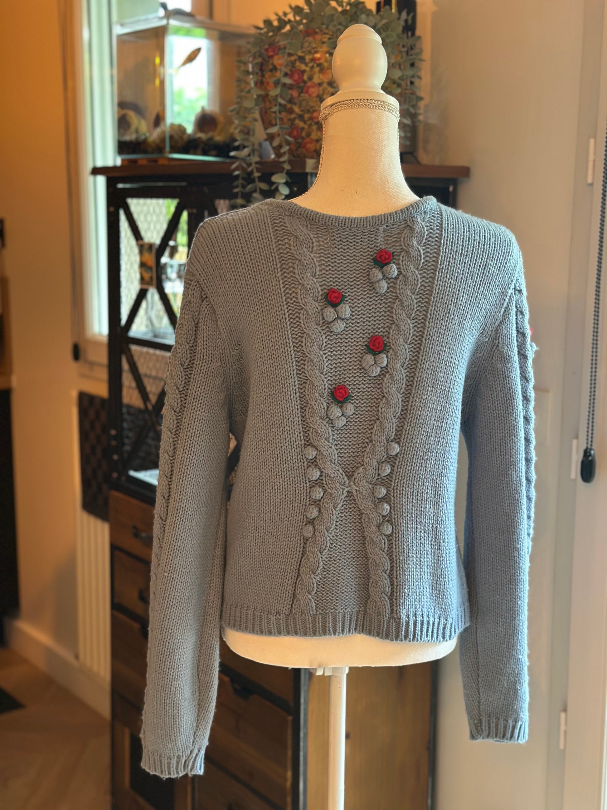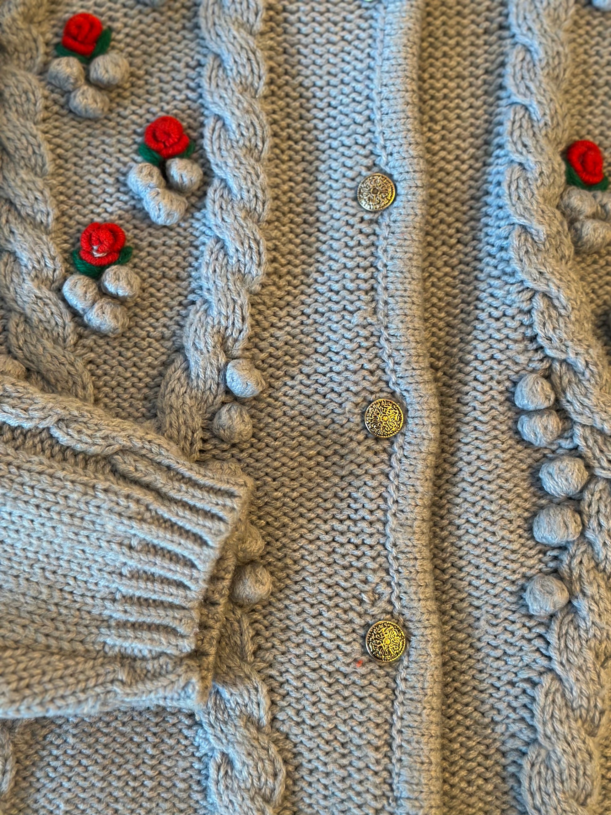Magnifique gilet bleu clair Diapositive Collection, une belle pièce au style vintage et intemporel 🌹. Maille épaisse et douce de belle qualité, composée de 70 % acrylique et 30 % laine, avec un superbe travail de torsades et de fleurs brodées rouges et vertes sur le devant et les manches. Boutons argentés gravés, coupe droite et féminine.