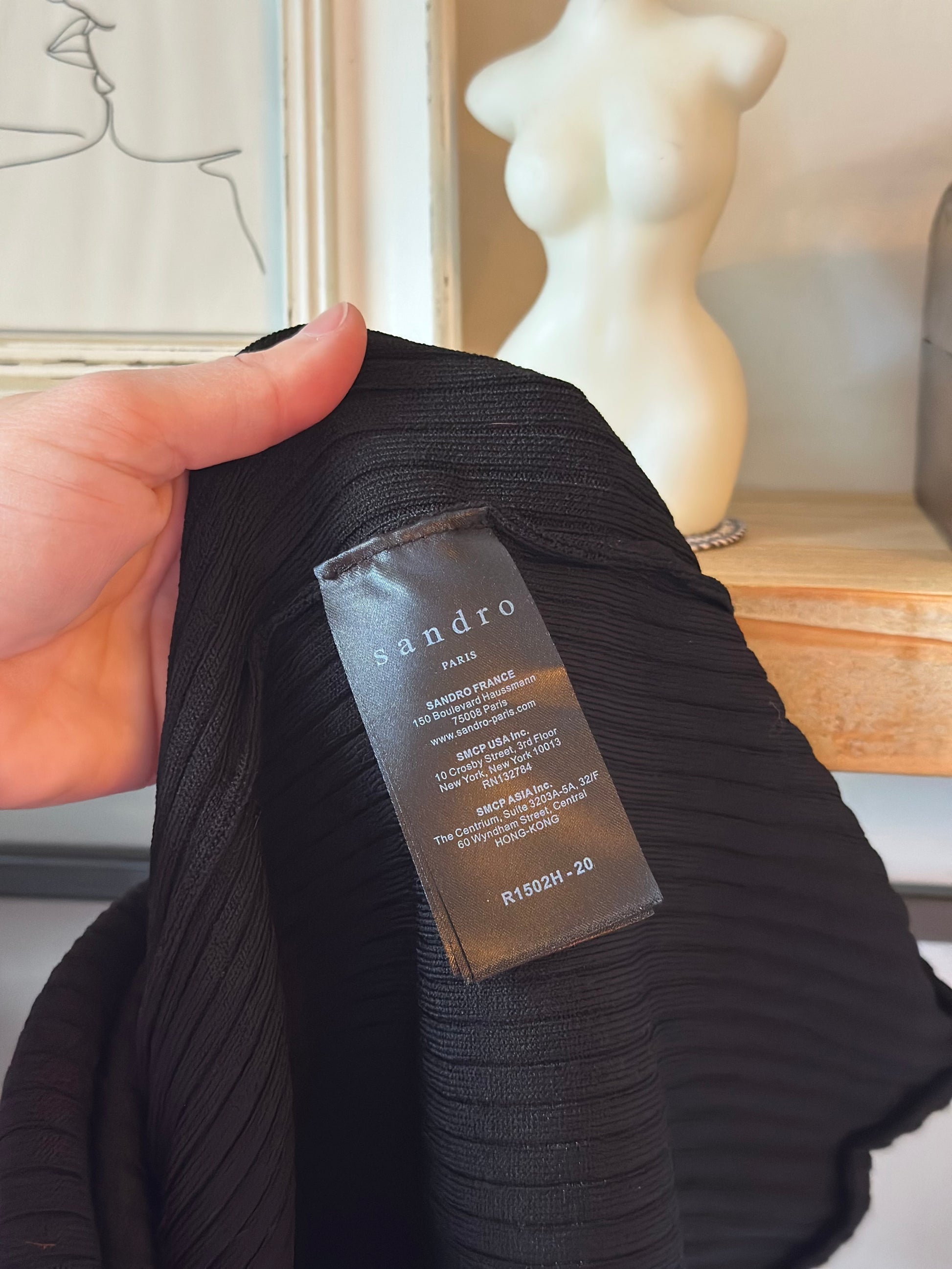 Robe élégante en maille côtelée noire avec empiècement blanc contrastant sur le haut, souligné de volants délicats. Coupe près du corps qui met joliment la silhouette, manches longues et longueur au-dessus du genou. Le rendu est chic et féminin, facile à porter aussi bien au quotidien qu’en tenue plus habillée. Taille 2, convient bien à un 38. Composition visible sur l’étiquette : 55 % viscose et 45 % polyamide. Très bon état général, sans défaut notable. Prix d’achat 295€ !