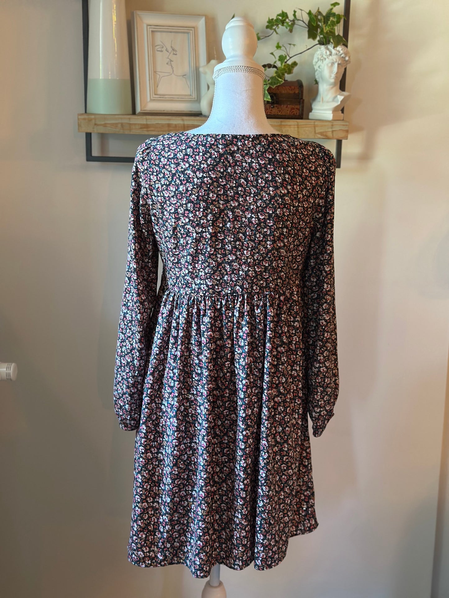 Robe à imprimé floral, col en V et manches longues légèrement bouffantes. Coupe fluide et légère, idéale pour un style casual féminin. Matière agréable à porter, en parfait état, aucun défaut.