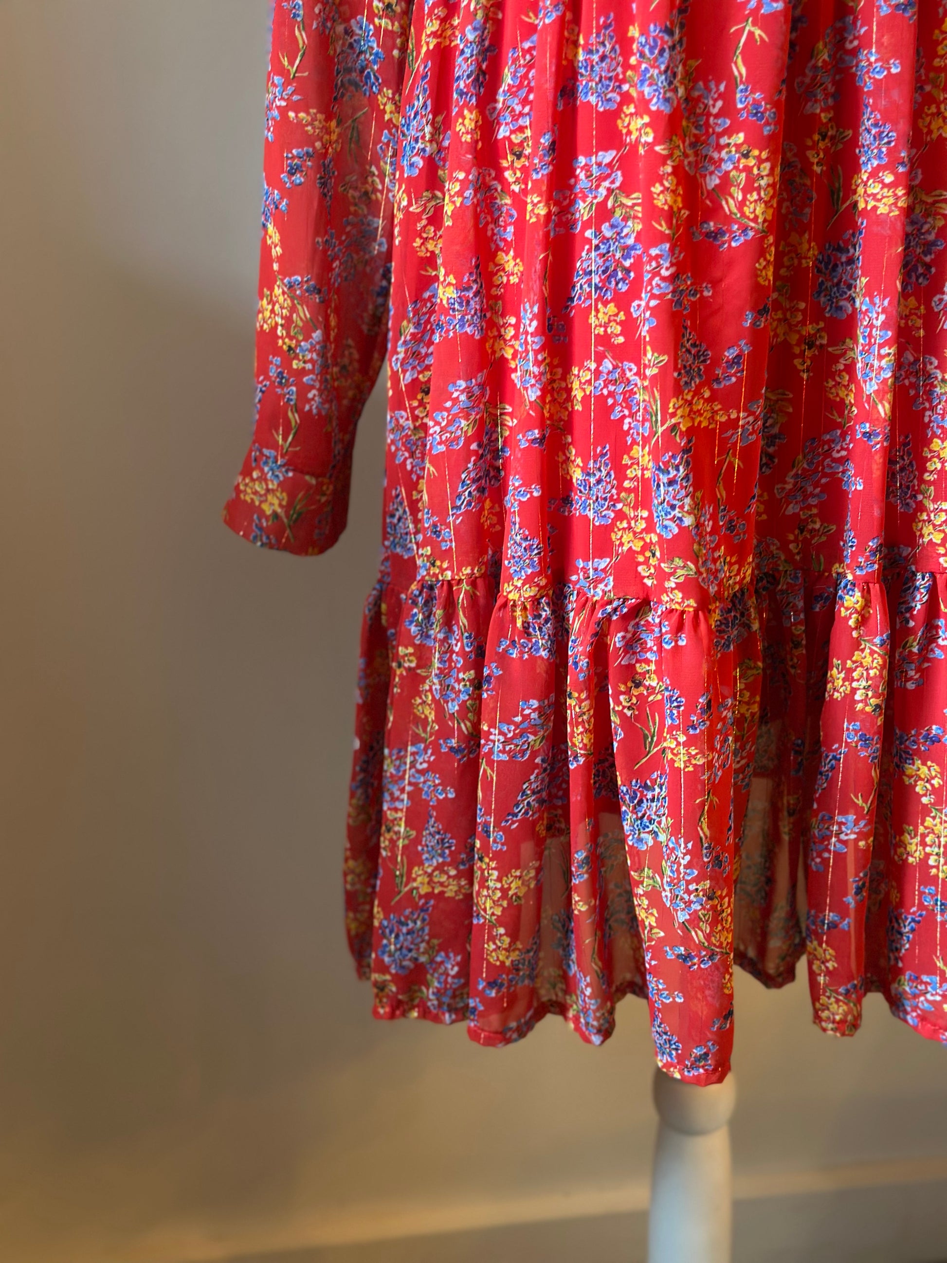 Robe évasée signée Vintage Love à imprimé fleuri sur fond rouge, coupe fluide et légère avec col en V flatteur. Manches longues, tissu doux et doublé pour un tombé parfait. Fabriquée en France, 100 % polyester. Style bohème chic, agréable à porter au quotidien comme pour une sortie. Très bon état, aucun défaut à signaler.