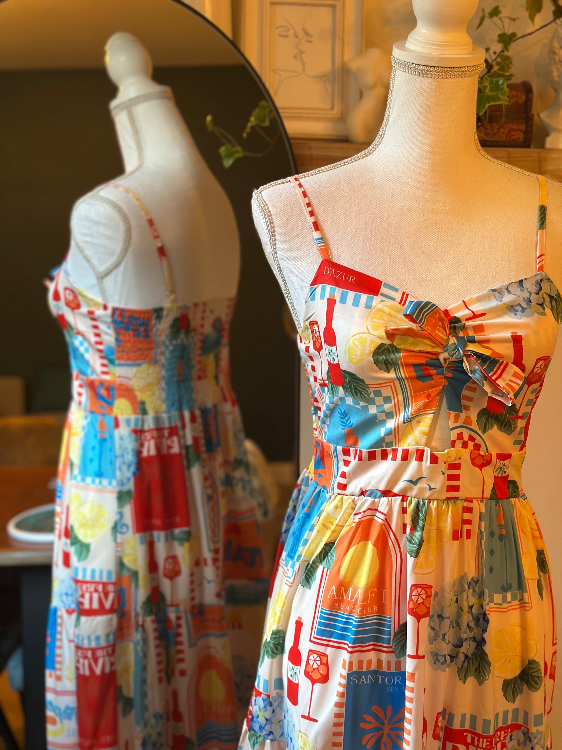 Cette robe longue à fines bretelles et au décolleté noué est un concentré d’énergie estivale. Son imprimé coloré d’inspiration Riviera respire la joie et le soleil.