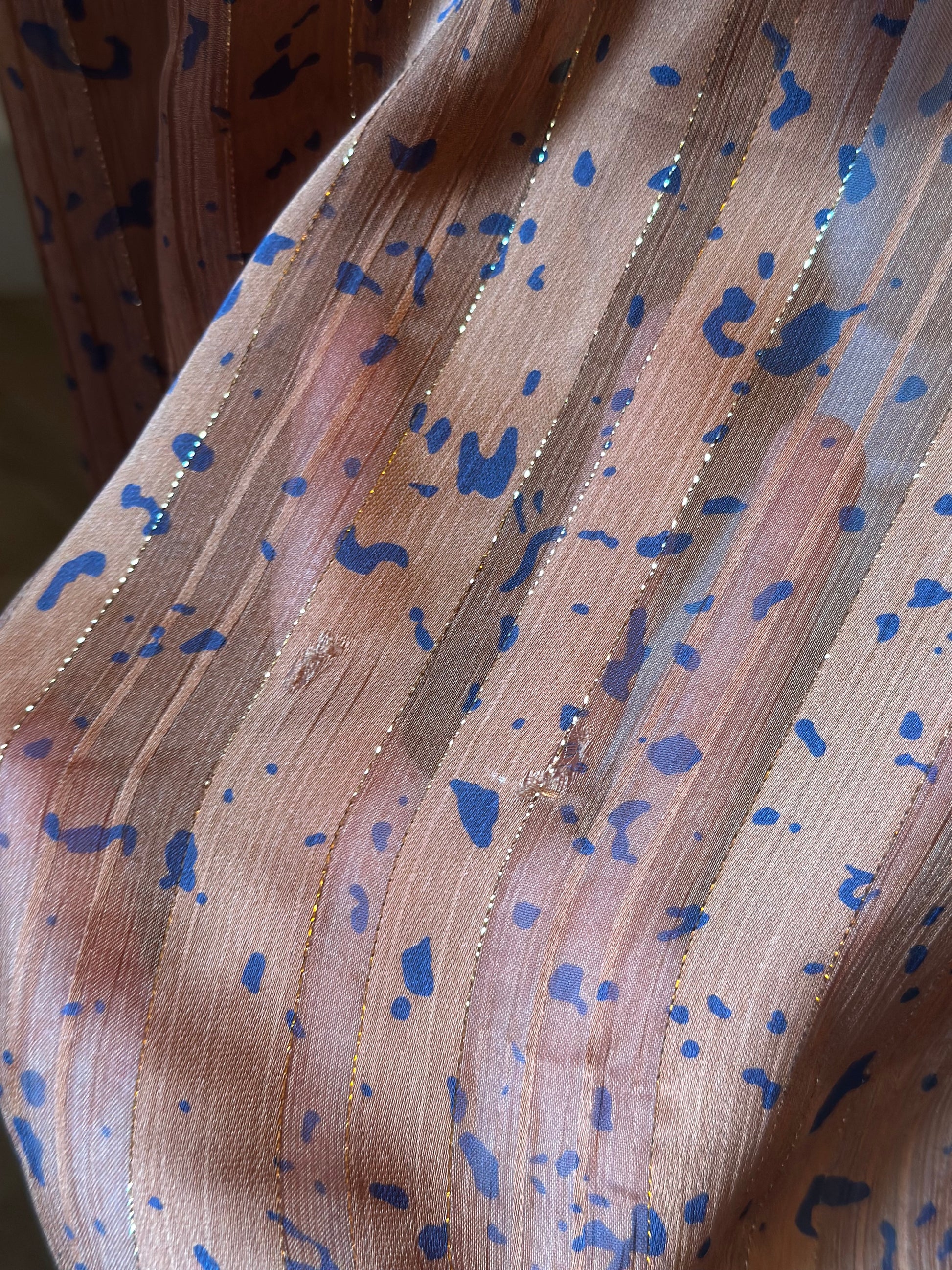 Robe longue Opullence Paris en tissu lurex doré, au tombé fluide et élégant. Coupe féminine avec col façon cache-cœur, lien à nouer à la taille et fermeture discrète sur le côté. Deux fentes à l’arrière du bas de la robe apportent une touche raffinée. Longueur 145 cm, taille bien pour un 38. Très bon état général, deux petites accroches peu visibles sur le bas de la robe, sans impact porté. (Cf dernière photo). Prix d’achat 129 €, proposé à petit prix en conséquence.