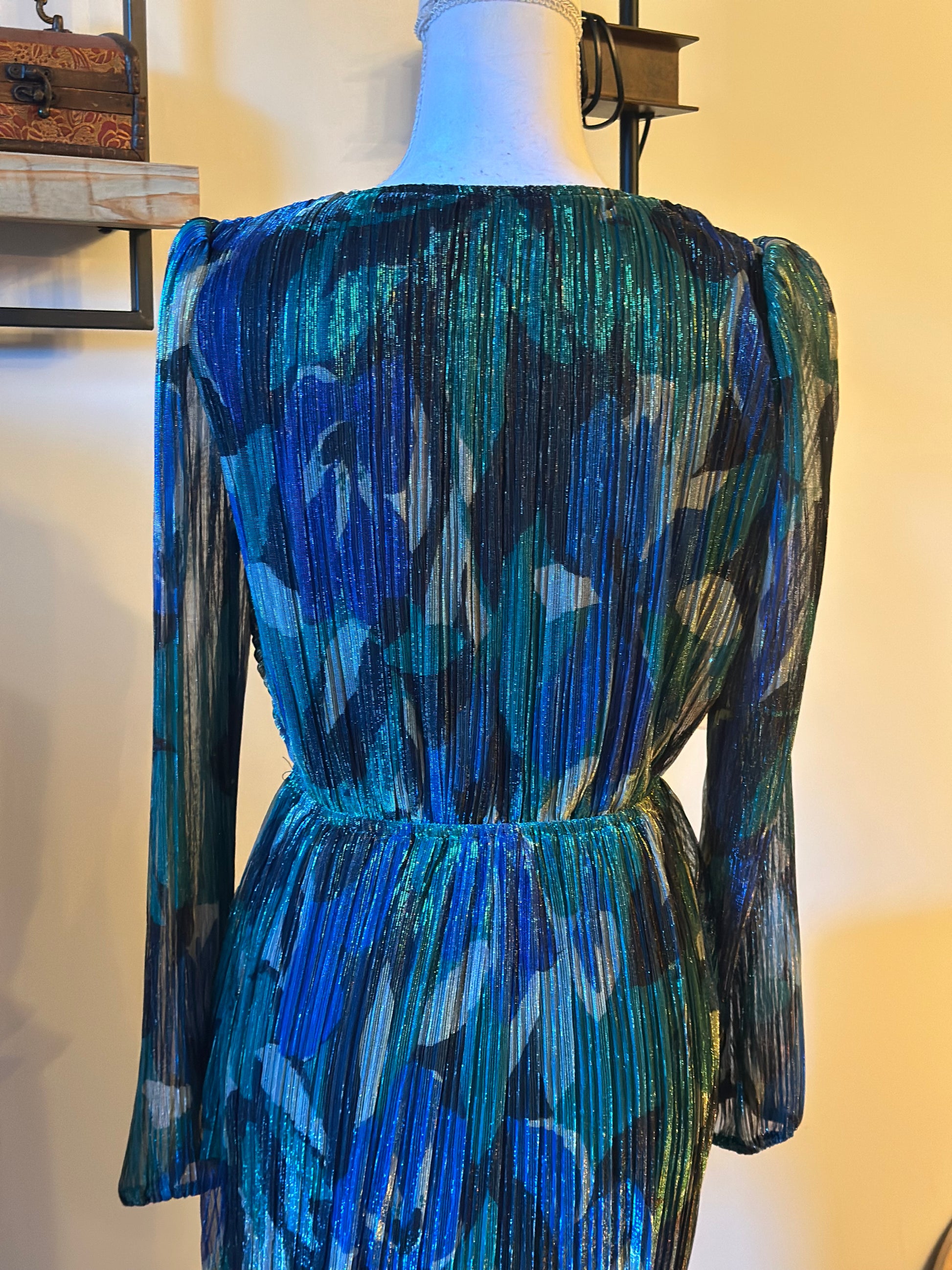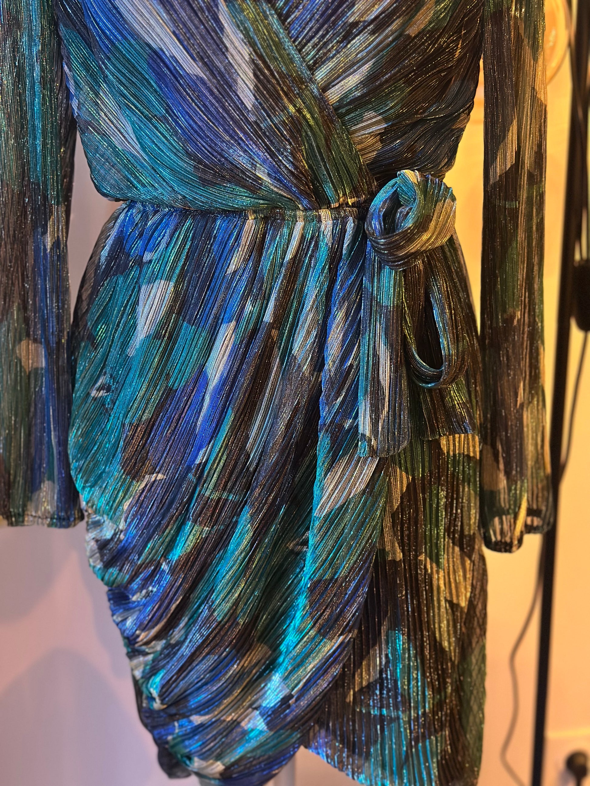 Belle robe Promod aux tons vert, bleu et noir, avec un imprimé élégant et un léger effet pailleté. Elle présente un décolleté en V croisé, des manches longues semi-transparentes qui arrivent bien au niveau du poignet, ainsi qu’un lien à nouer à la taille pour une jolie mise en valeur de la silhouette. La jupe est fluide et délicatement drapée, avec une matière plissée légère offrant un tombé très agréable et un rendu à la fois chic et féminin. Article en très bon état, taille 36 (correspond bien à la taille).