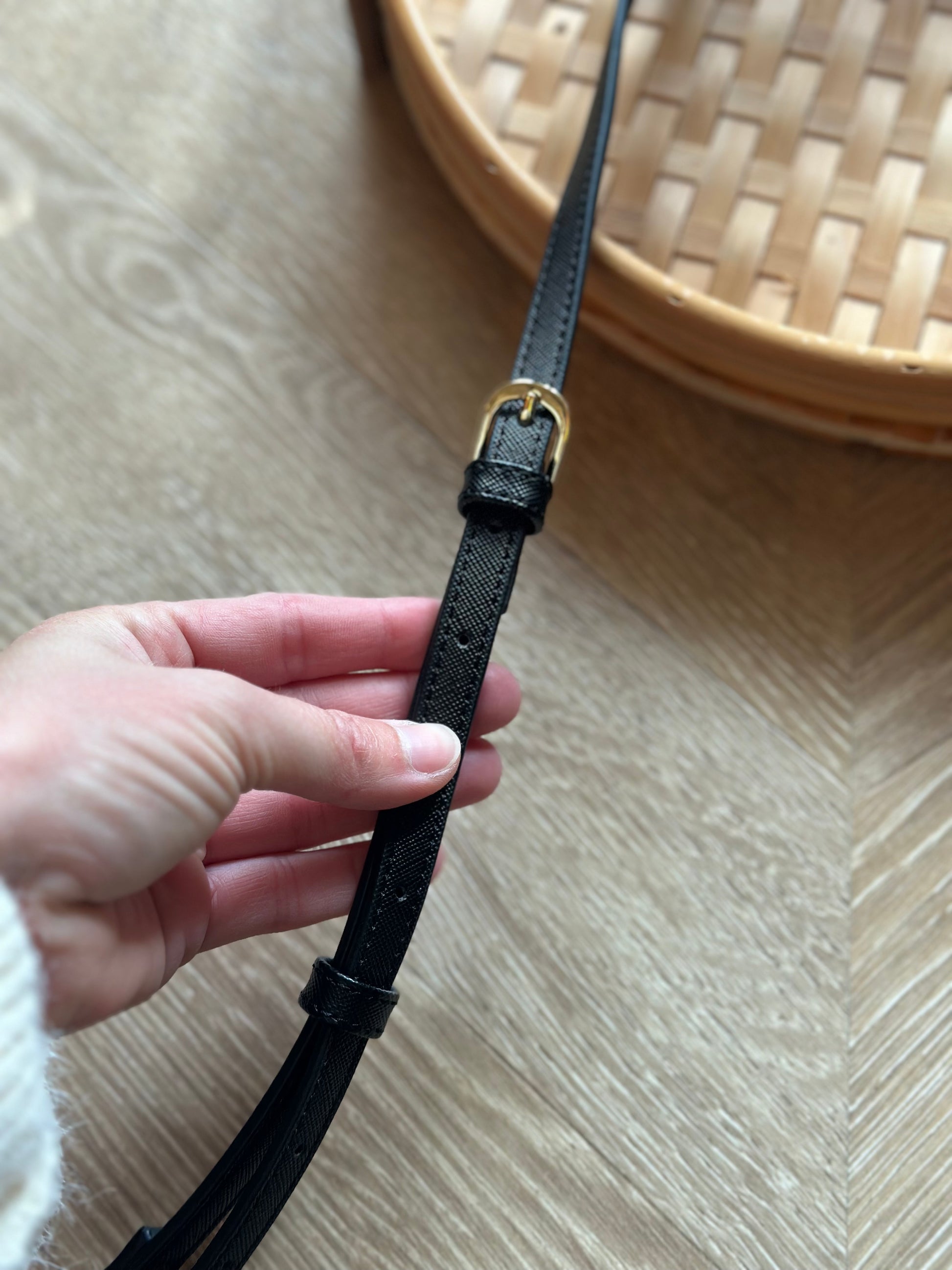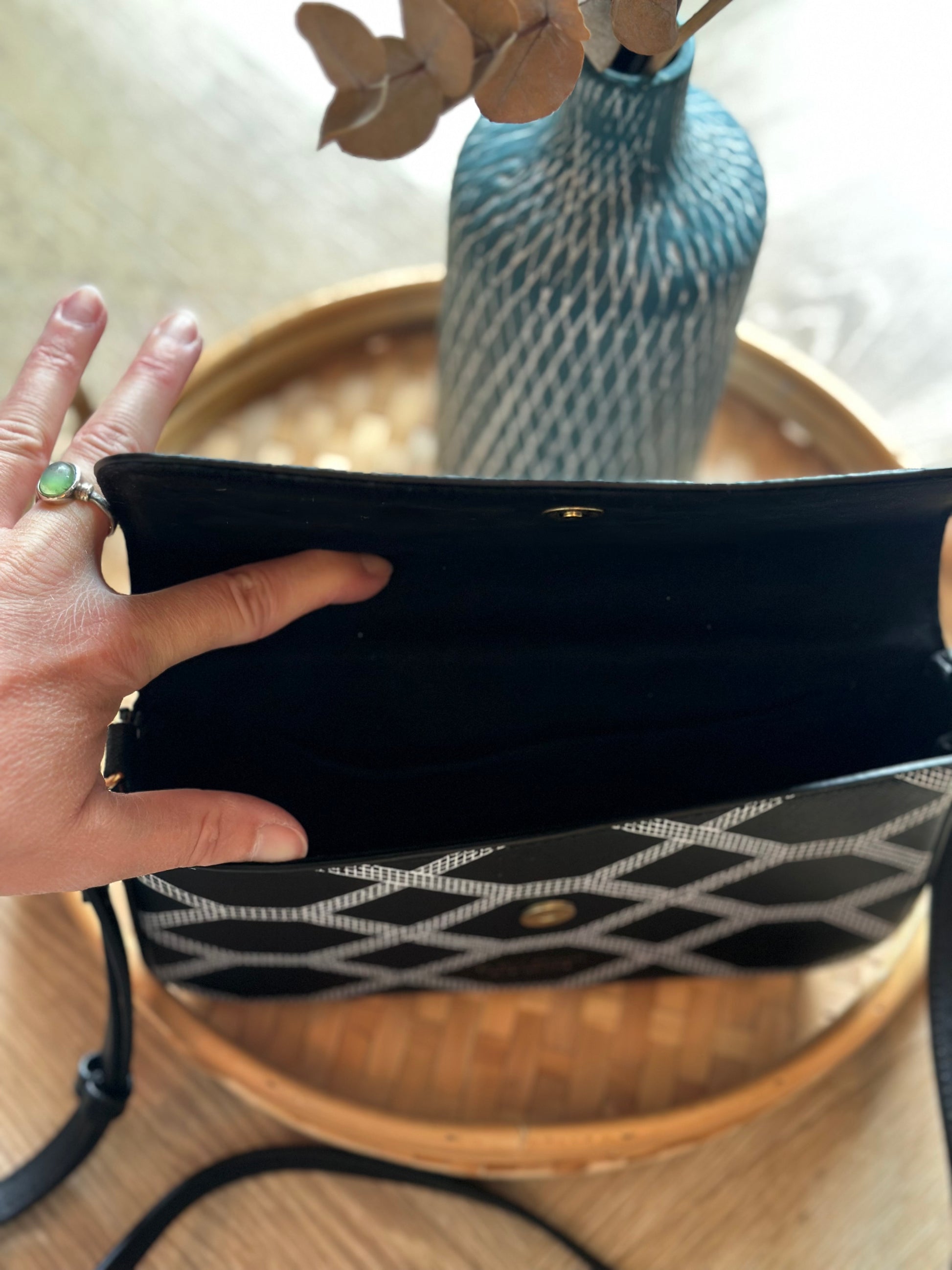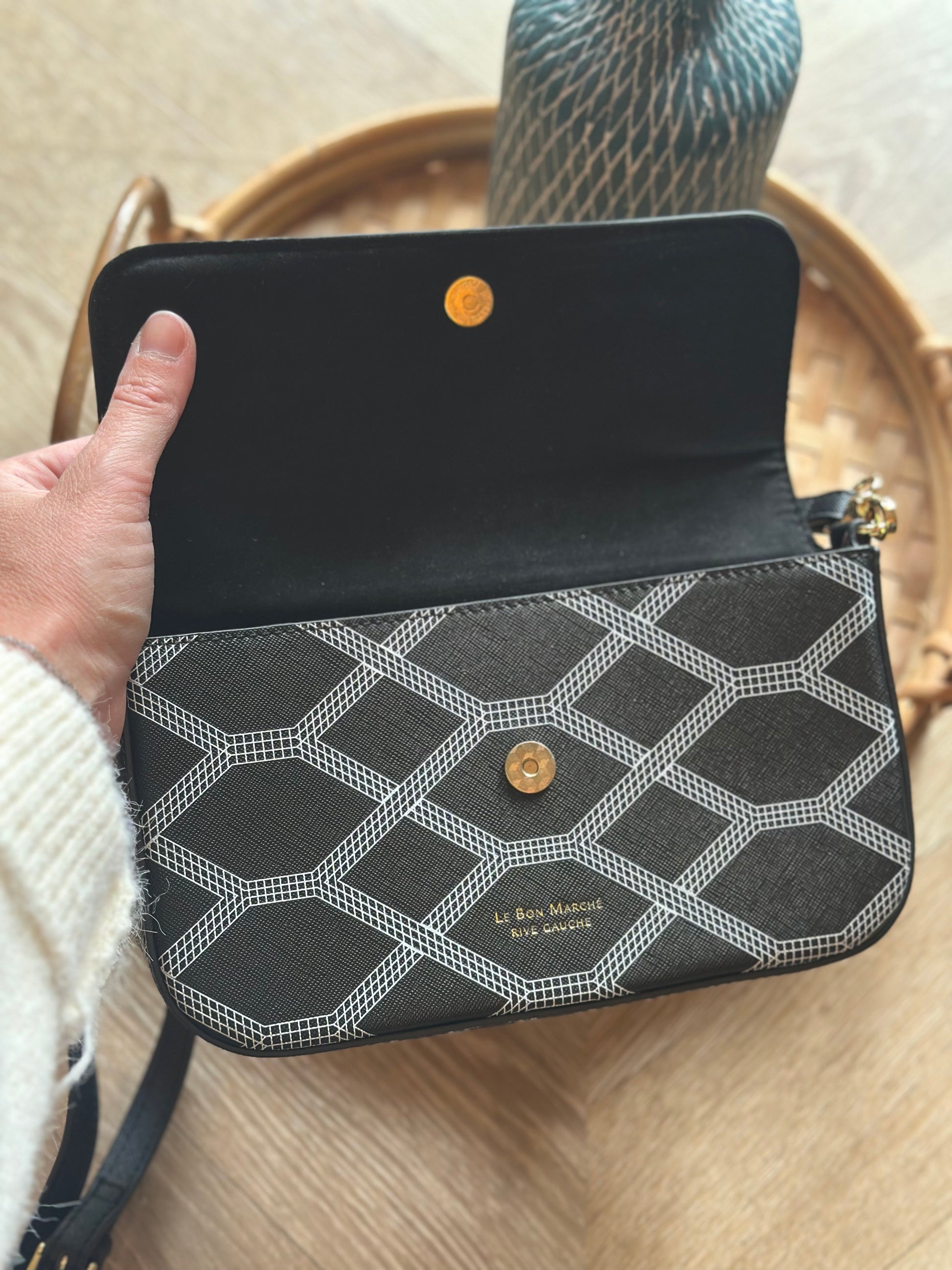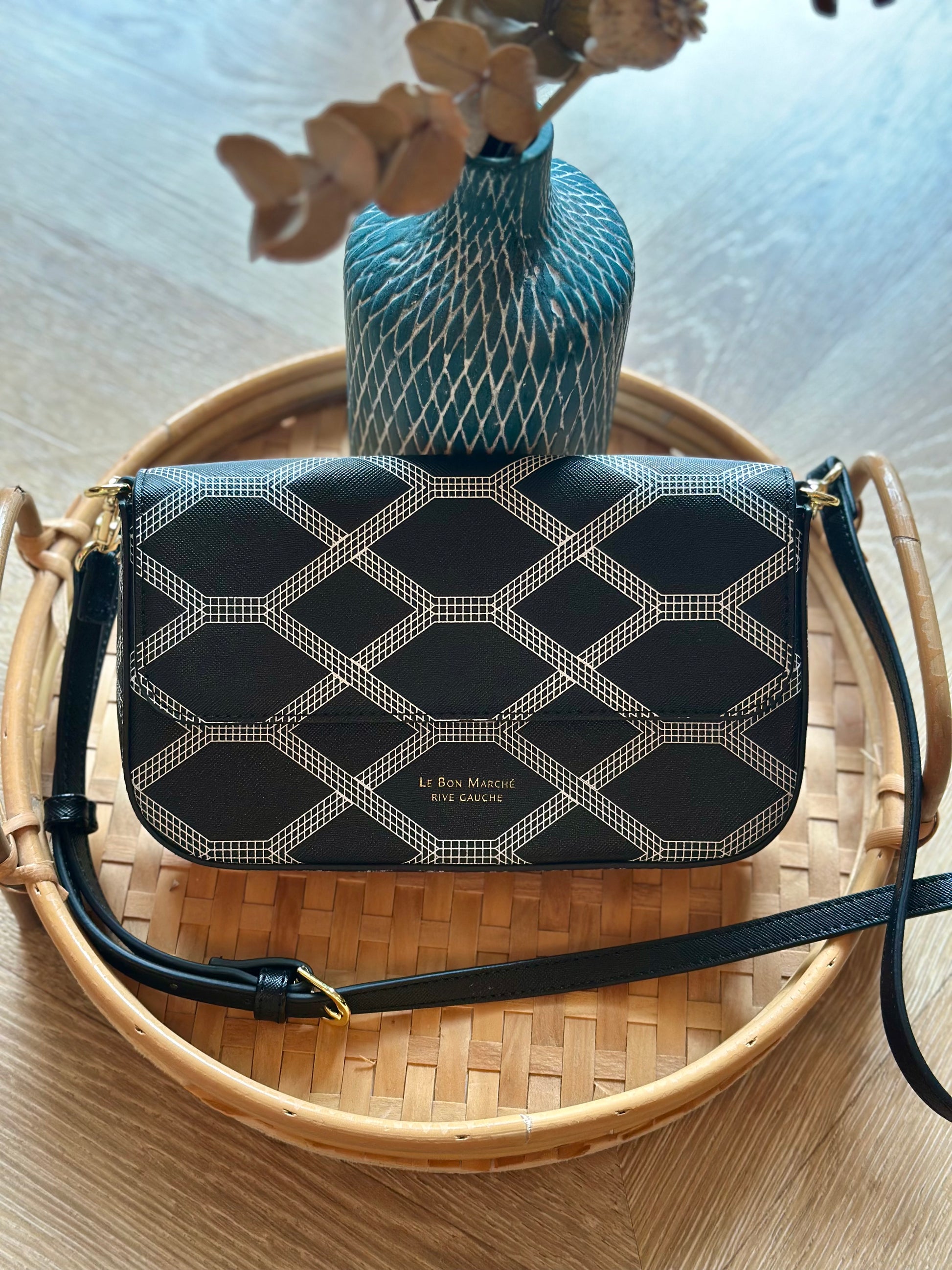 Sac bandoulière au motif géométrique graphique noir et écru, format compact et structuré, avec rabat à bouton pression doré et finitions dorées. Modèle porté épaule ou en bandoulière grâce à sa sangle ajustable. Intérieur doublé avec une petite poche plate très pratique pour l’essentiel lors de vos sorties. Style chic et moderne, facile à associer au quotidien. Parfait état, comme neuf. Acheté aux Galeries Lafayette au prix de 90 €.