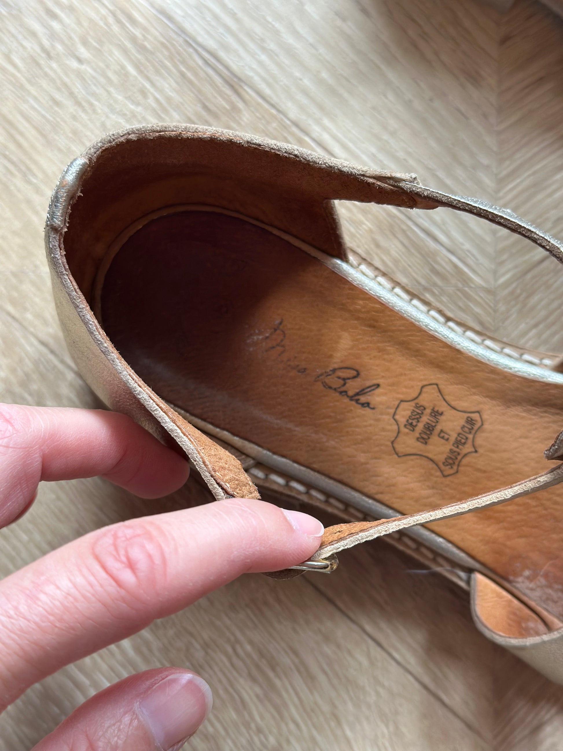 Sandales Miss Bela en cuir doré, au design tressé sur le dessus avec bride ajustable à la cheville. Semelle intérieure en cuir, doublure et dessus également en cuir, gage de confort et de qualité. Talon bas pour une allure féminine et pratique, parfaites pour un look estival chic et décontracté. Très bon état, portées quelques fois, peu de défaut voir photos.