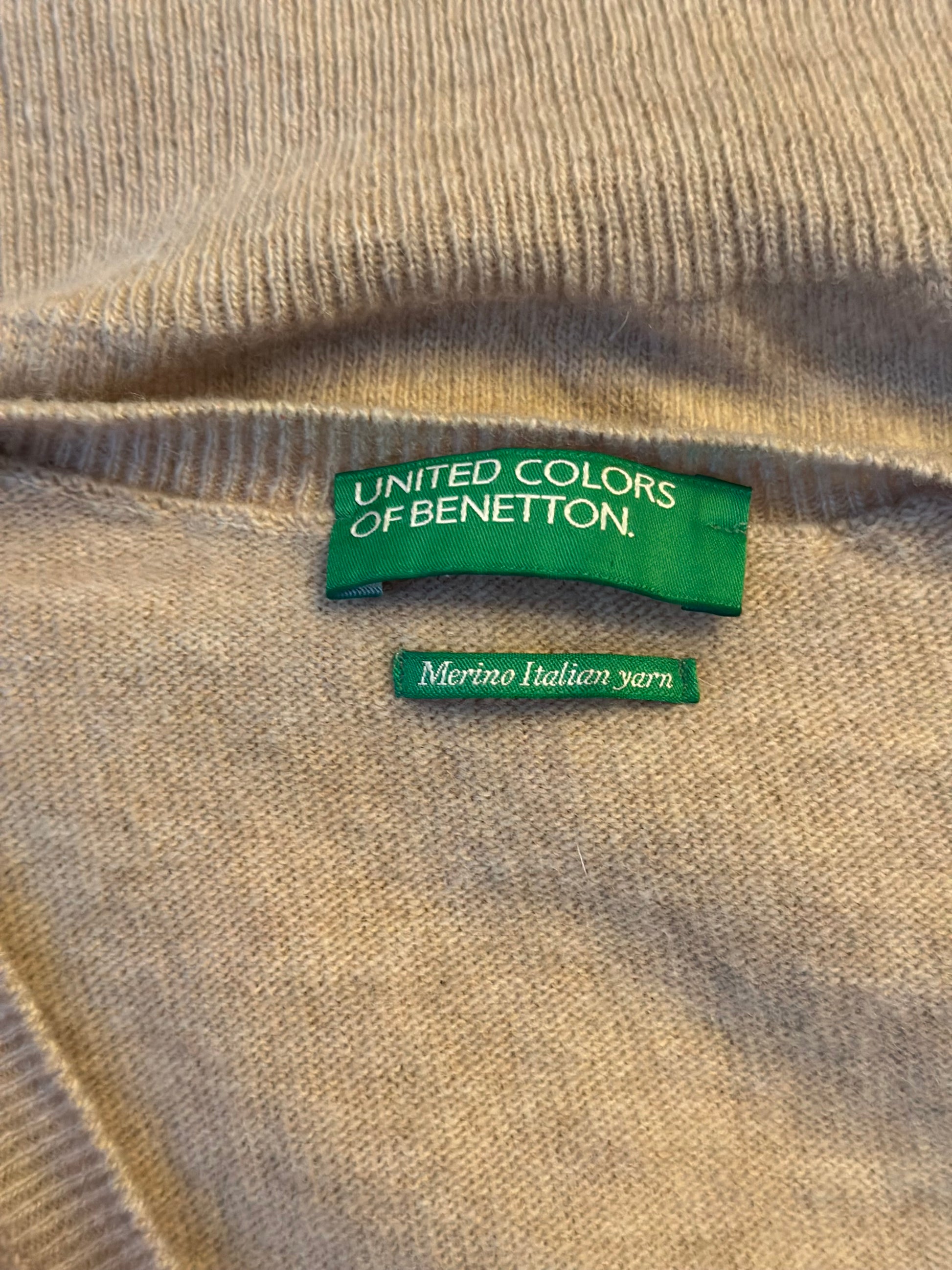Pull doux et élégant signé Benetton, confectionné en laine mérinos italienne. Coloris beige clair, col V légèrement échancré, coupe droite et finitions côtelées pour un tombé soigné. Chaud et agréable à porter, il s’adapte aussi bien à un look décontracté qu’à une tenue plus habillée. En très bon état, sans défaut.