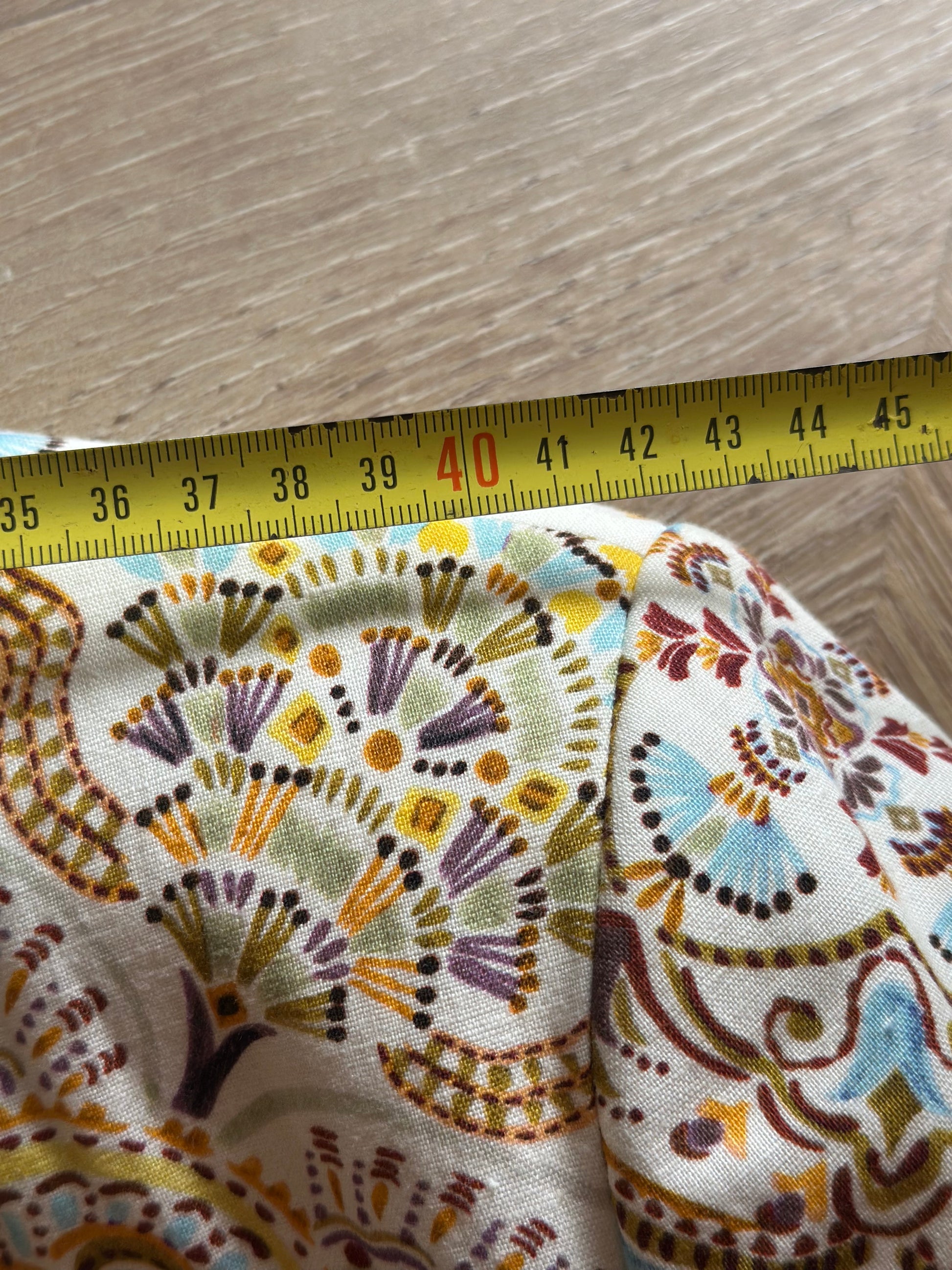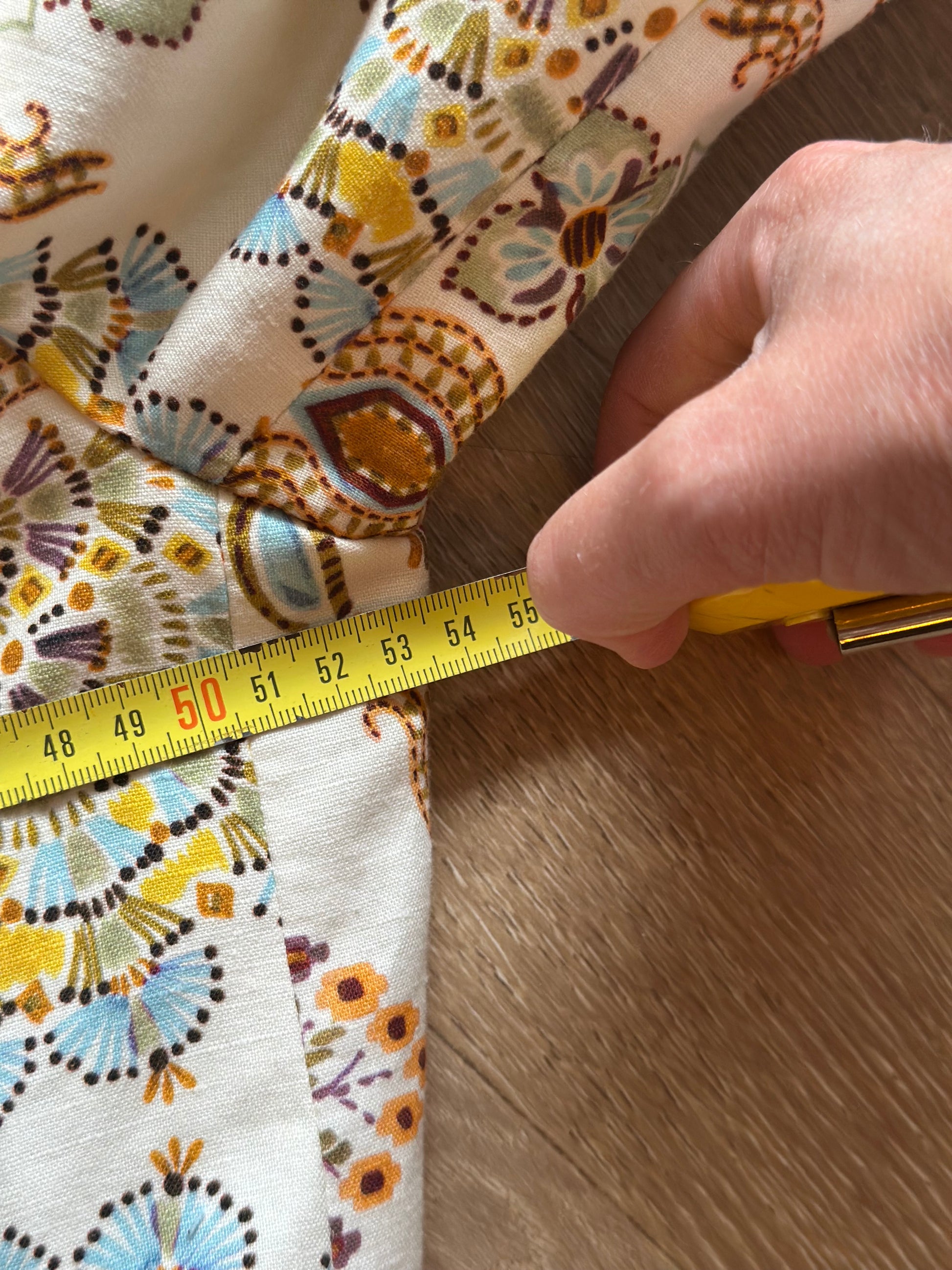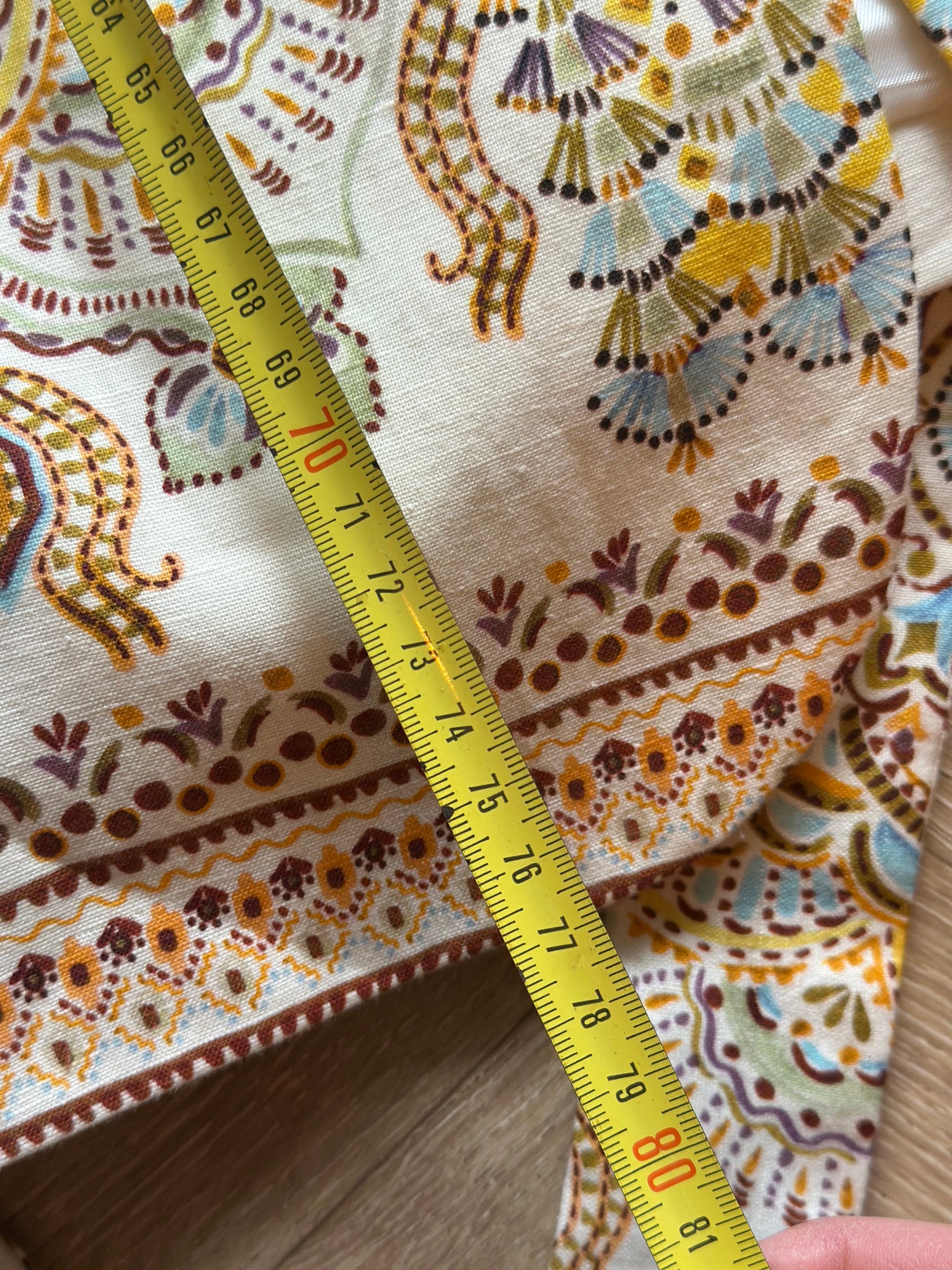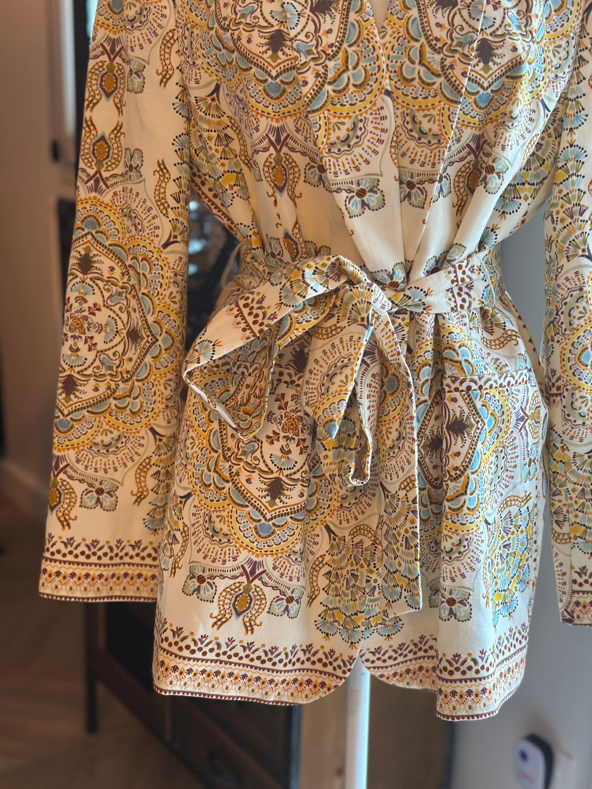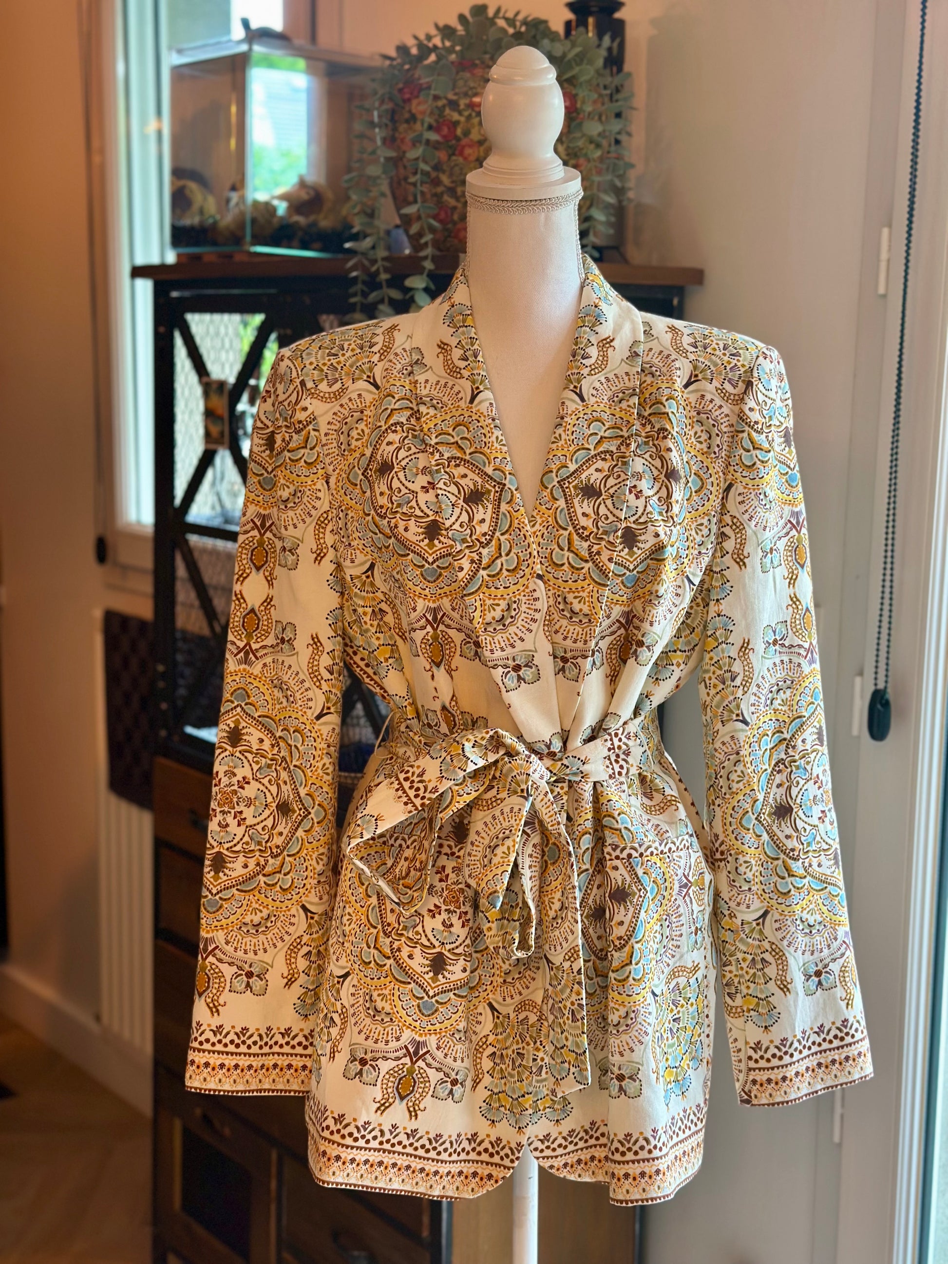 Veste à l’imprimé ethnique dans les tons beige, ocre et bleu, coupe droite avec col châle et ceinture assortie à nouer à la taille pour une silhouette féminine et élégante. Tissu fluide et légèrement satiné, agréable à porter. Idéale pour un style chic et bohème à la mi-saison. En très bon état, sans défaut. Taille bien, mesures en photos.