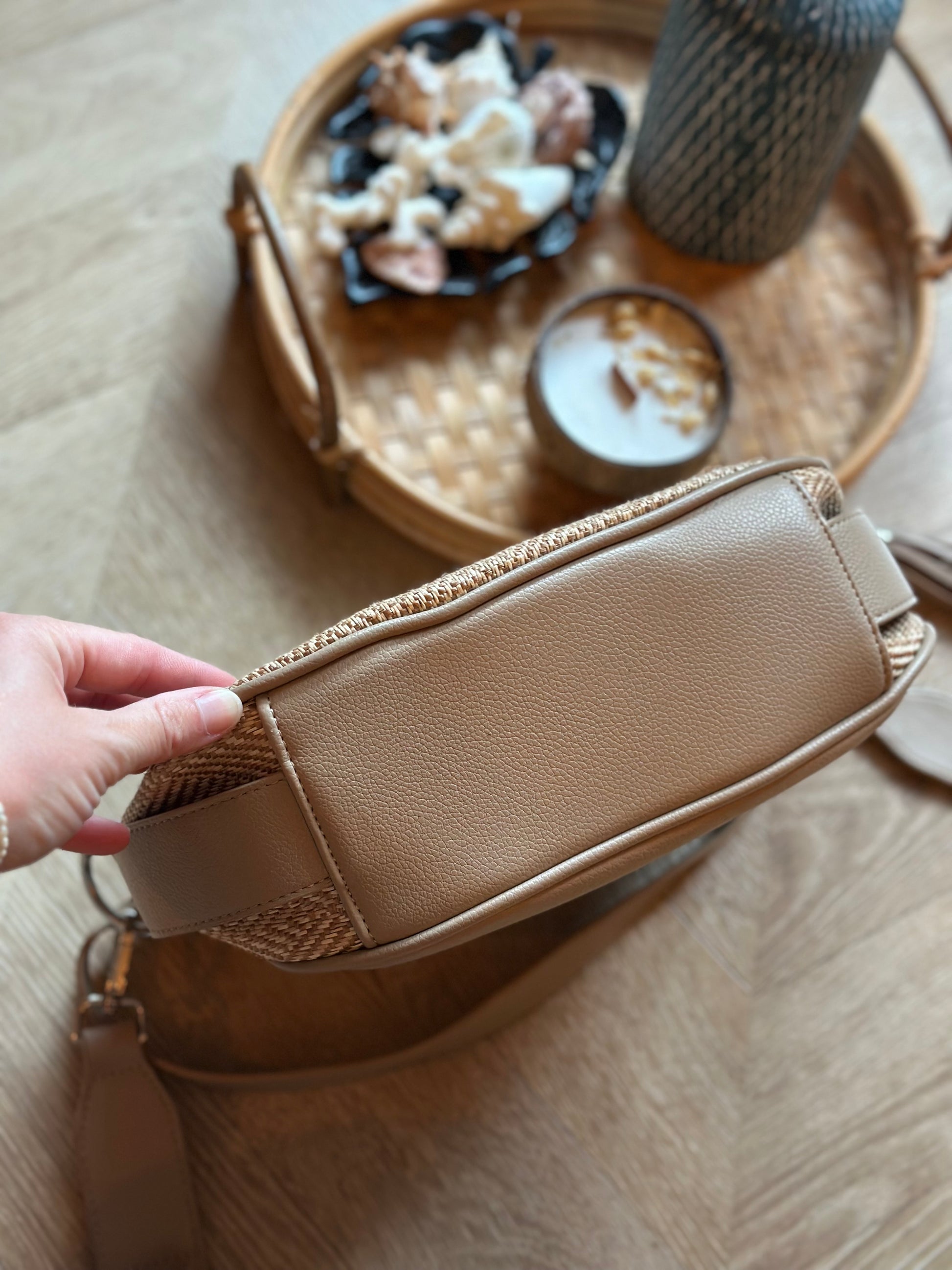 Sac à bandoulière Les Petites Bombes modèle Armel, en simili cuir beige, au format trotteur compact et élégant. Fermeture par rabat et zip, une poche plaquée à l’avant sous le rabat, une poche zippée au dos, et un compartiment principal avec poches intérieures (plaquée et zippée). Bandoulière réglable et amovible, avec anse également amovible pour un porté main ou épaule. Dimensions : 25 x 19 x 8 cm. Modèle pratique, chic et facile à assortir. En parfait état, comme neuf. Prix d’achat 65 €.