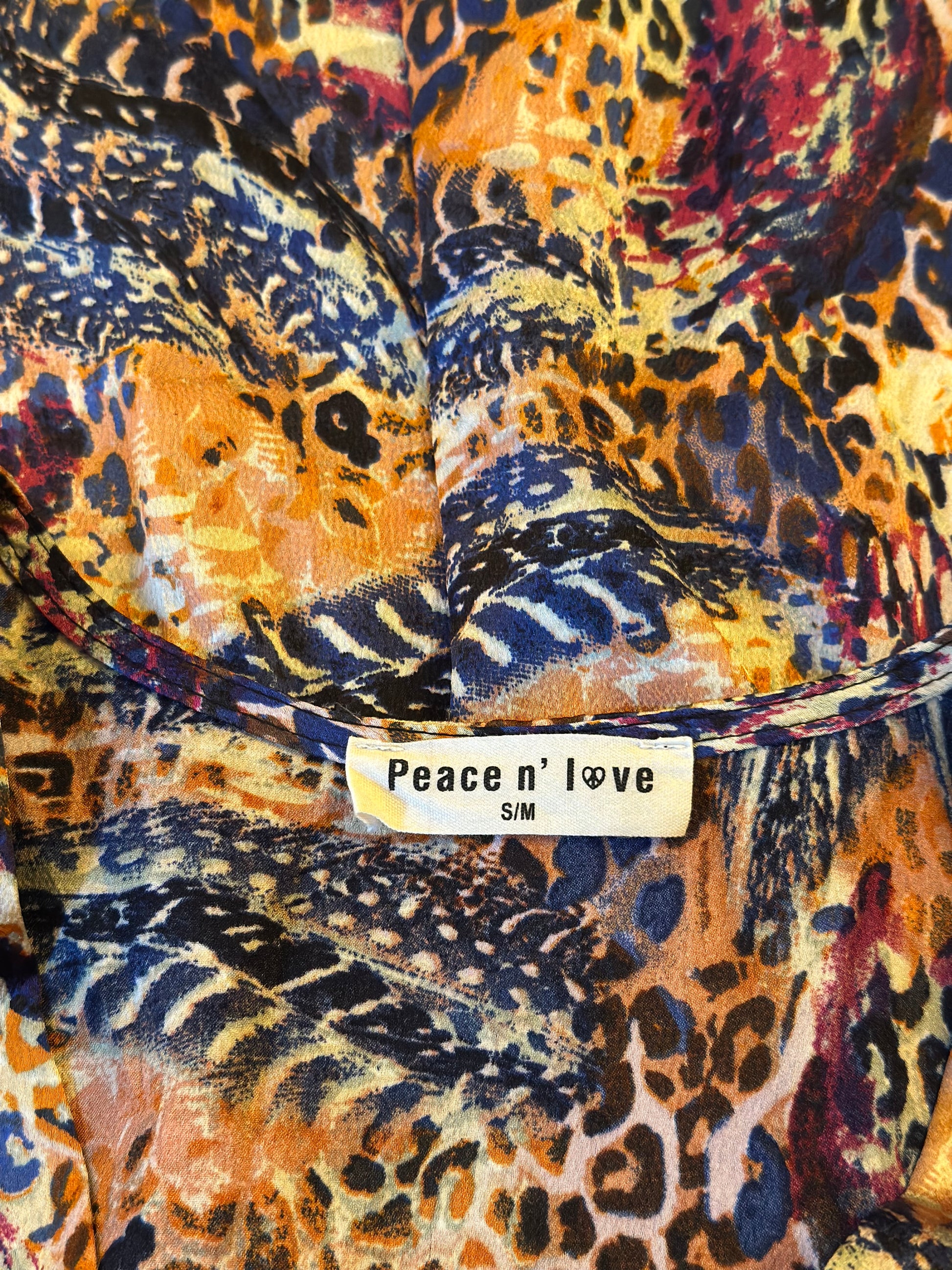 Jolie robe fluide Peace n’Love aux tons colorés, au style bohème et féminin. Décolleté en V croisé avec petite pression, manches longues à poignets élastiqués et taille marquée par un élastique avec ceinture assortie à boucle. Longueur 93 cm. Confectionnée en 100 % polyester, légère et agréable à porter. En très bon état, aucun défaut à signaler.