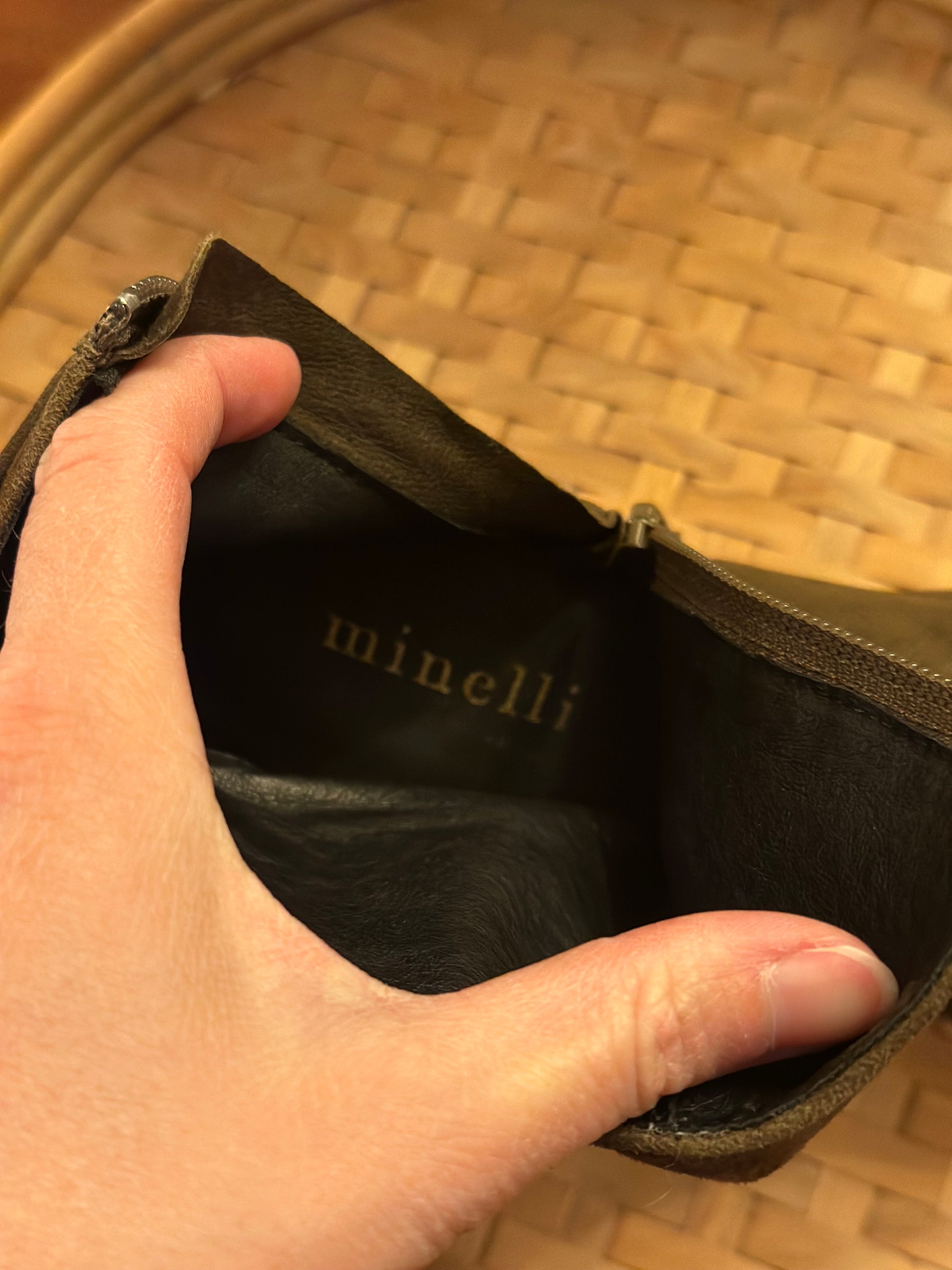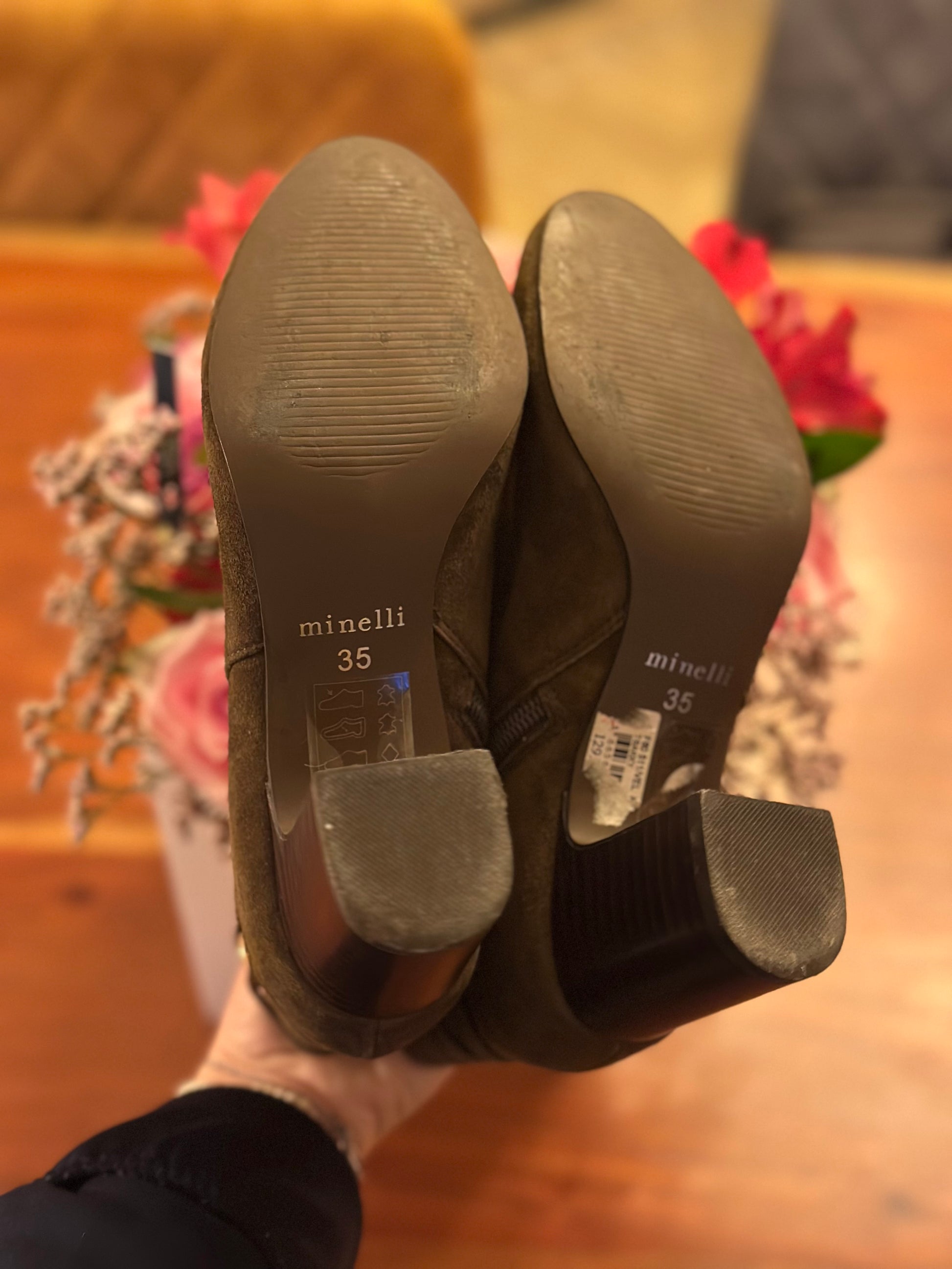 Bottines en daim cuir véritable, couleur marron-kaki, taille 35 (taillent bien). Talon bloc confortable d’environ 7 cm, fermeture zippée sur le côté, détail brides et boucles métal pour une touche élégante. Cuir très doux, joli rendu chic et casual à la fois. Très confortables grâce au talon stable. Achat initial visible sur l’étiquette : 129€. État comme neuf avec étiquette du prix encore visible !