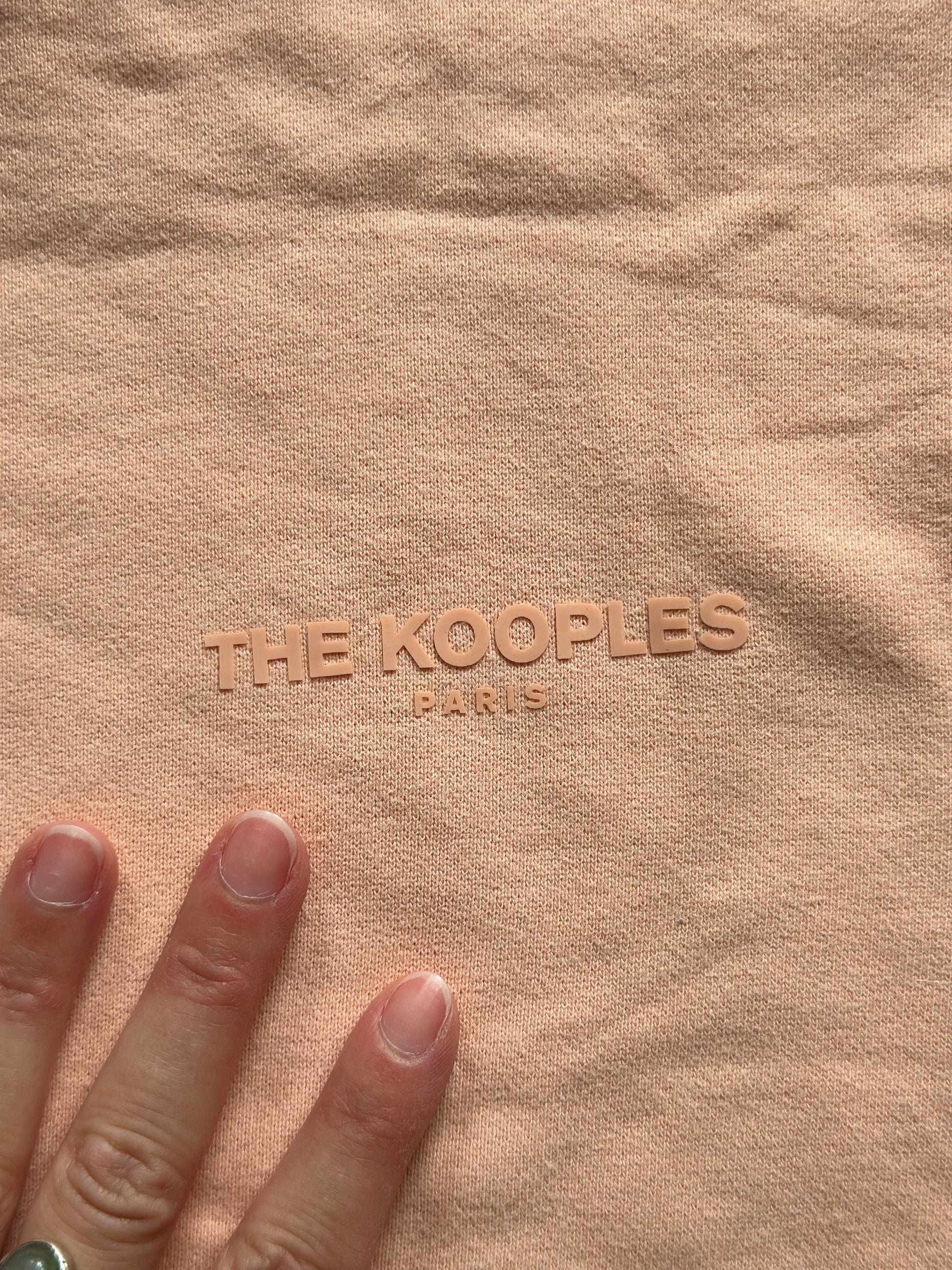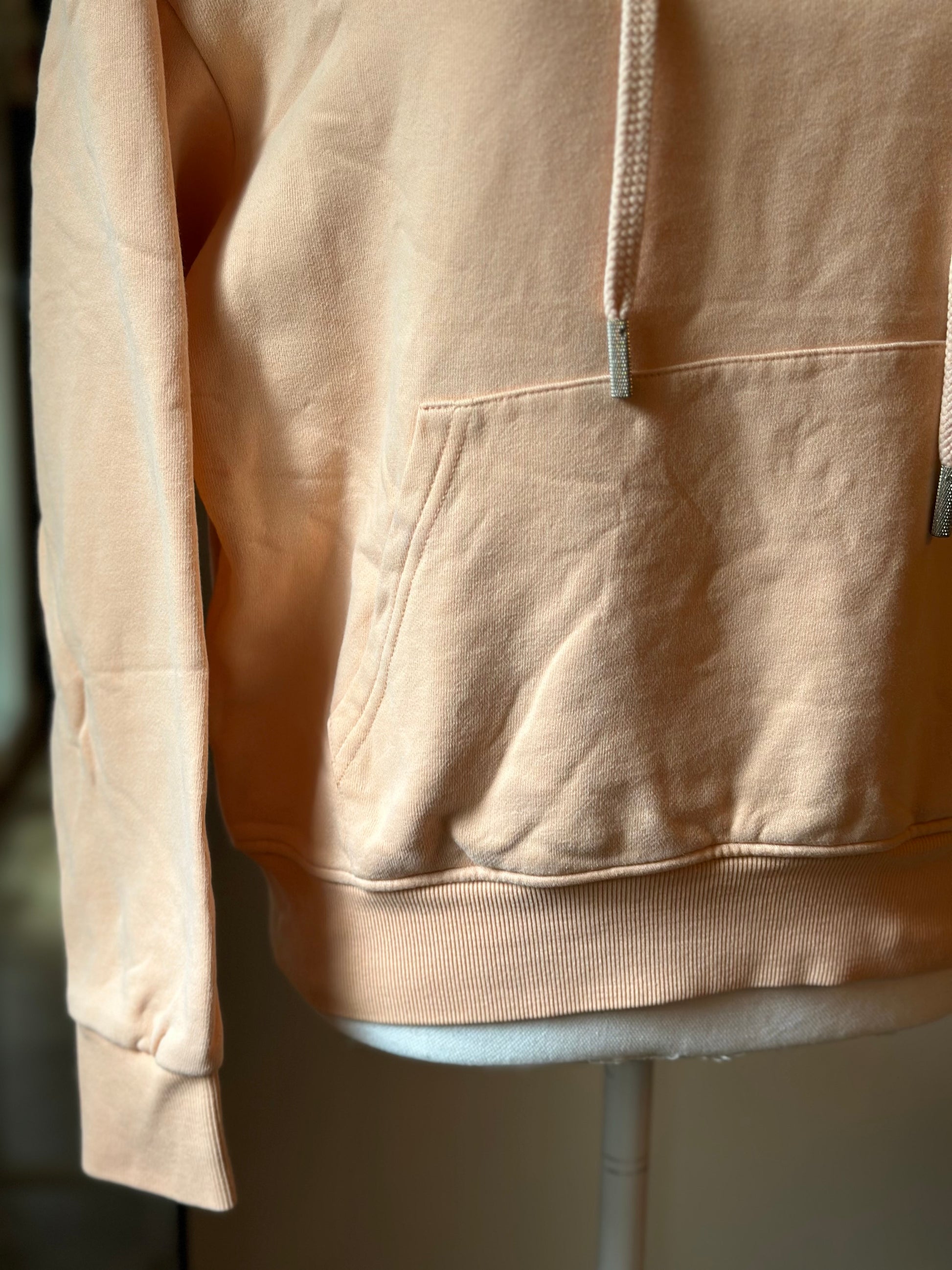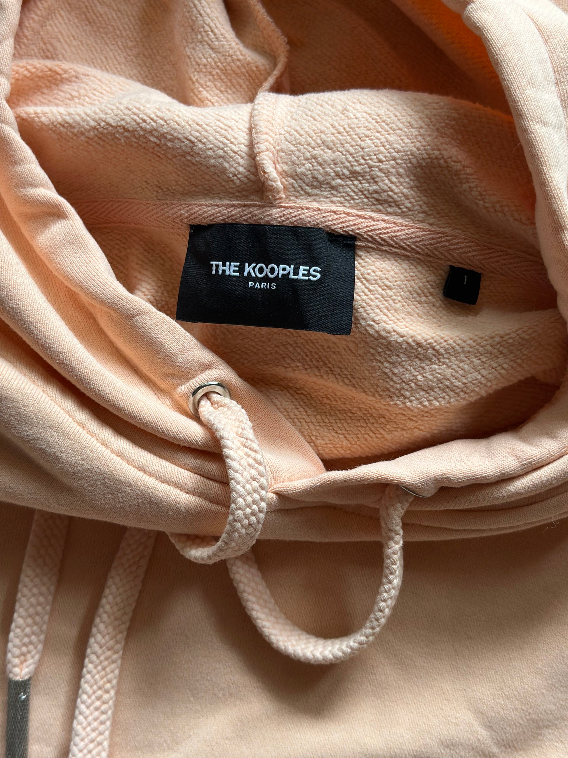 Sweat à capuche The Kooples en coton 100 %, coloris abricot (orange clair). Coupe droite décontractée avec poche kangourou, capuche à cordon de serrage et finitions côtelées aux poignets et à la base. Logo ton sur ton brodé à l'avant pour un style sobre et moderne. Pièce confortable et facile à porter, en très bon état sans défaut. Prix d’achat 175€.
