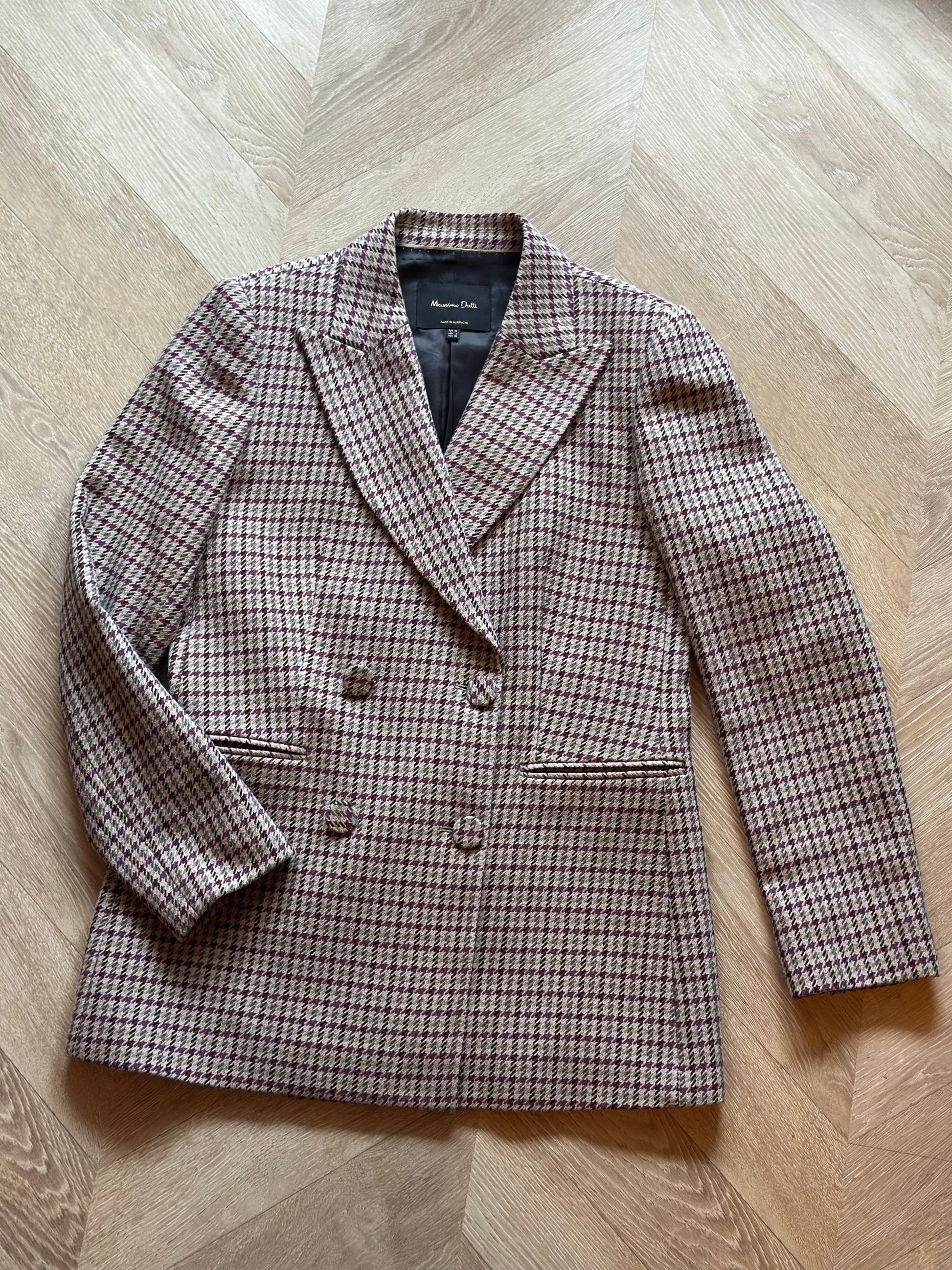Veste blazer Massimo Dutti à motif pied-de-poule dans des tons beige, bordeaux et noir. Coupe droite structurée, col à revers, double boutonnage, poches passepoilées et boutons recouverts de tissu pour une finition élégante. Entièrement doublée, elle offre un rendu chic et intemporel, idéal aussi bien pour un look professionnel que casual avec un jean. Taille indiquée 40 mais convient parfaitement à un 38 (mesures : longueur 70 cm, aisselle 48 cm, épaule 39 cm). Composition : 52 % coton, 34 % laine, 10 % polyester. Très bon état, aucune trace d’usure.