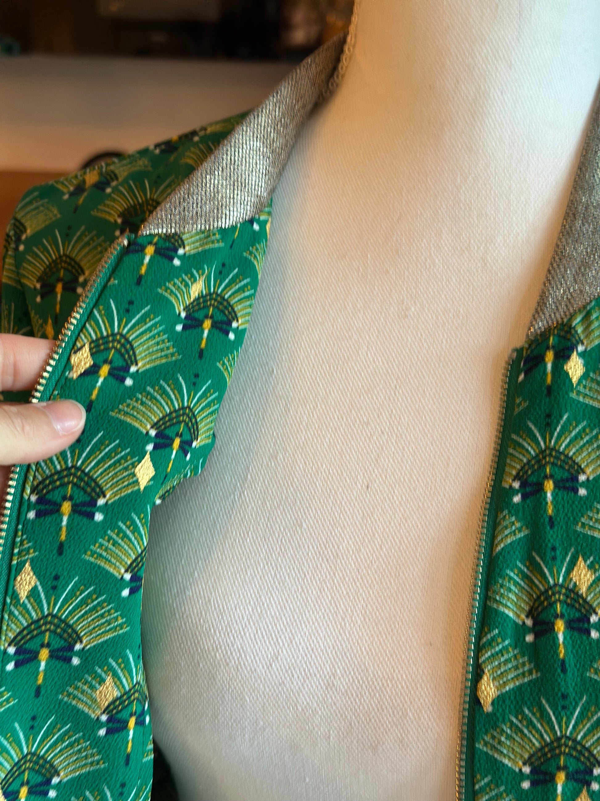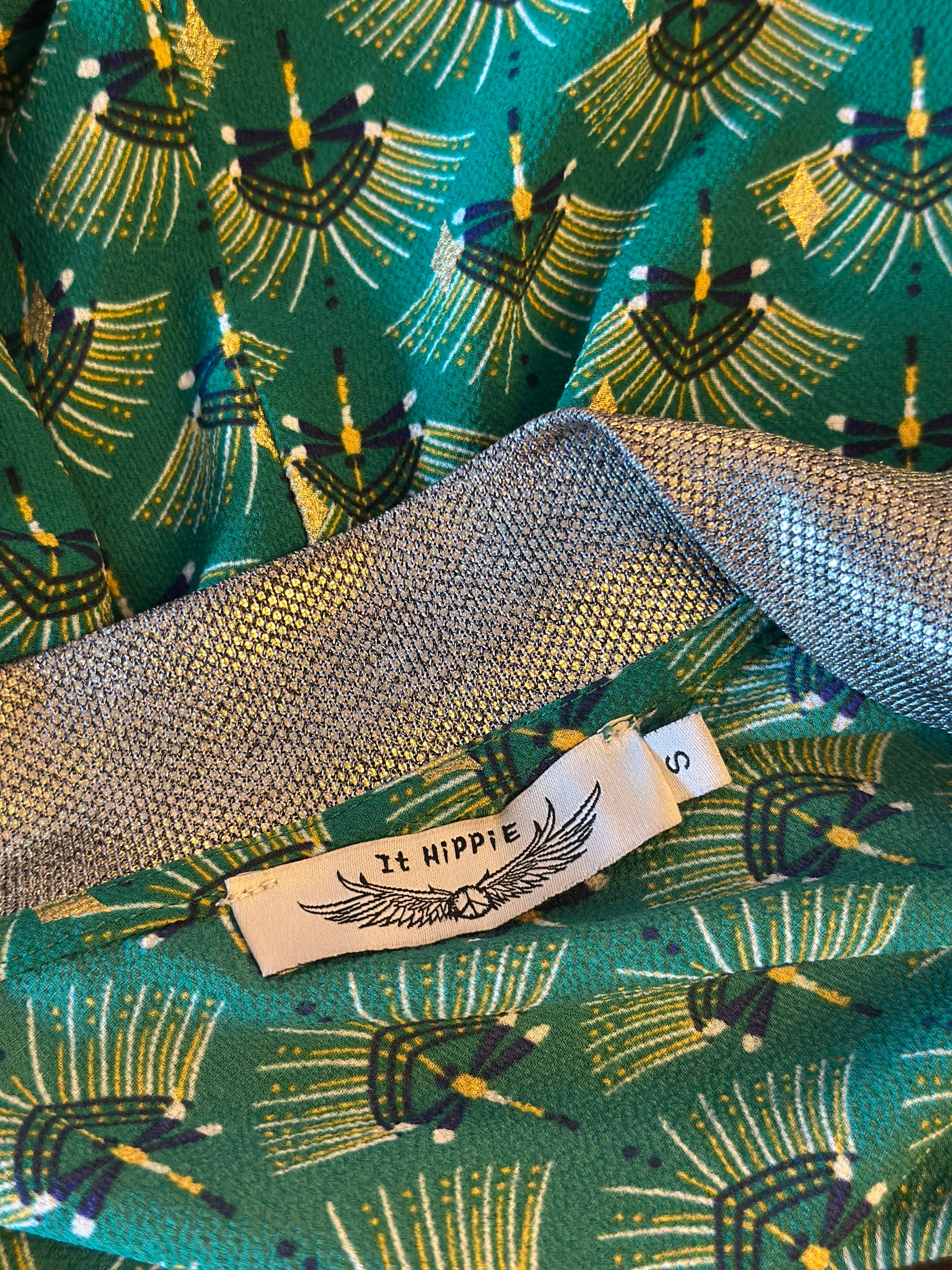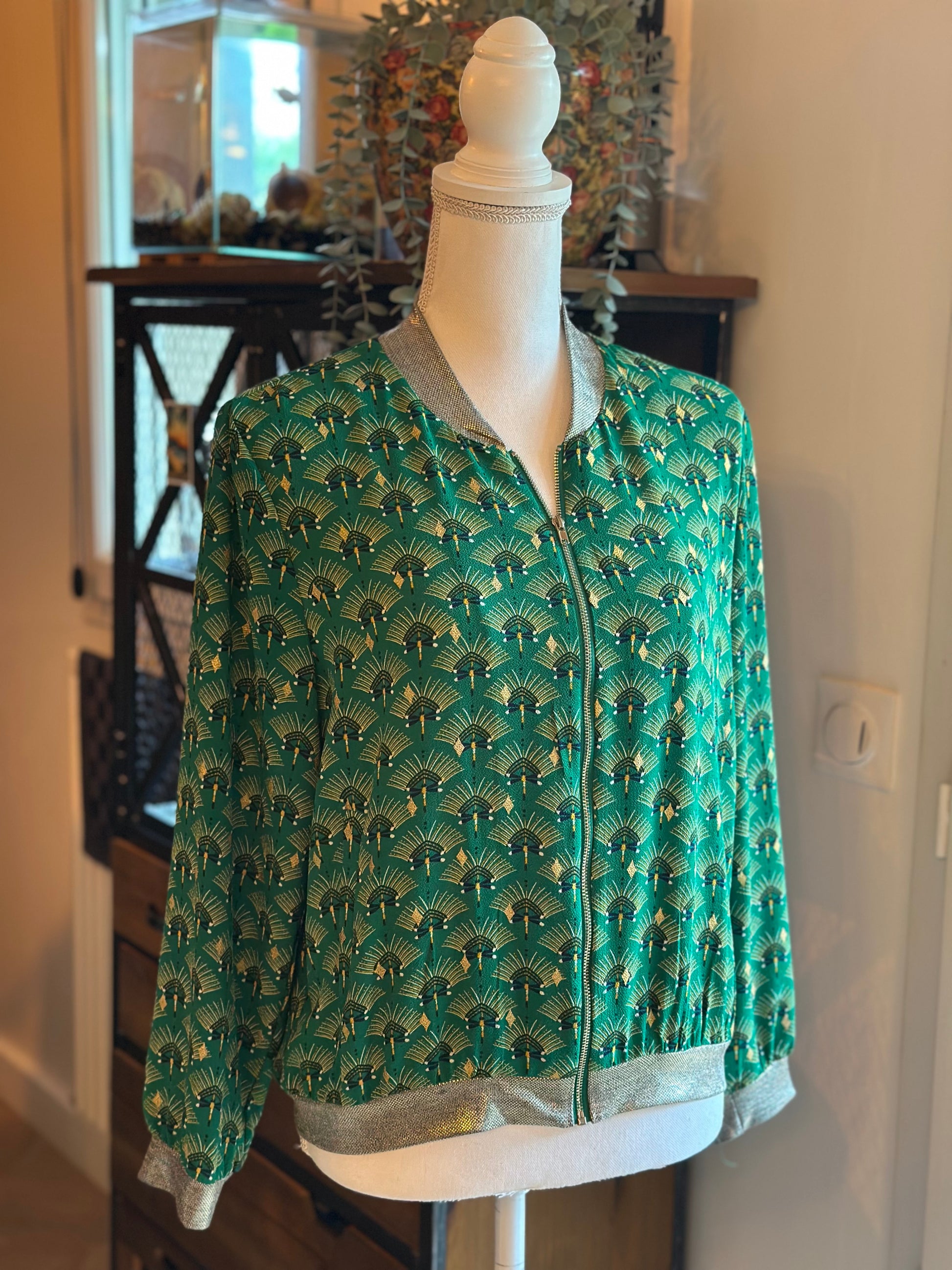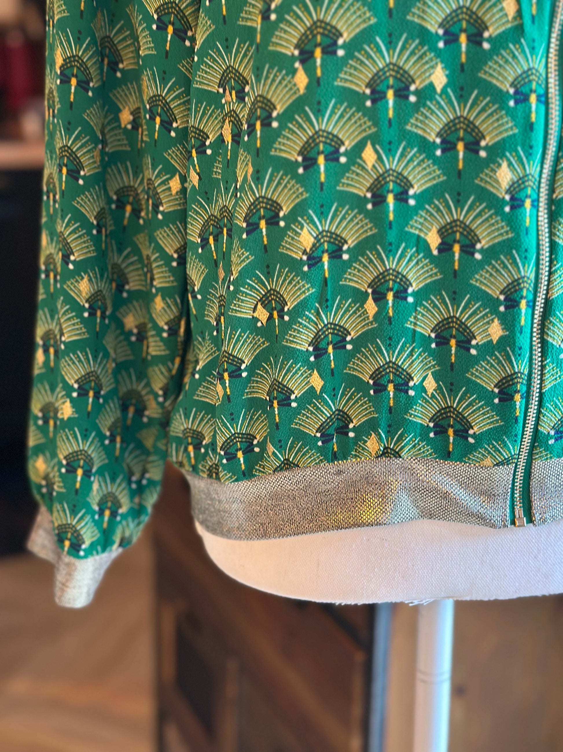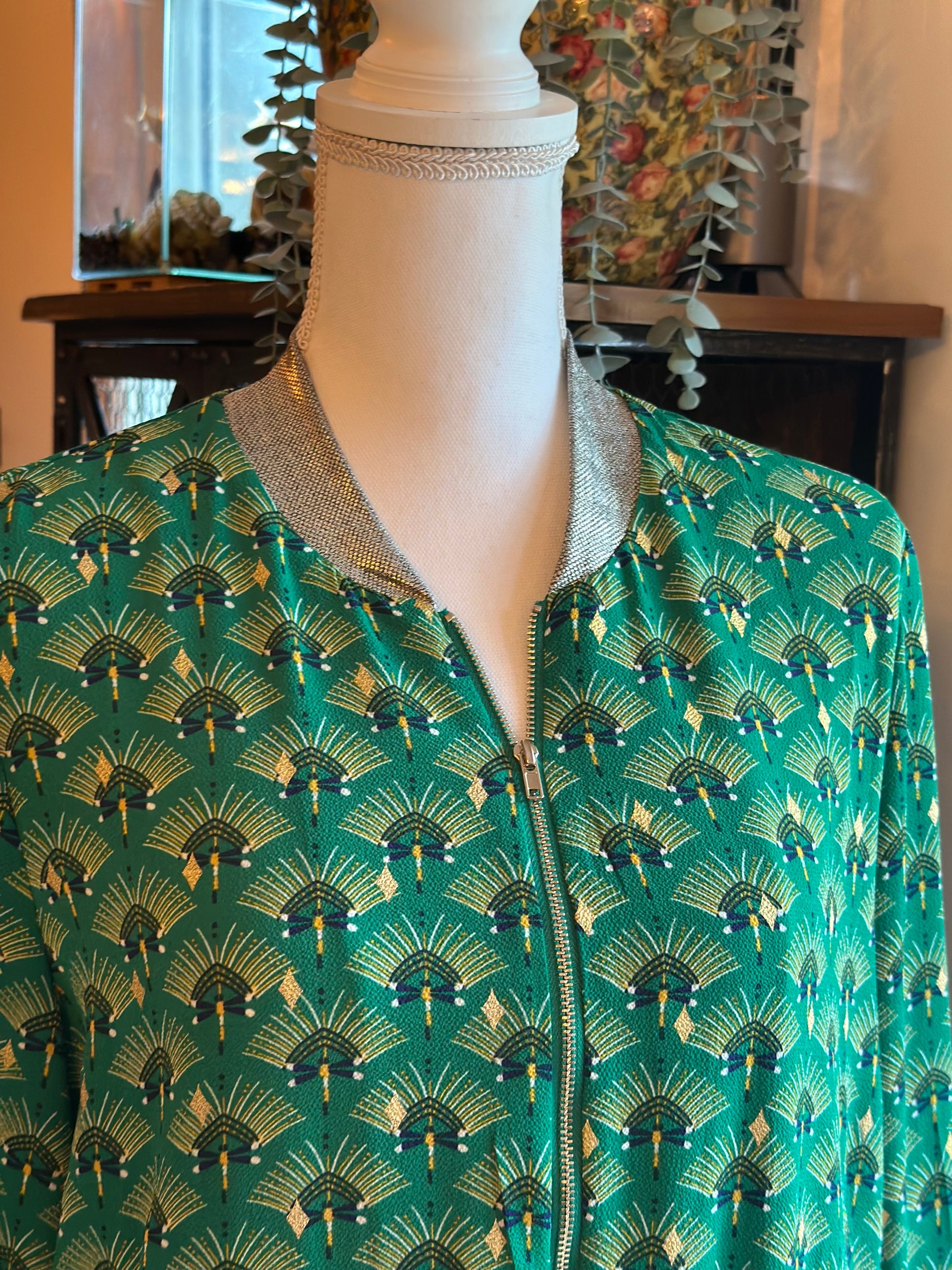 Veste It Hippie en polyester (100 %), au motif géométrique vert et doré. Coupe droite façon bomber, col rond et bords-côtes argentés au col, poignets et bas de vêtement. Fermeture zippée dorée à l’avant, doublure fine pour plus de confort. Style original et lumineux, parfait pour un look casual chic. Très bon état, porté avec soin.